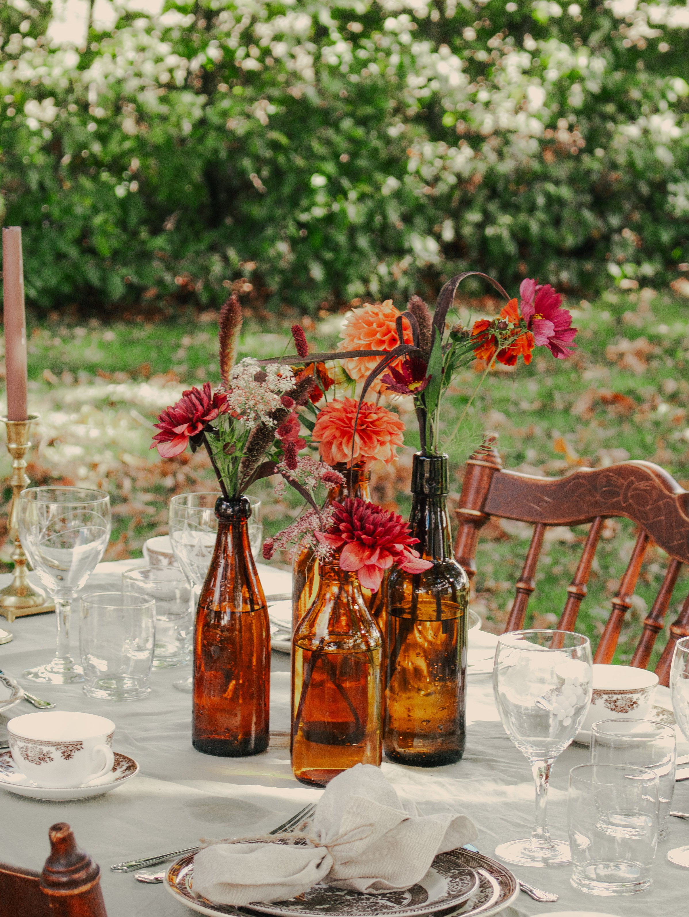 Bruna glasflaskor i olika storlek och form. Fina att ha som blomvas eller som ljushållare.