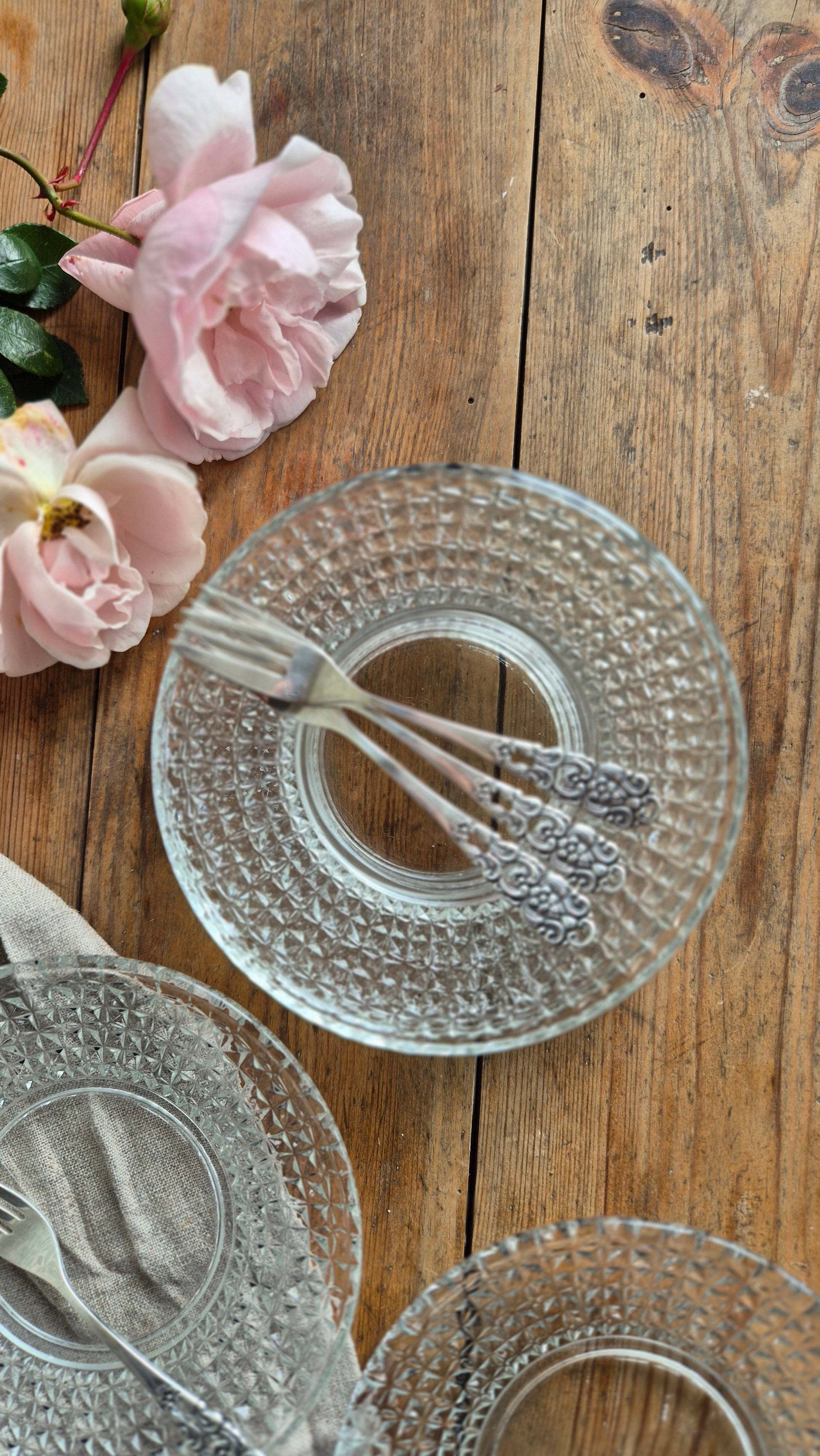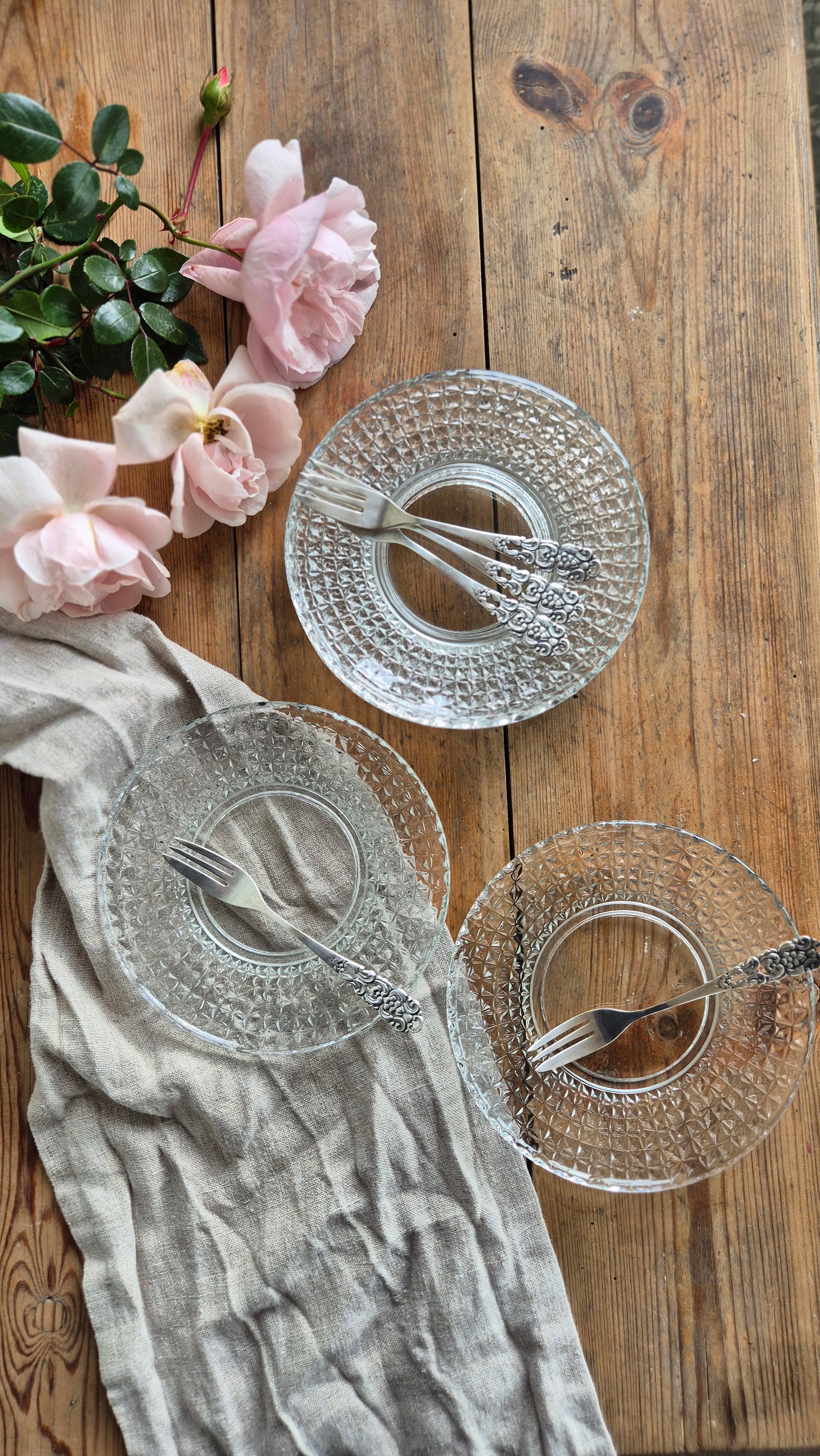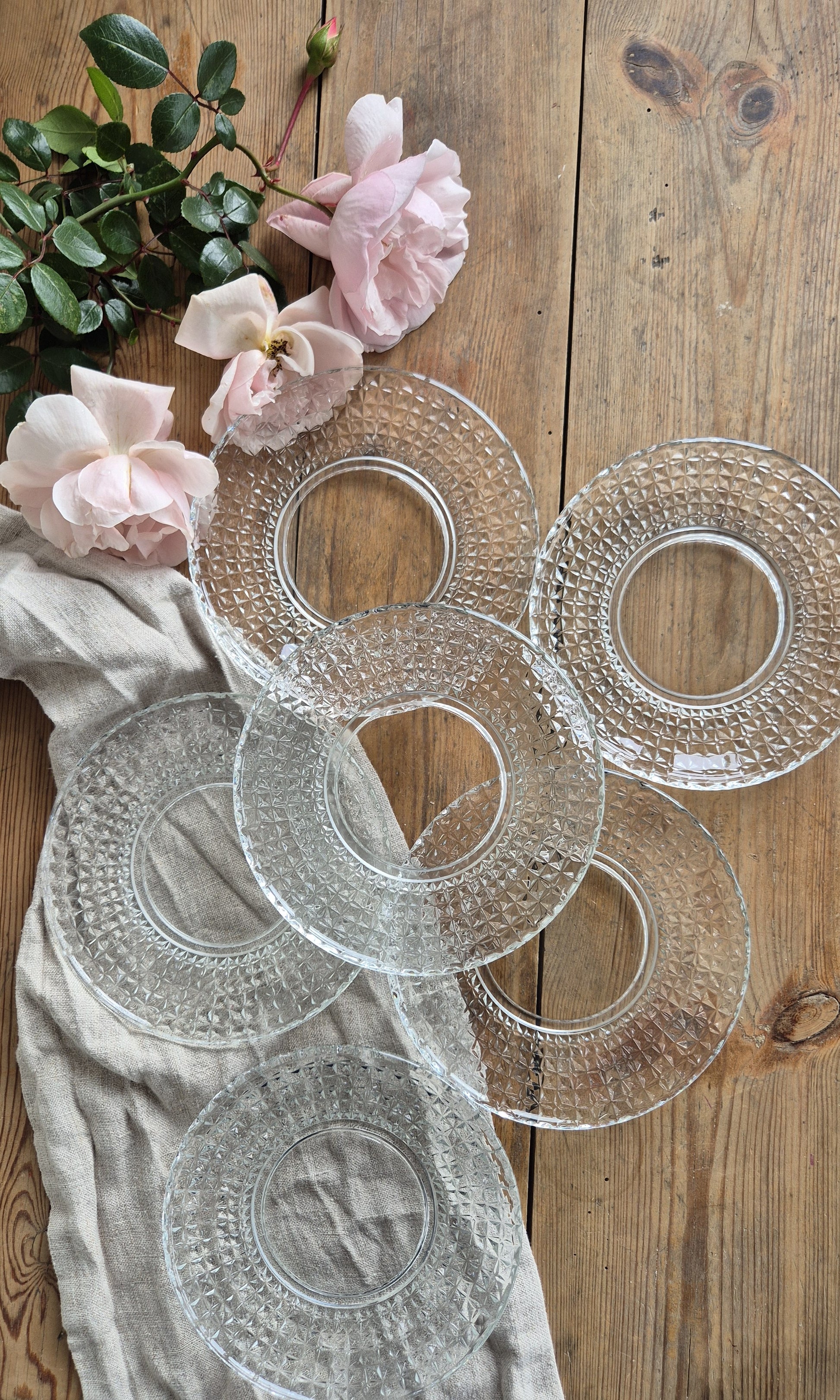 Vackra assietter i glas Fint skick. Säljs som ett set med sex stycken.