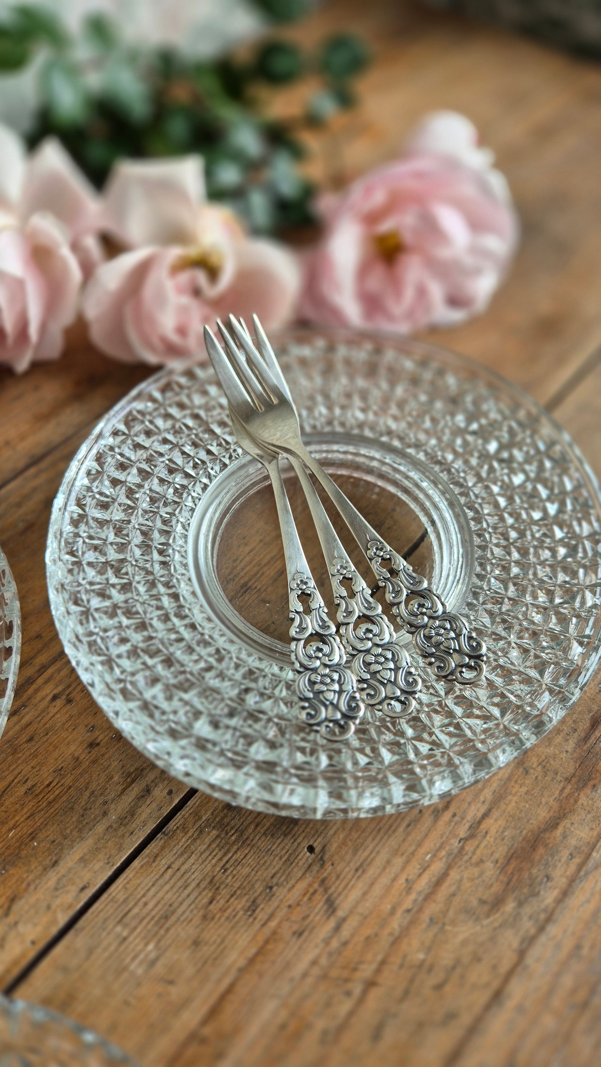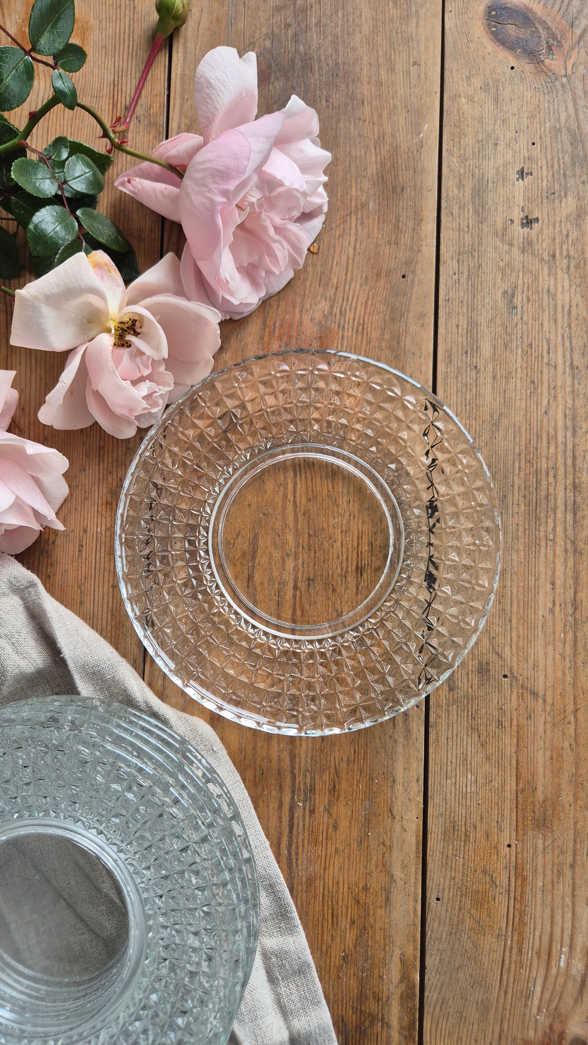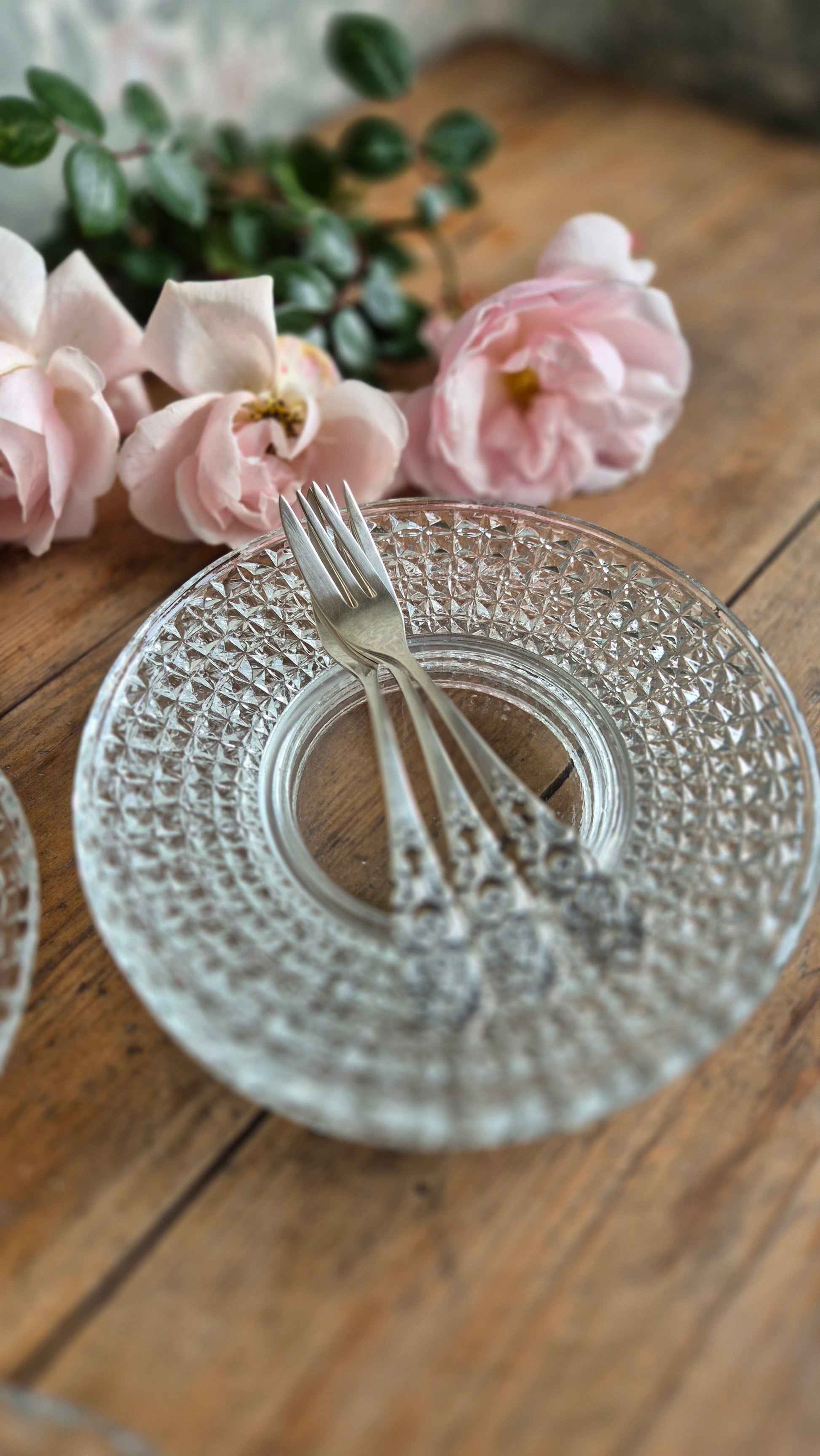 Vackra assietter i glas Fint skick. Säljs som ett set med sex stycken.