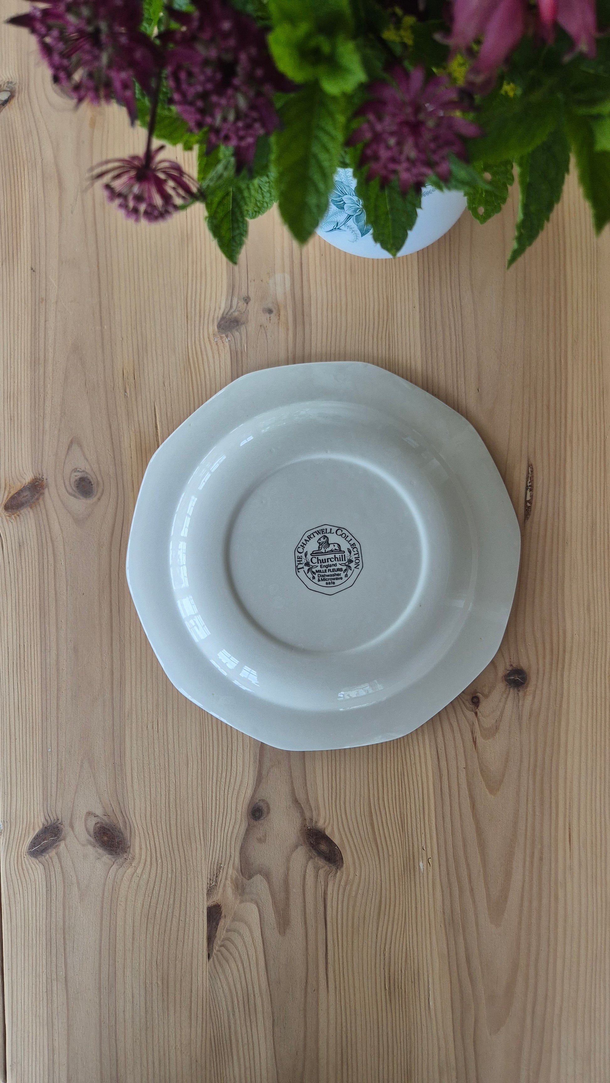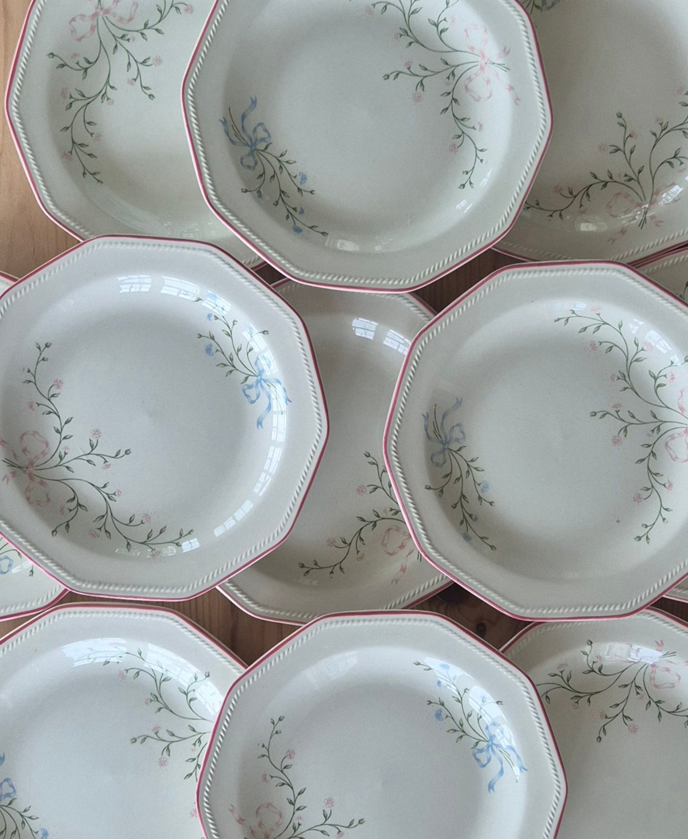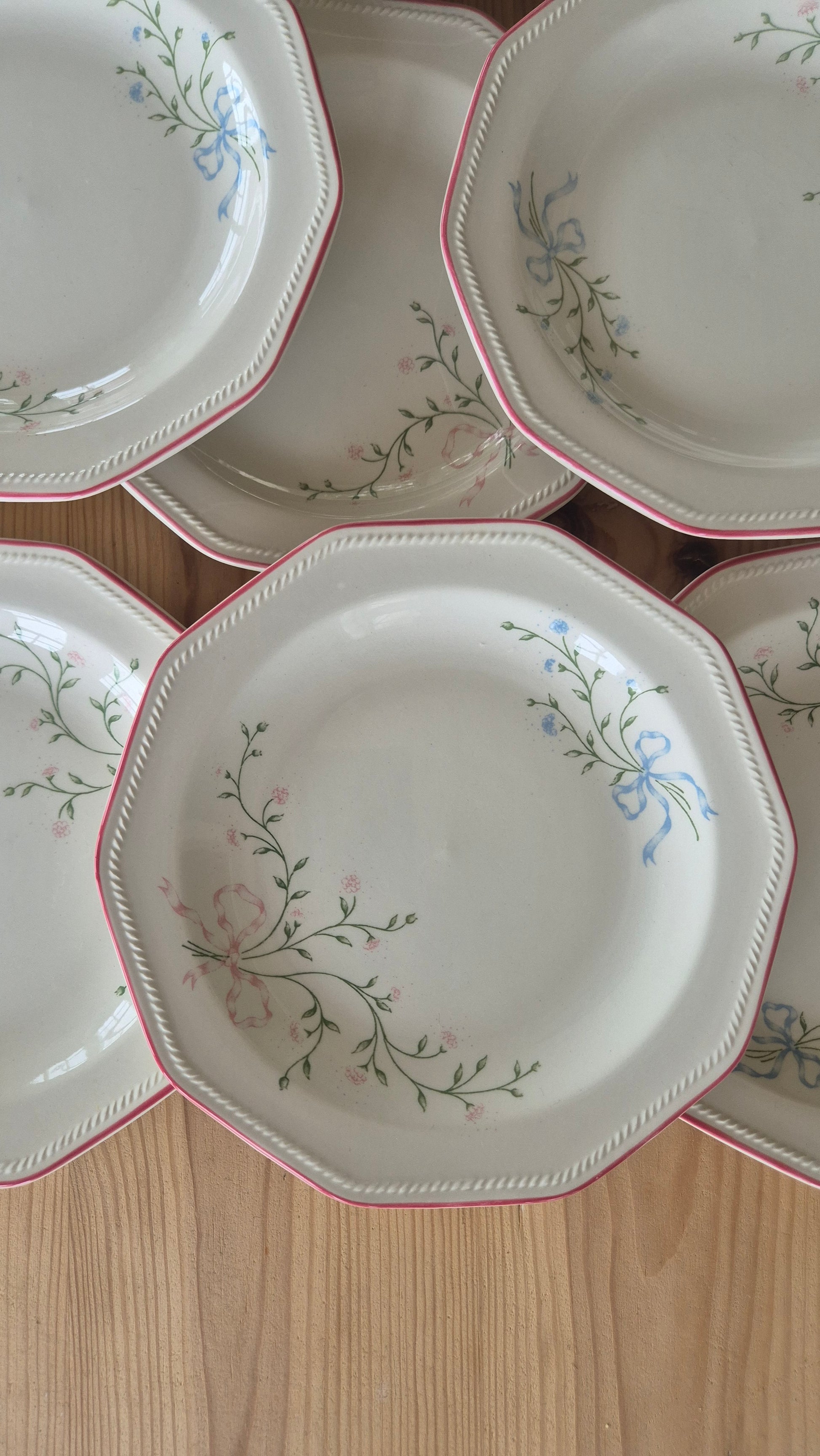 Assiett med rosa kant och rosett i pudrig rosa och blå. Ljuvliga att duka upp med till sommarens kalas. Märket är Engelska Churchill. Finns fler delar i samma serie. Fint skick. Säljs styckvis. Välj hur många du önskar.