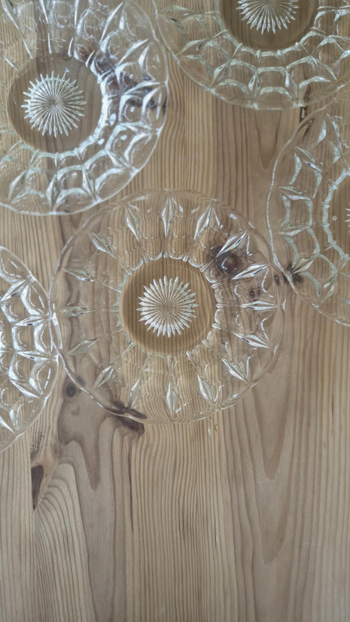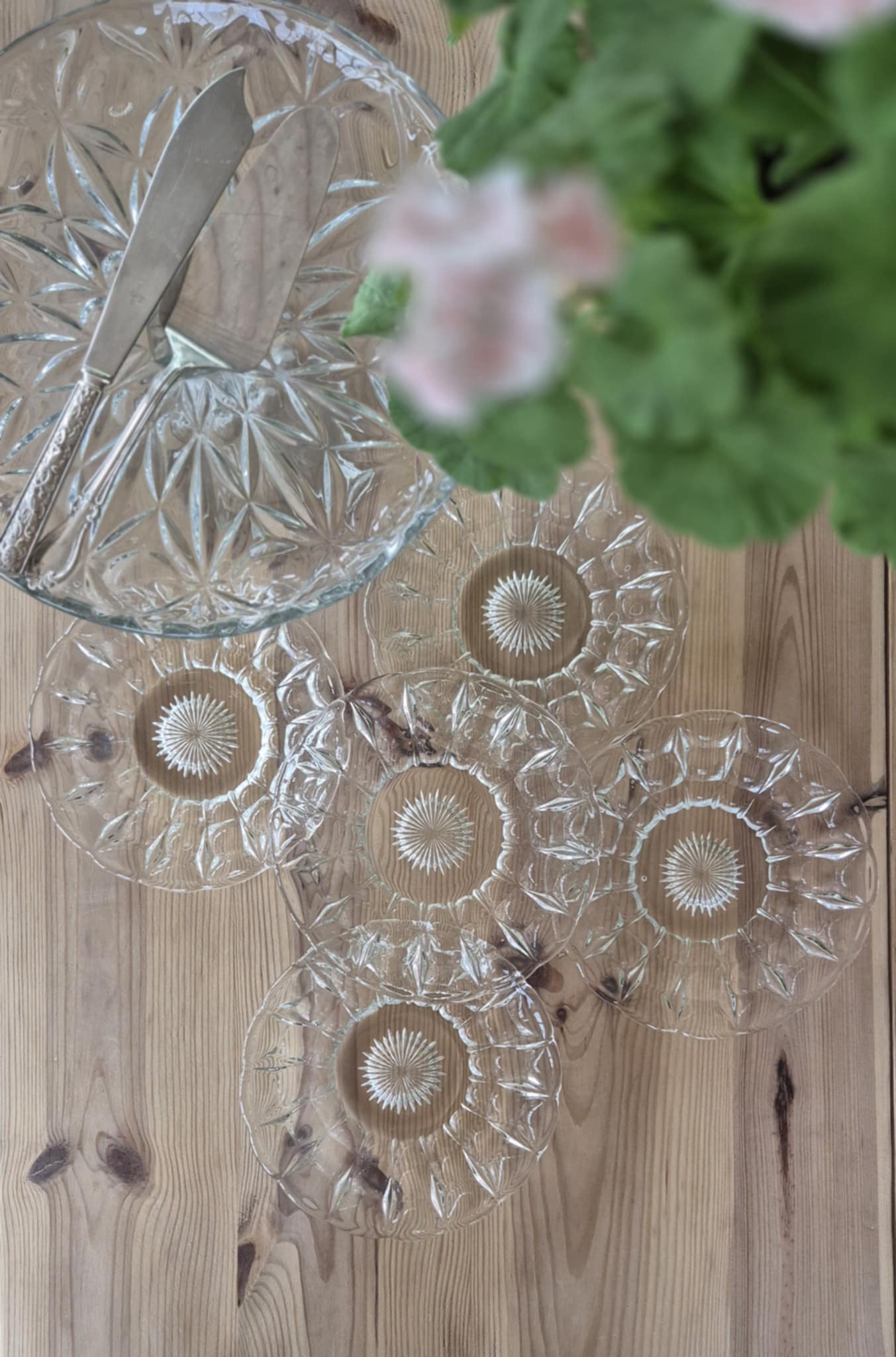 Härliga assietter i mönstrat glas. Perfekt till sommarens tårtkalas. Vackra och stilrena. Fint skick, mindre bruksslitage kan förekomma. Pris för 5 stycken.