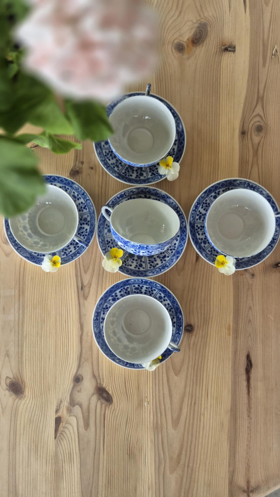 Tunna koppar i vackert blåvitt blommönster. Perfekta för både kaffe- och tedrickare. Fint skick. Pris är för 5 stycken plus ett extra fat.
