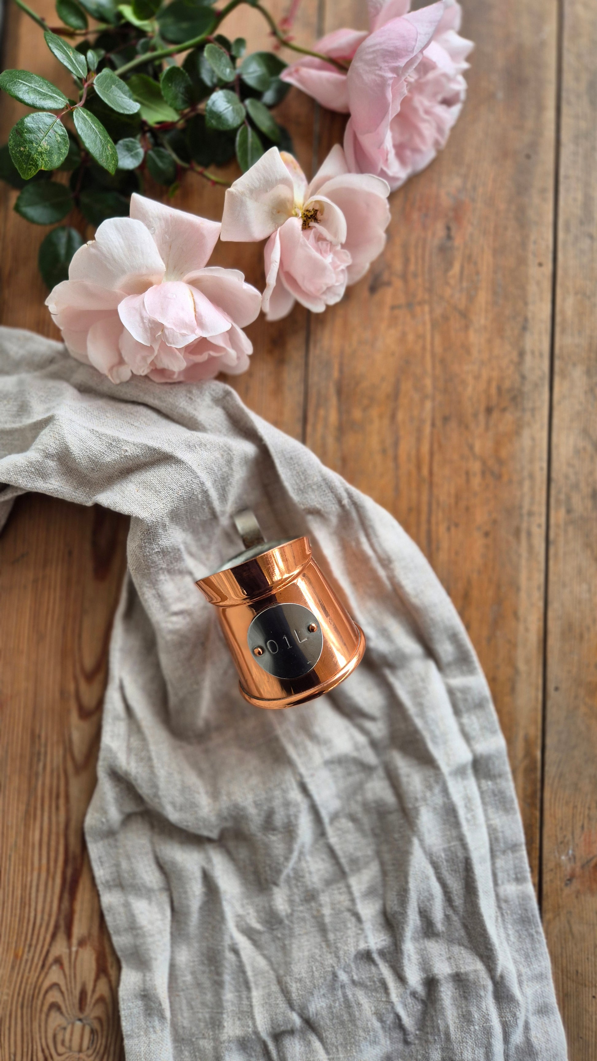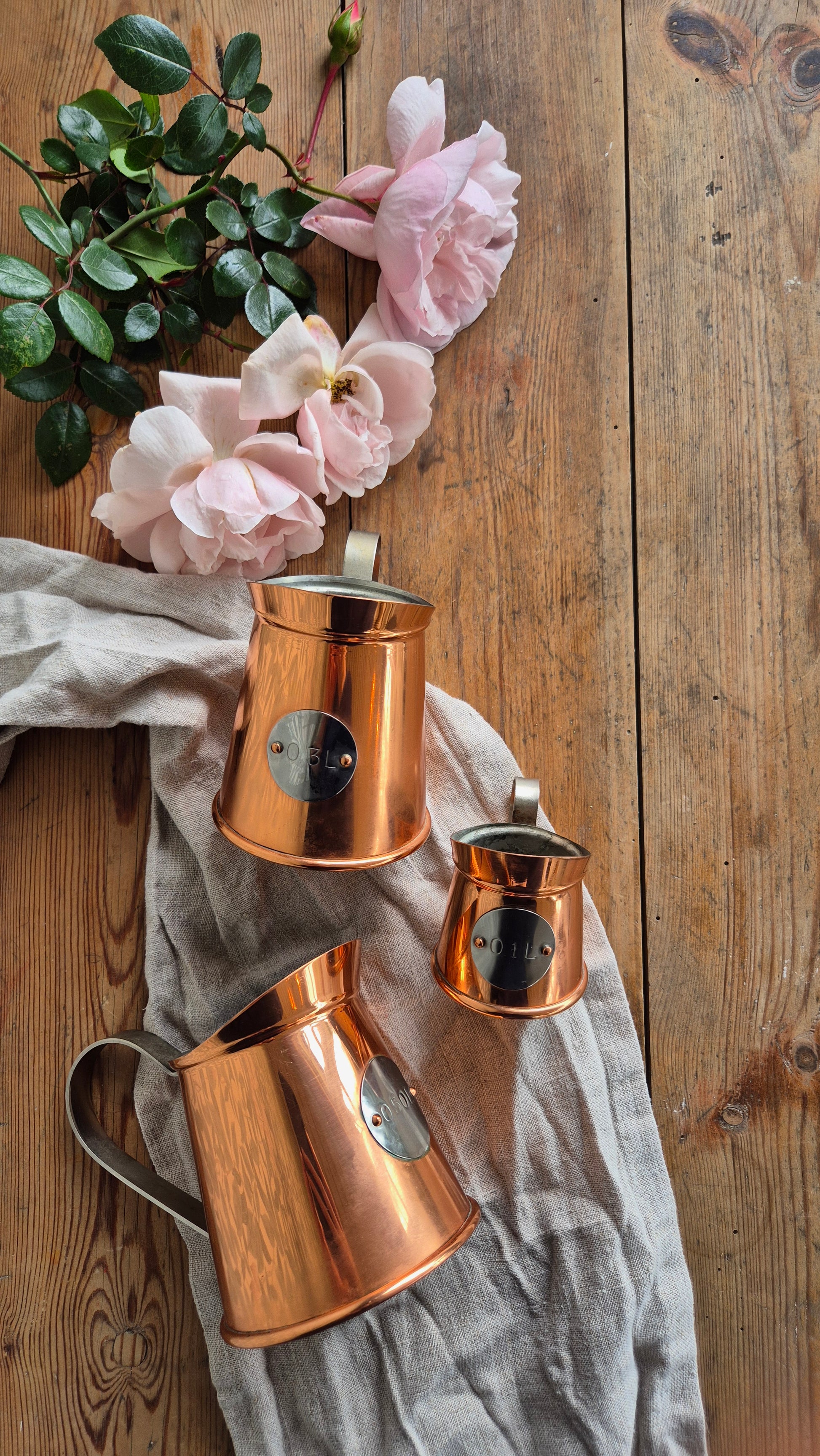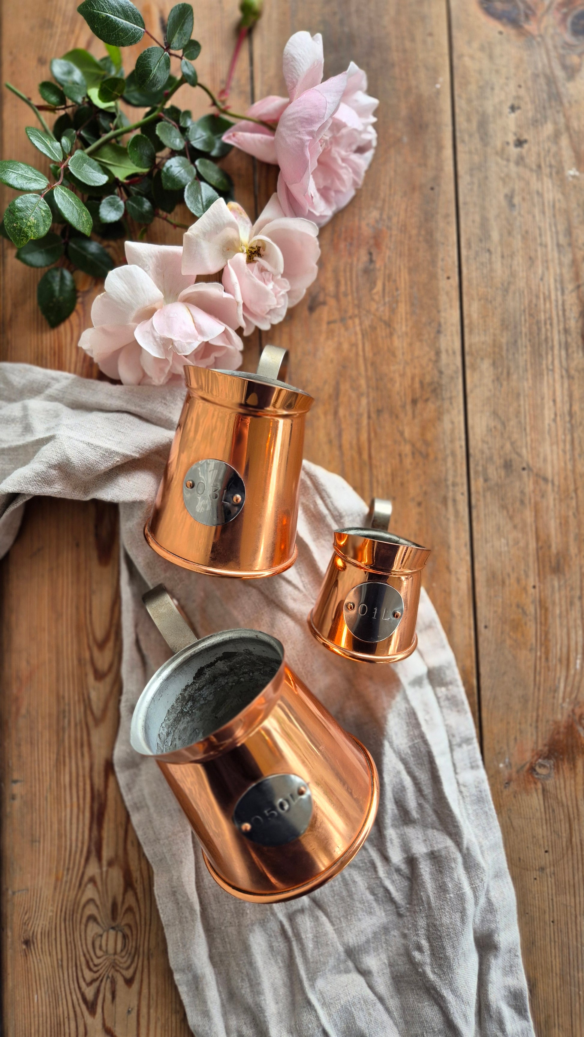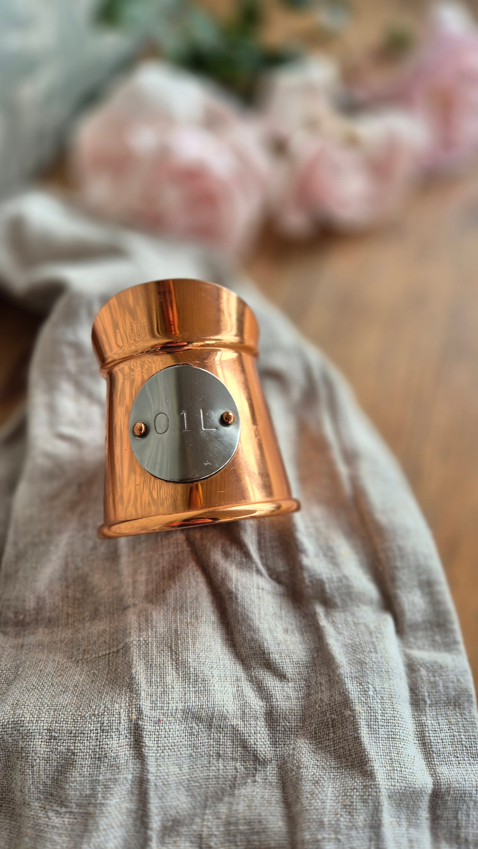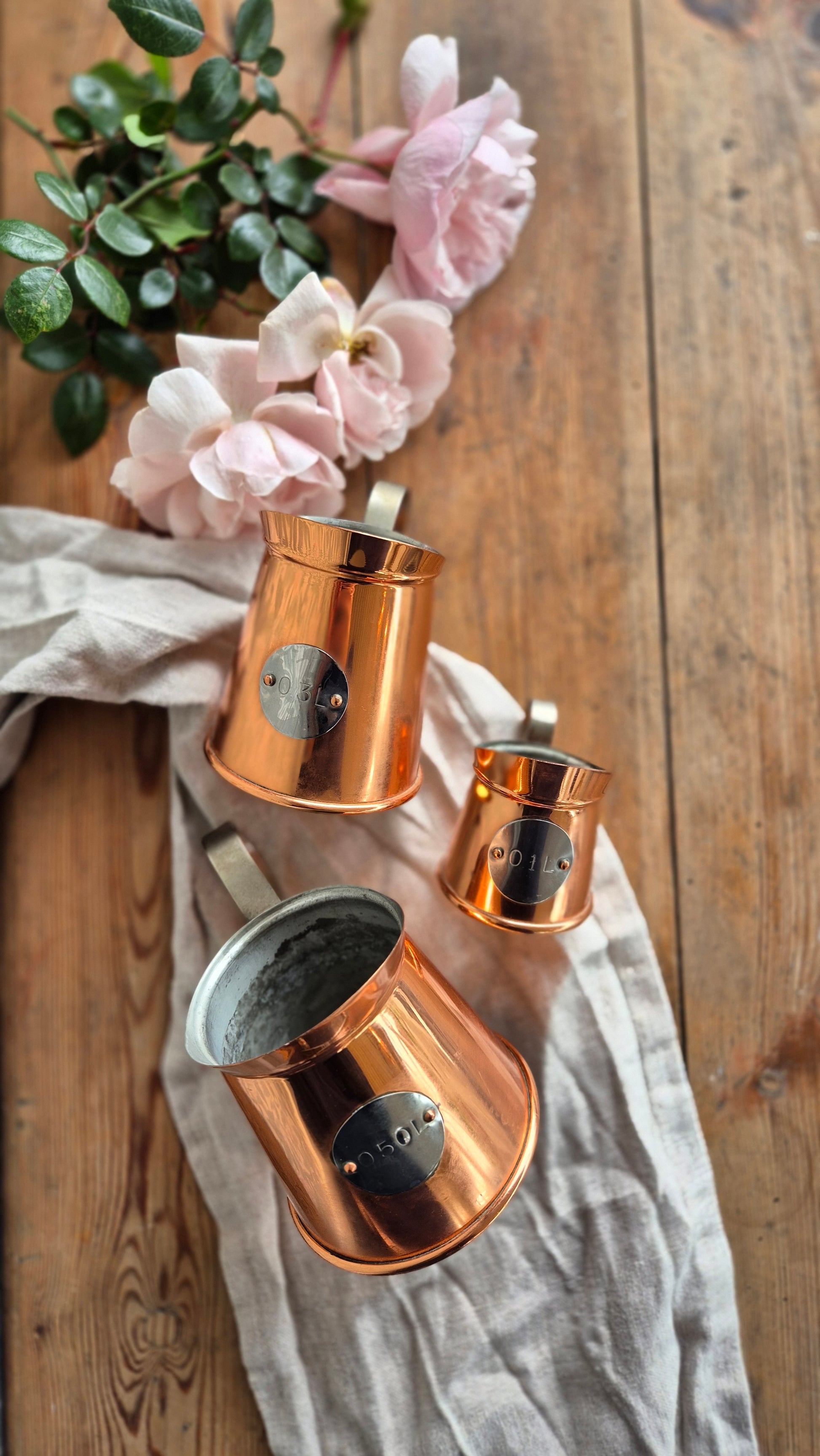 Fint decilitermått i koppar. Både praktiska och vackra detaljer till köket. Fint skick.