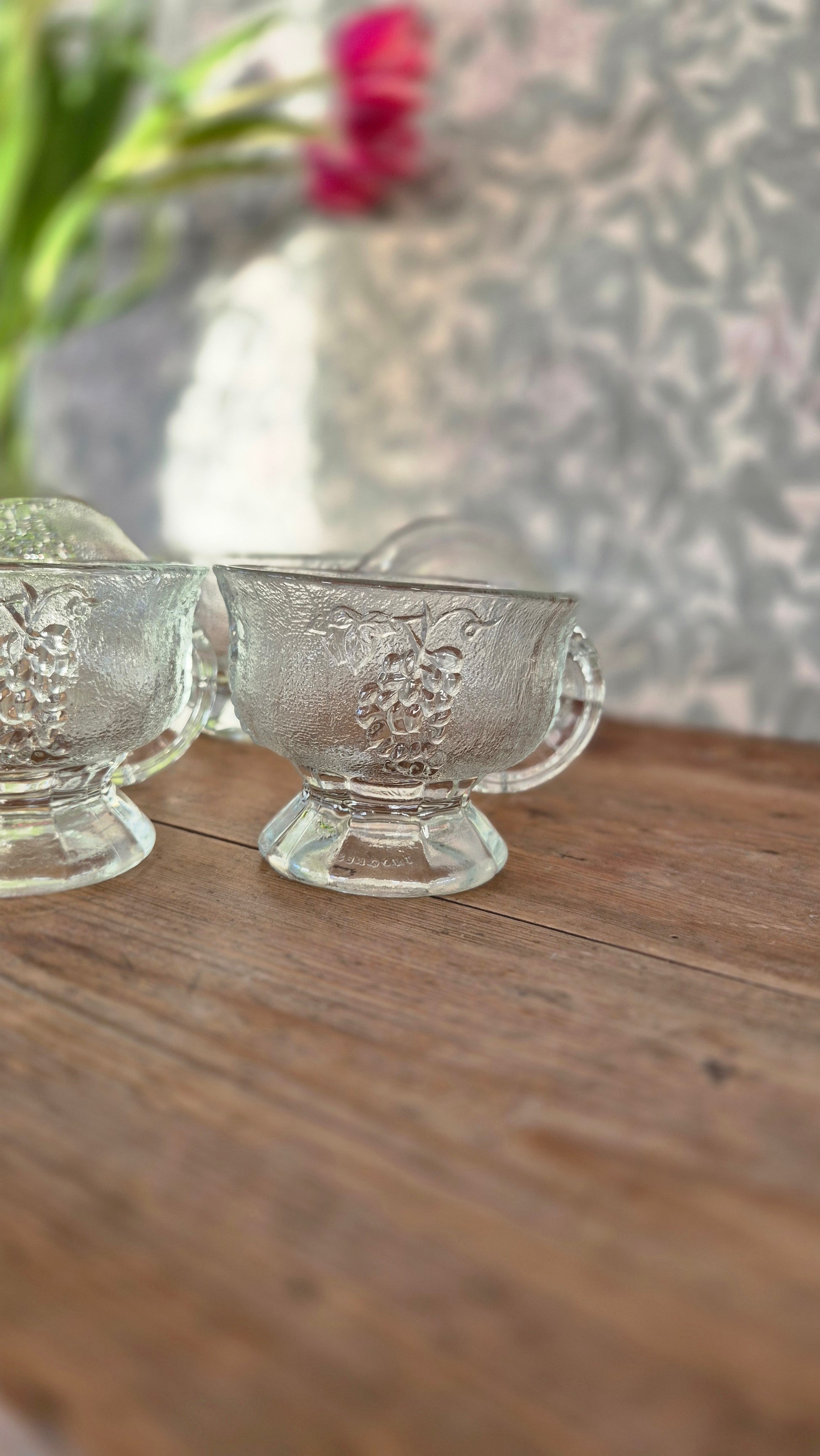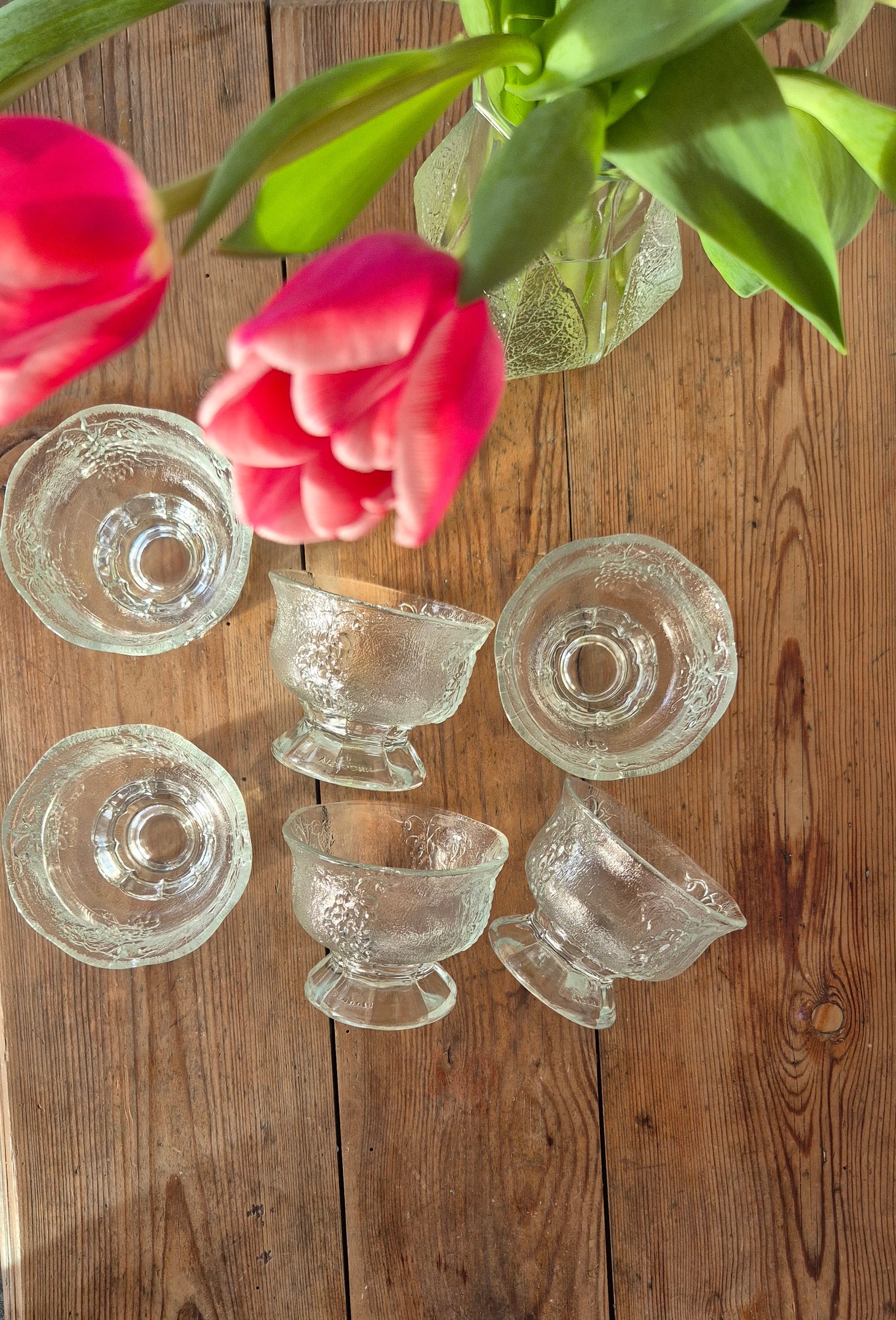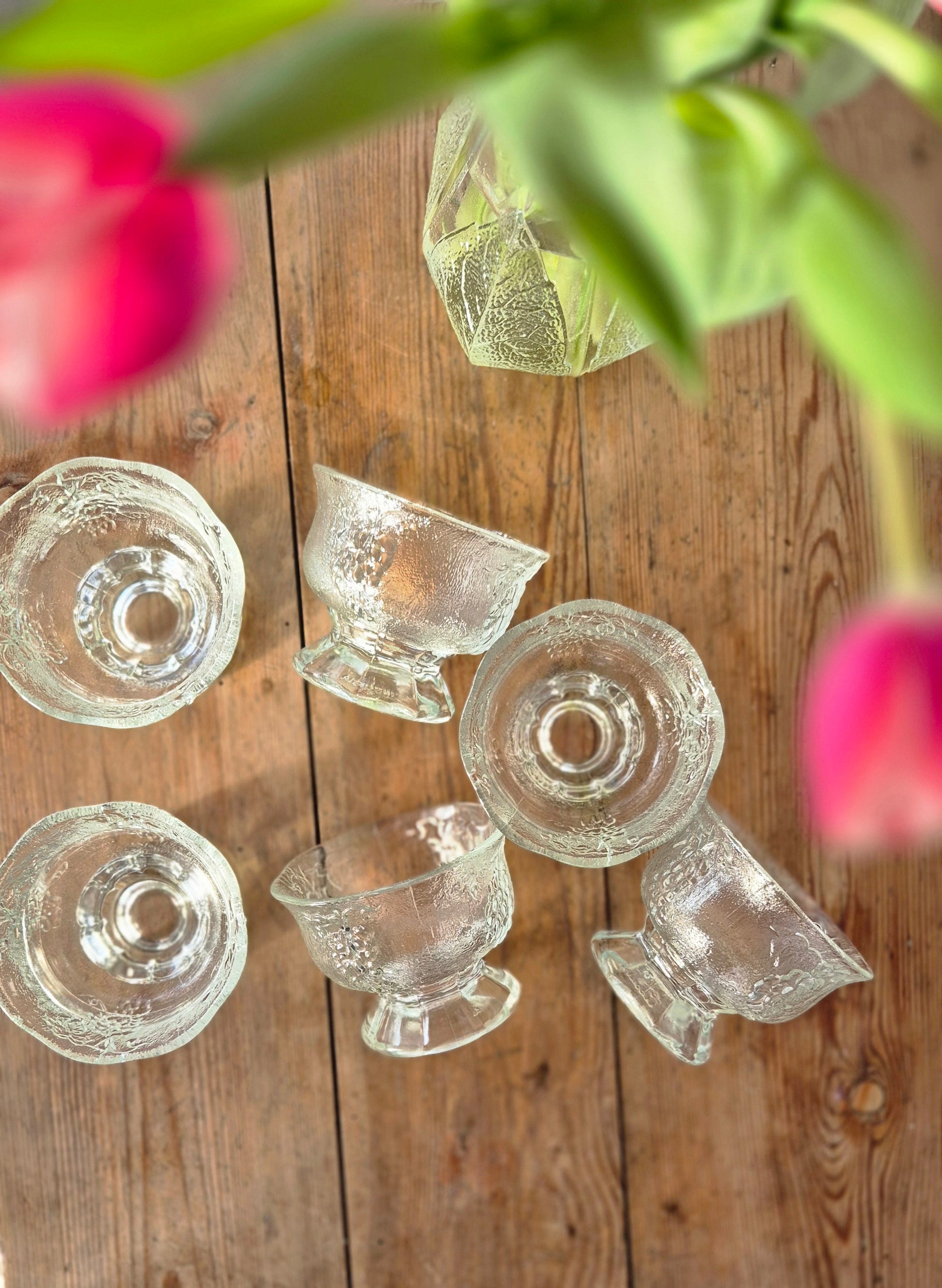 Dessertglas med vindruvsmotiv. Fina att servera både dessert, tilltugg och förrätt i. Säljs som ett set med 6 stycken.