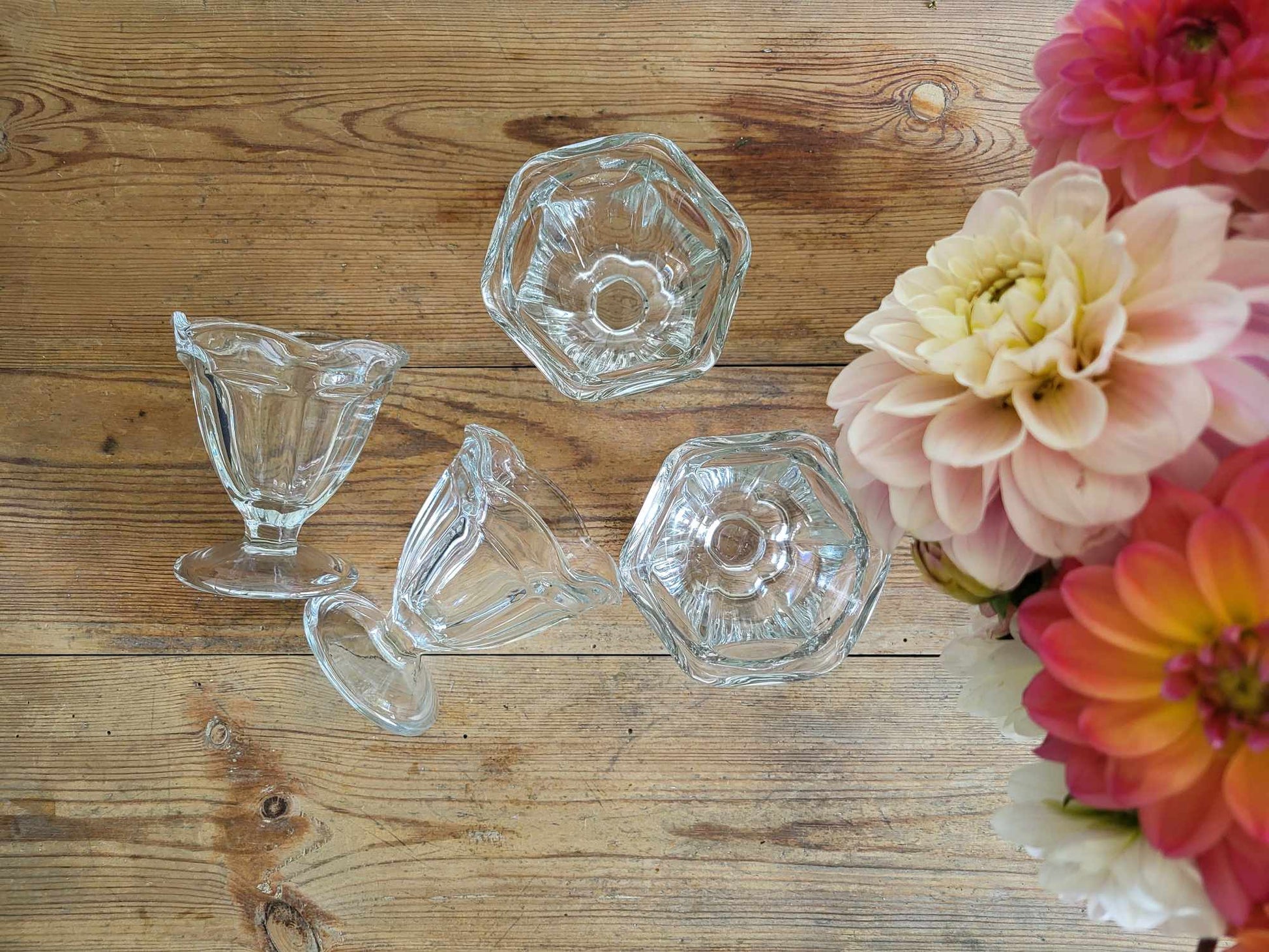 Vackra dessertskålar i glas med söt volangkant. Fint skick. Säljs som ett set om fyra.