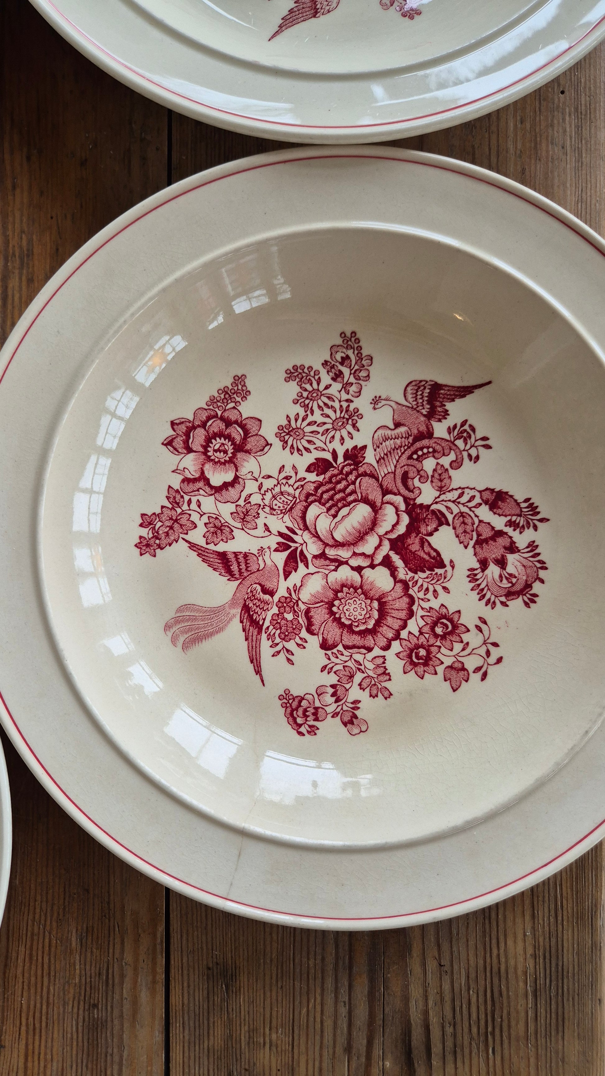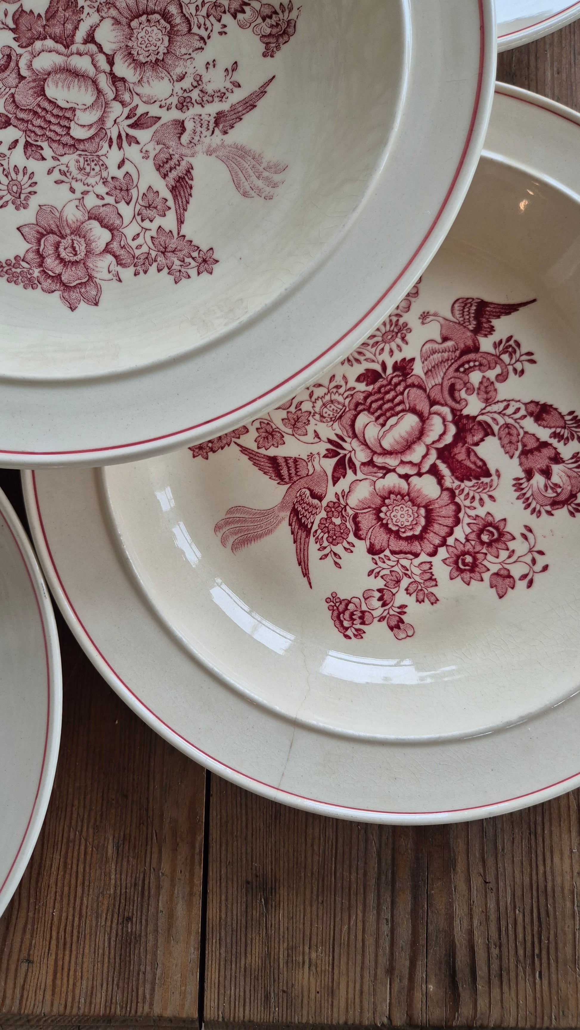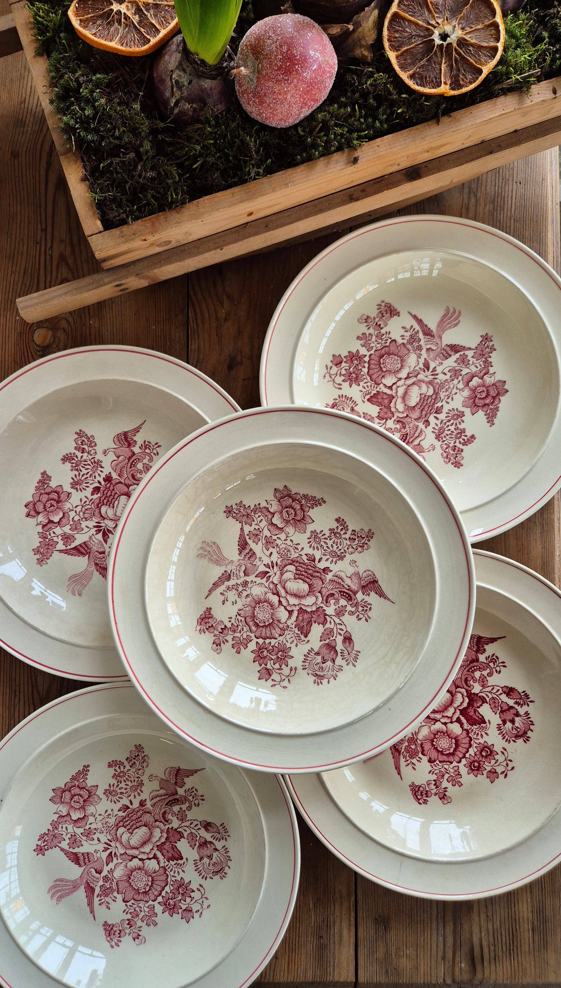 Vackra gamla djupa tallrikar från Gustavsberg med märket Fasan. Otroligt fin dekor. Ett micronagg finns på en tallrik. Knappt synbart. Krackeleringar förekommer och viss gulnad på en eller flera tallrikar. Porslinet har i sig en jämn gulnad. En tallrik har en spricka. Fint skick för sin ålder. Säljs styckvis. Välj hur många du önskar köpa.