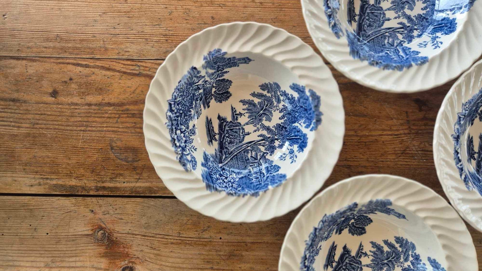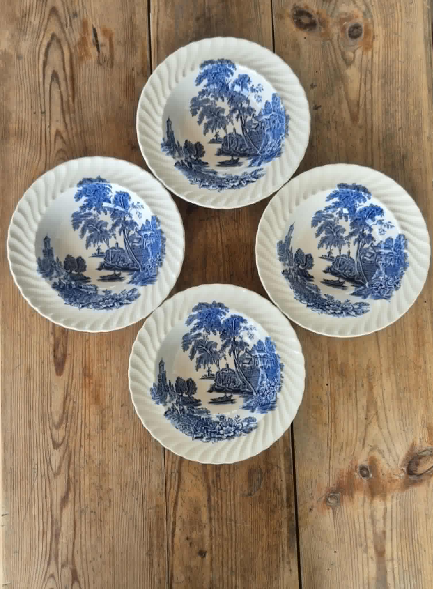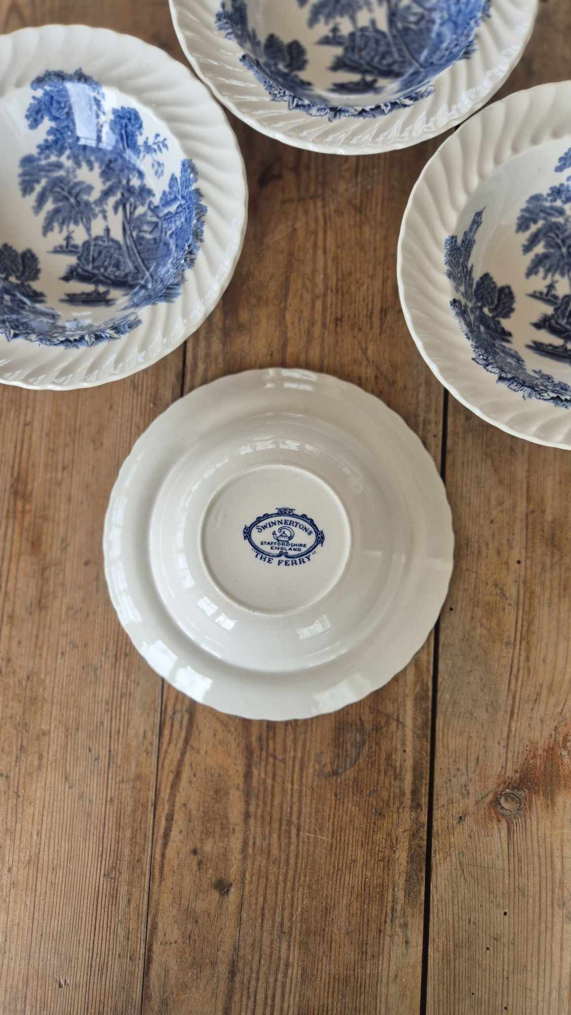 Ljuvliga engelska frukostskålar i vackert blåvitt mönster. Passar till frukosten men även desserten. Swinnertons, Staffordshire, Färjan. Fint skick. Säljs som ett set om fyra.