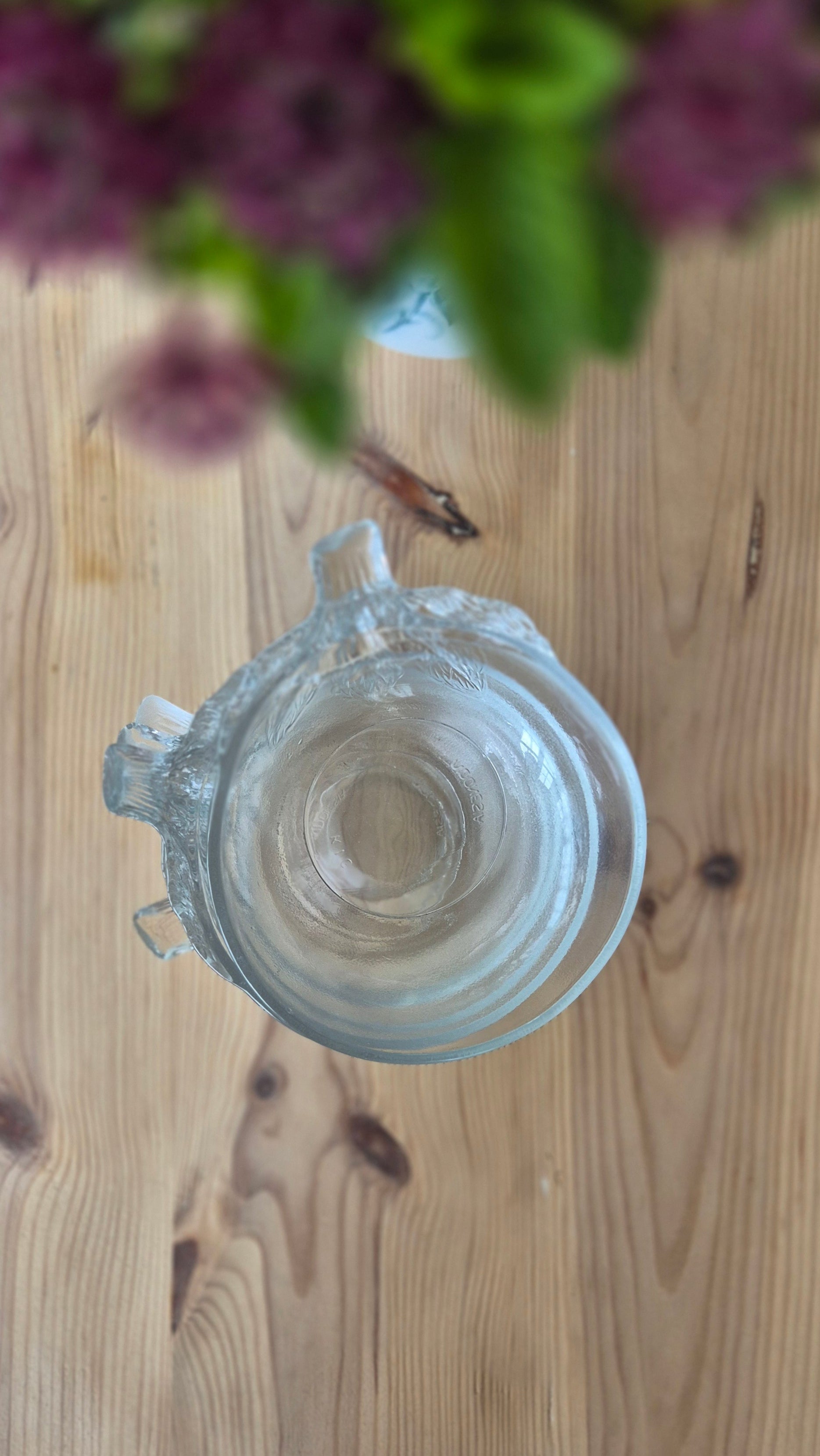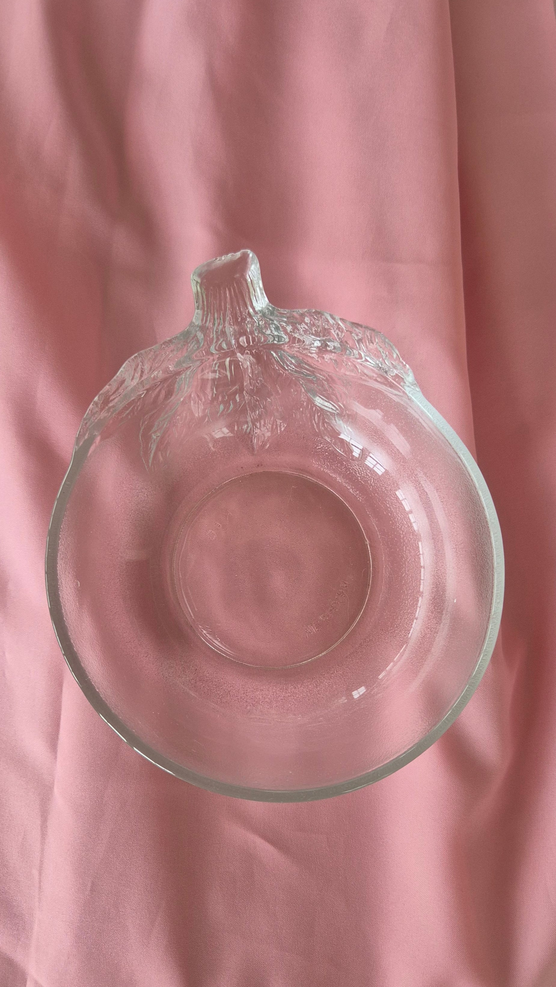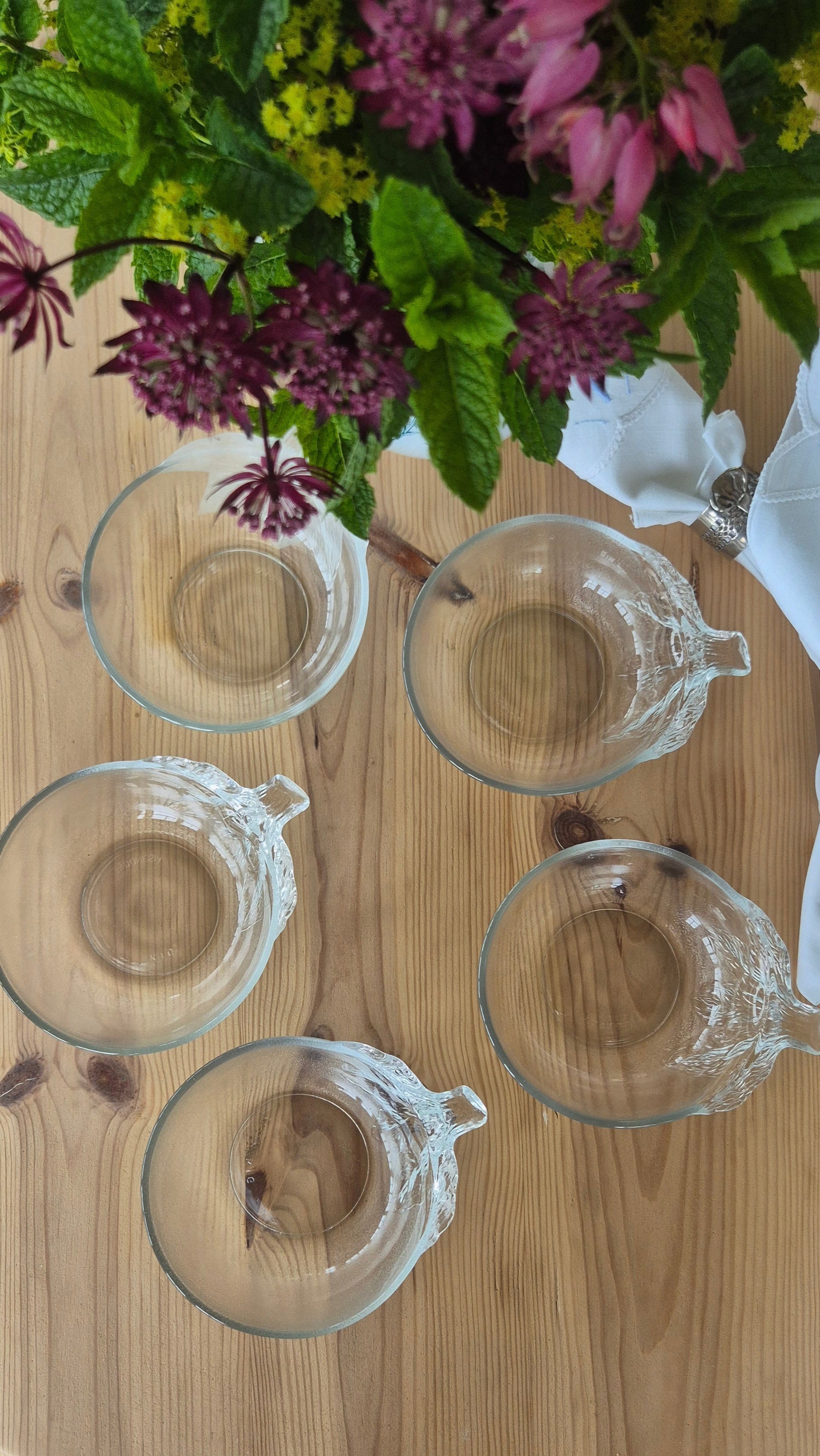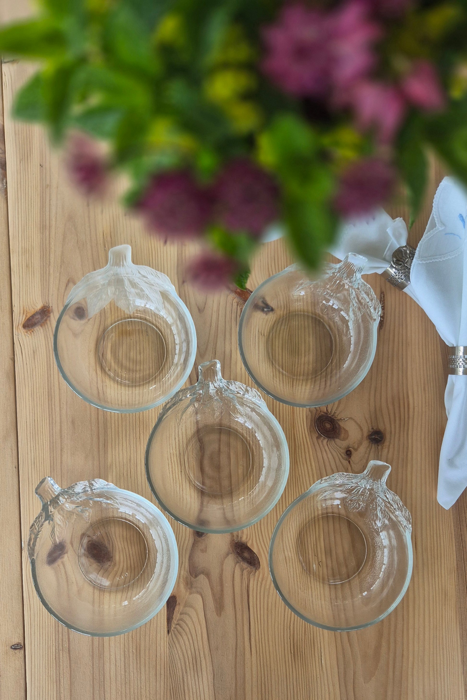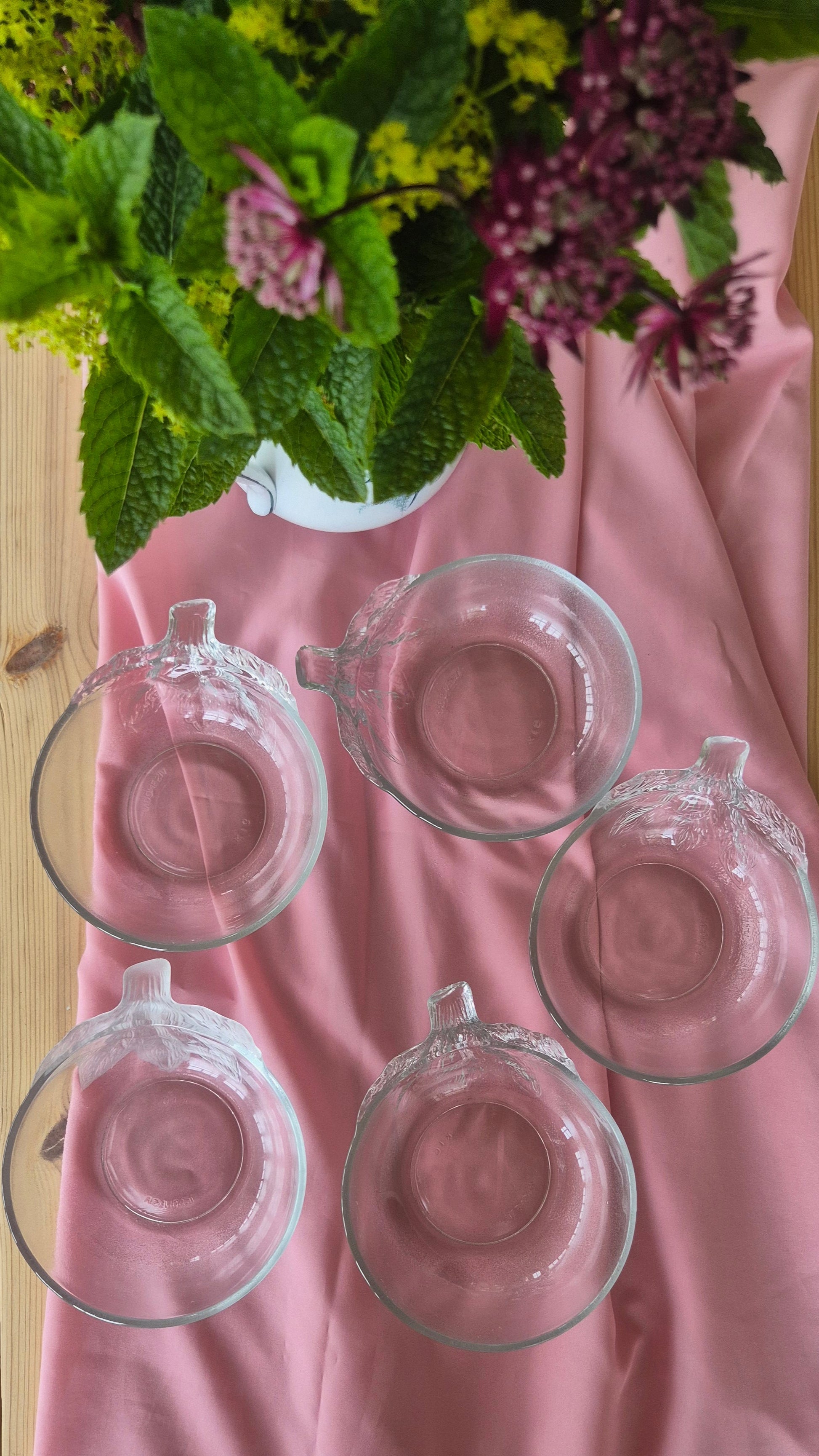 Skålar i frostat glas formade som jordgubbar. Lika fina till fredagens taco som till jordgubbsdesserten. Fint skick. Säljs i set om fem stycken.