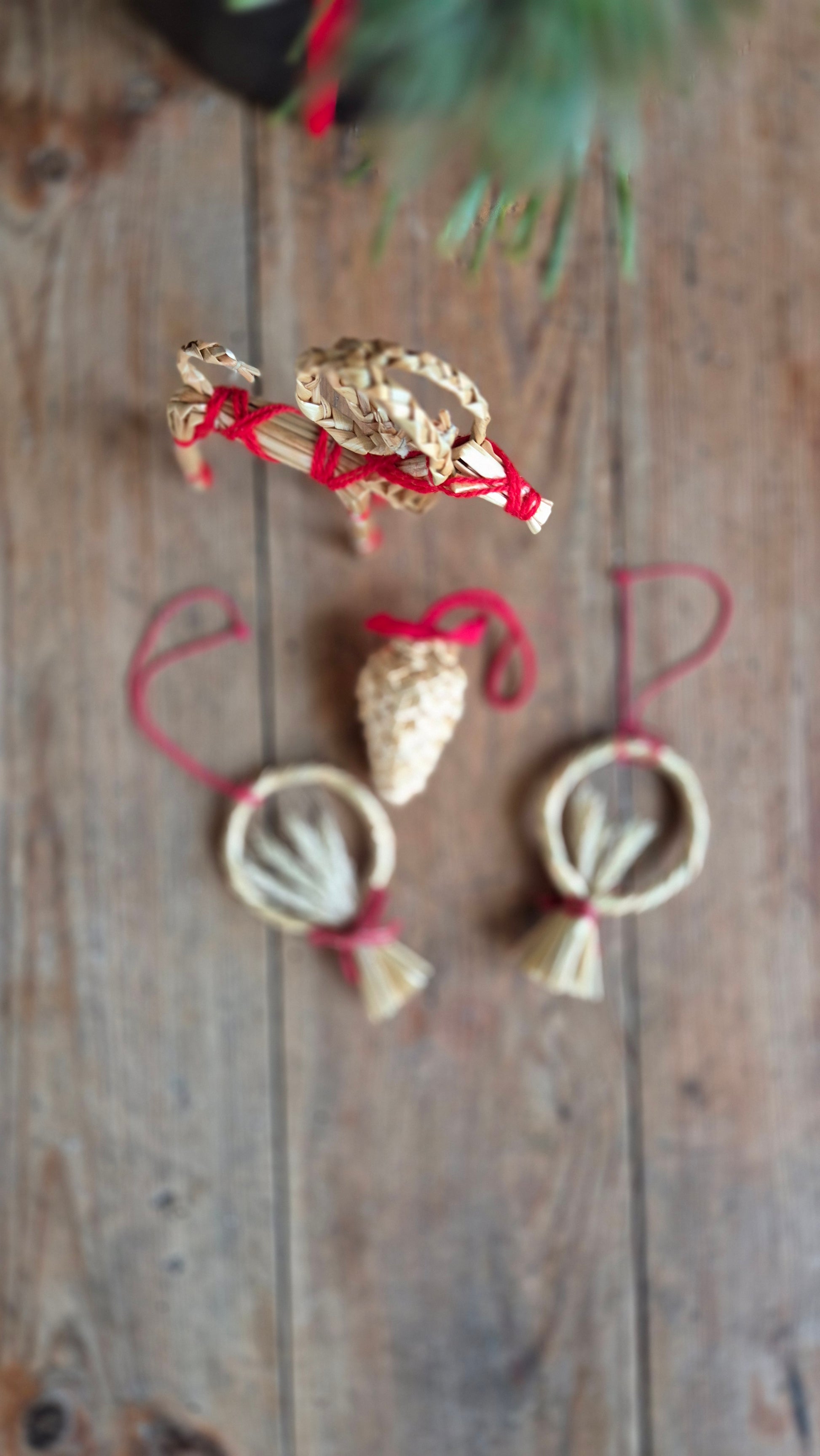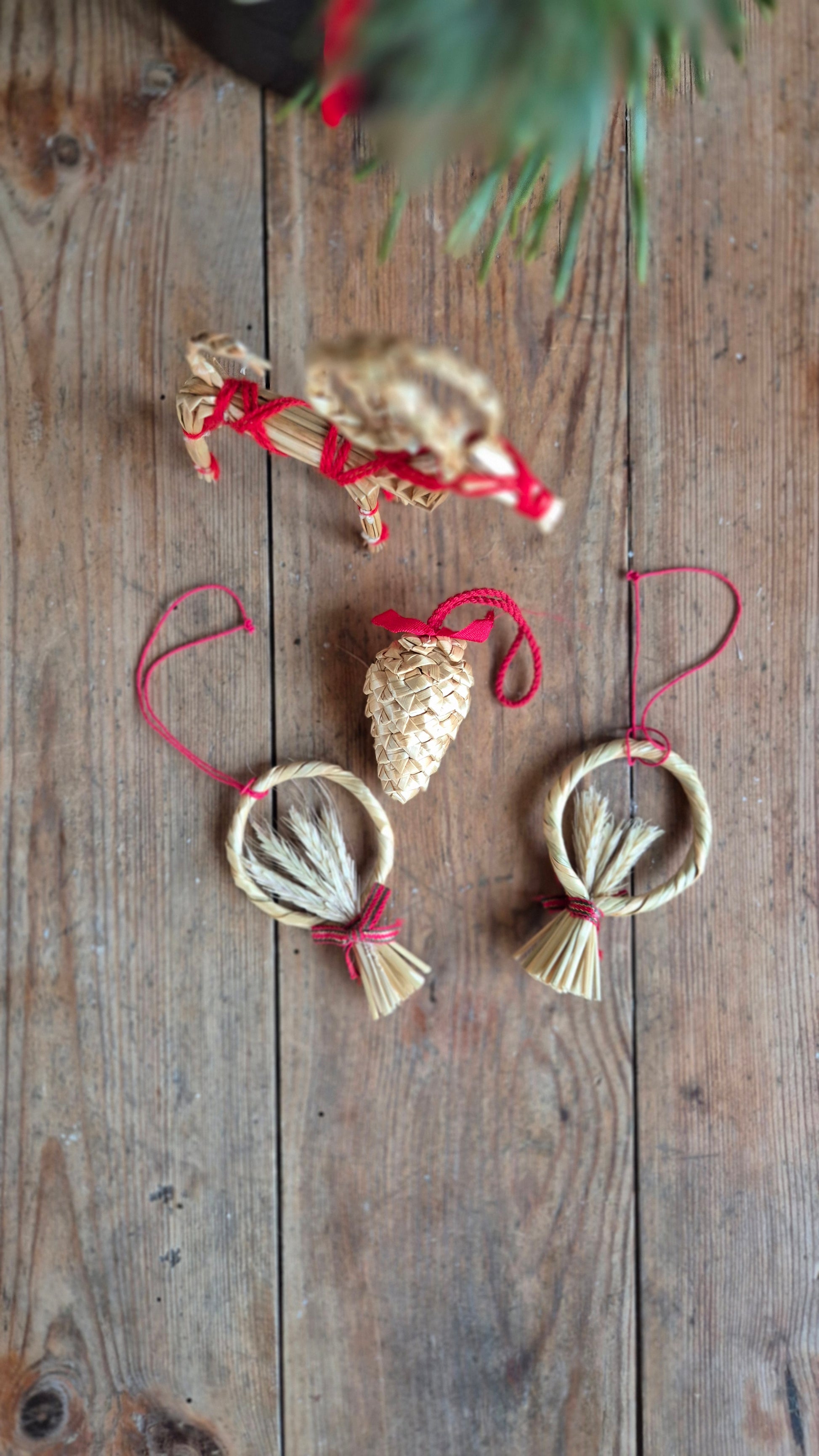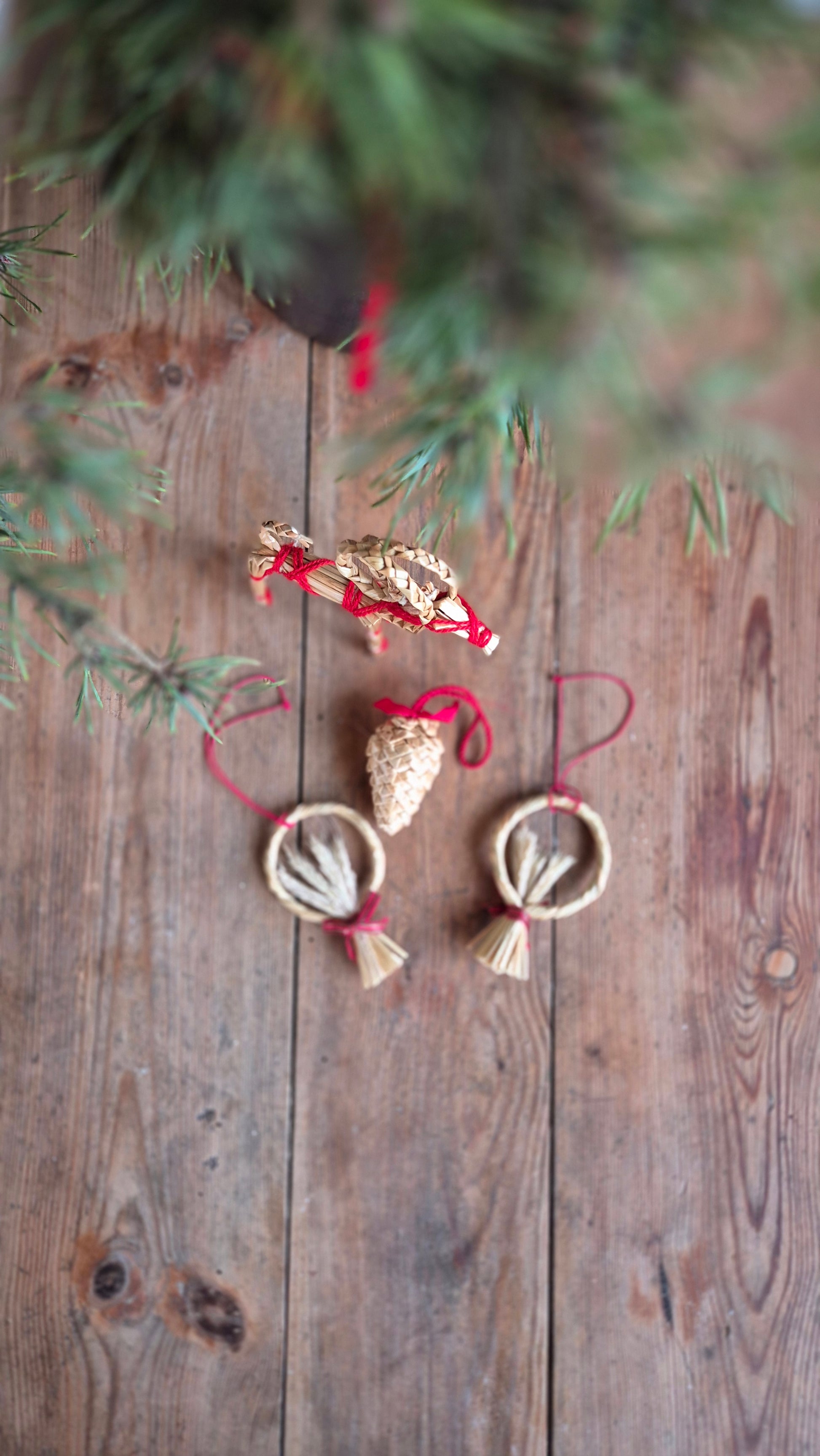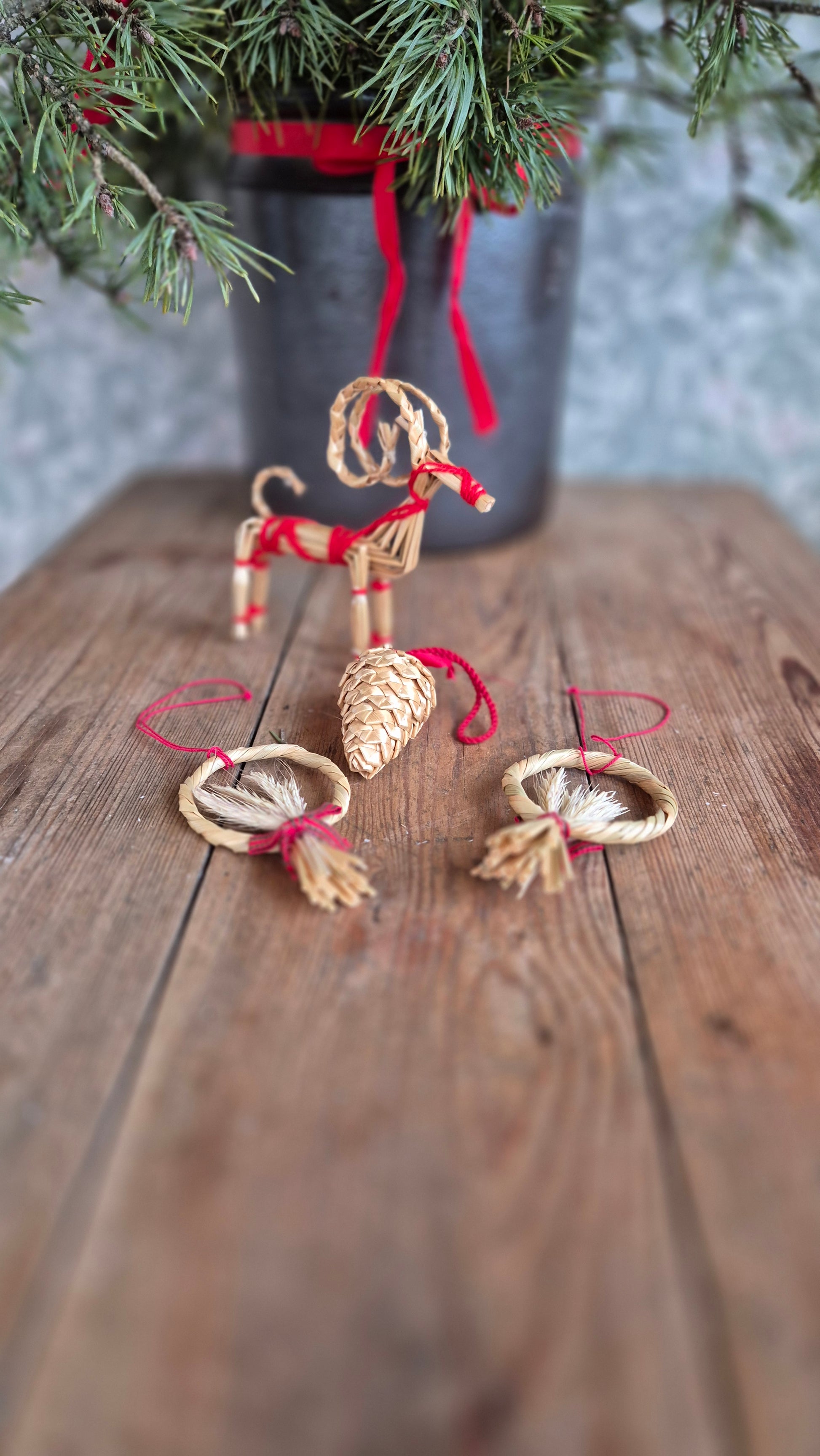 Fina julhängen i halm. En söt julbock, en kotte och två halmringar. Säljs som ett set med 4 stycken.