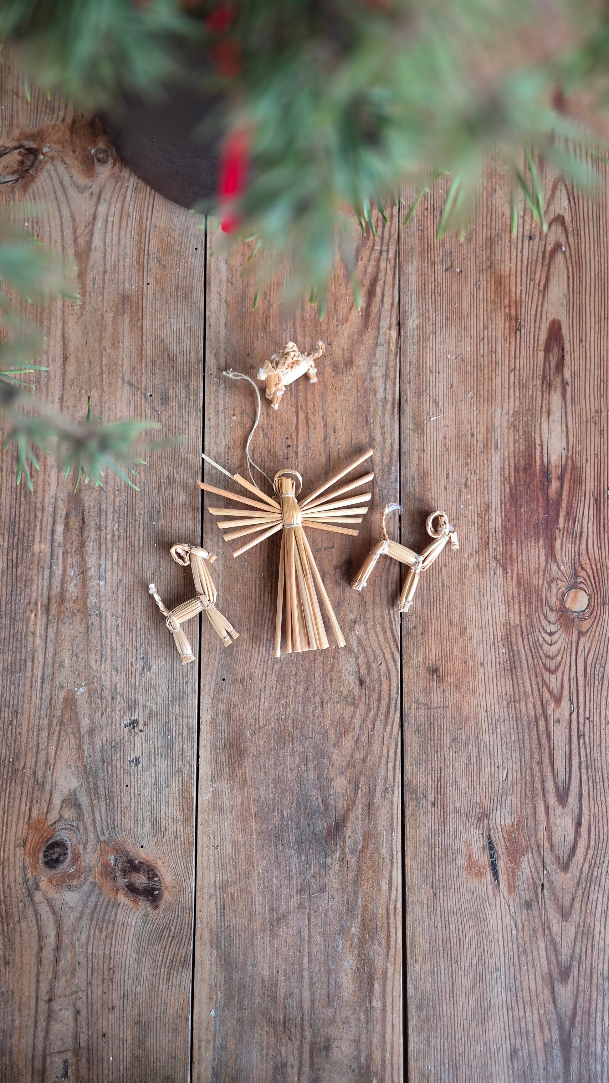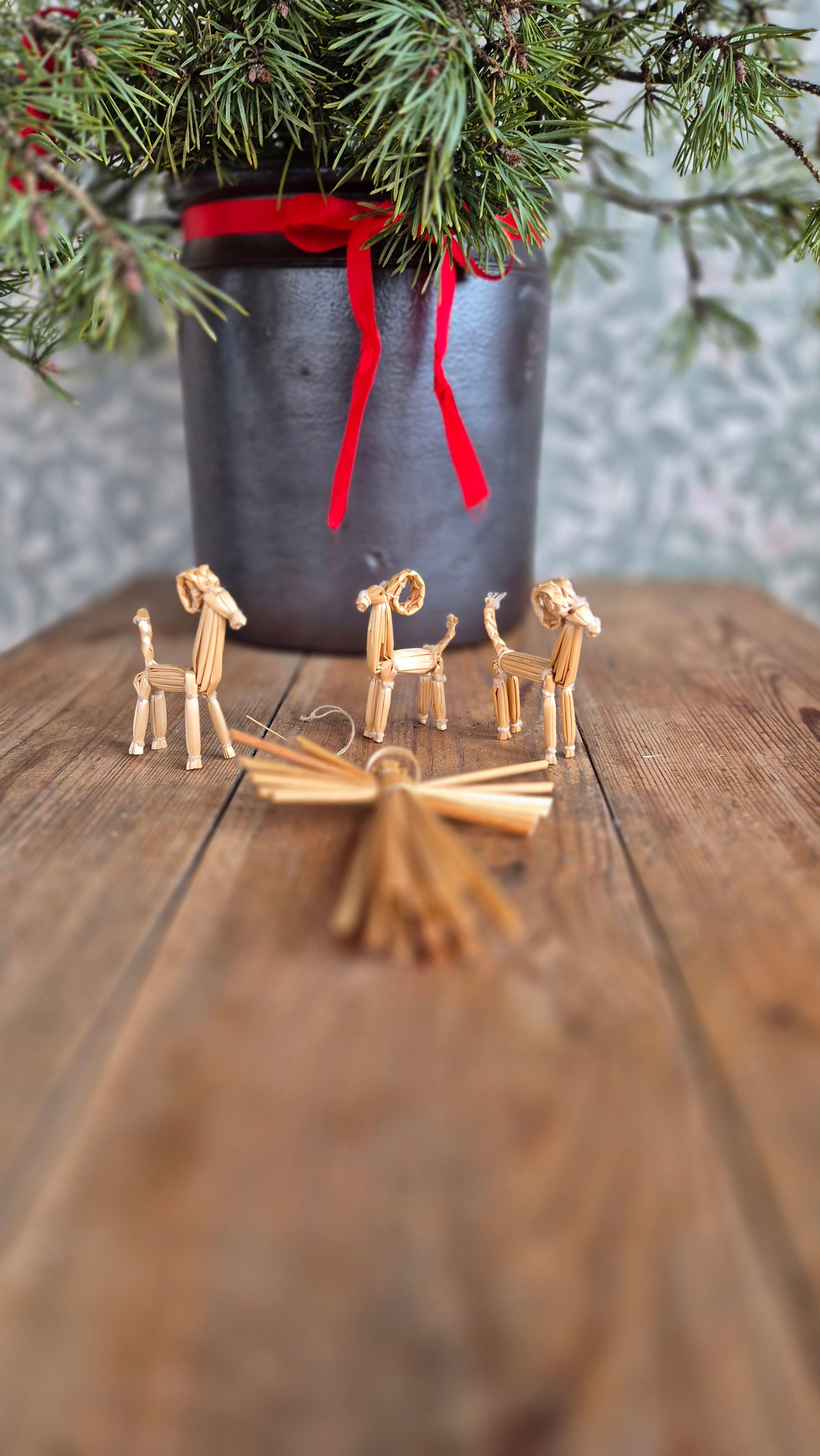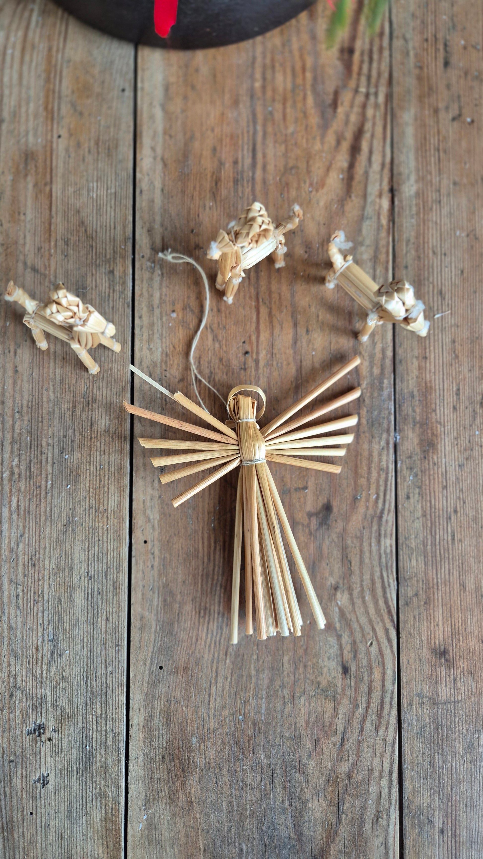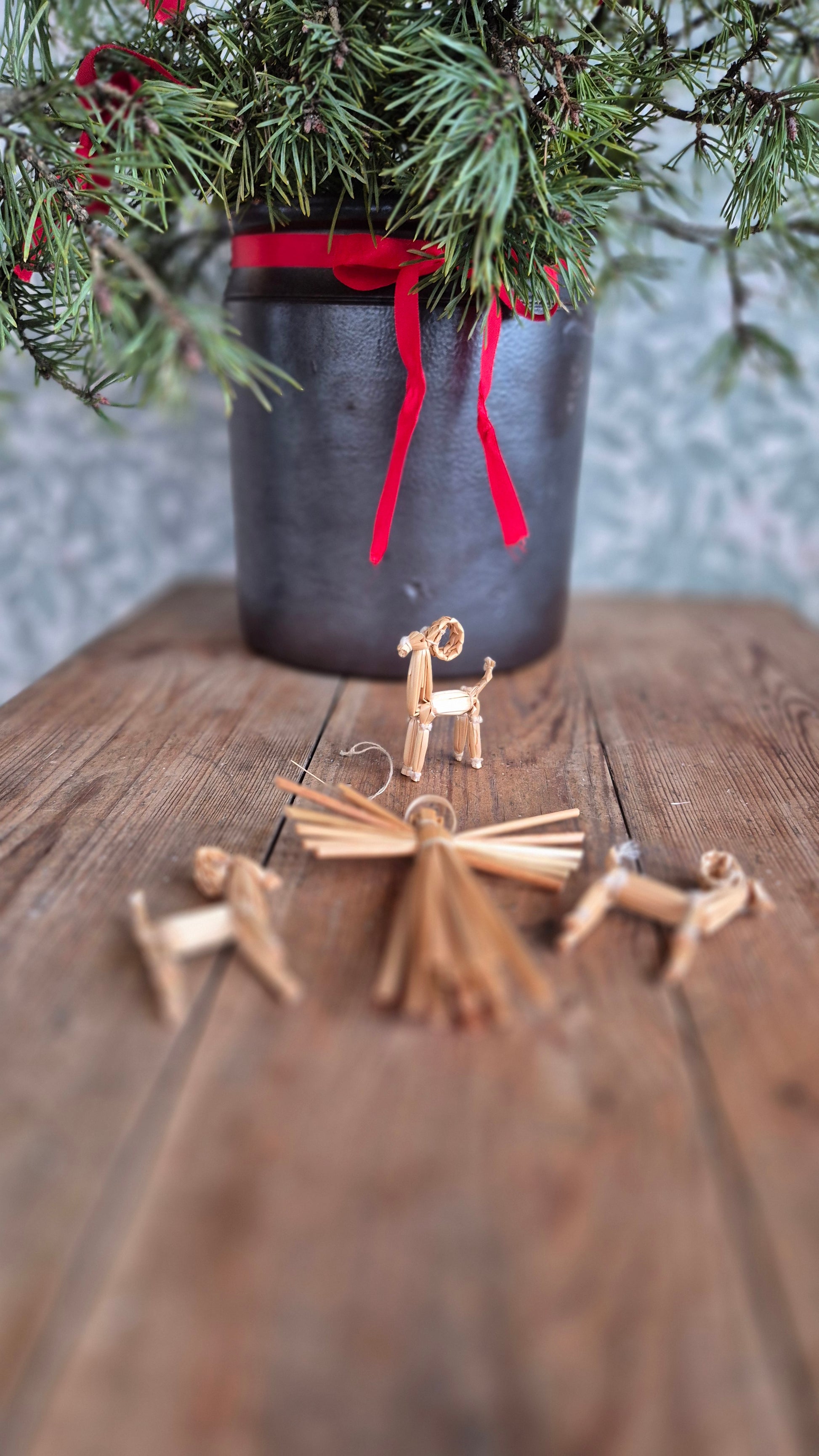 Fina äldre halmhängen/ figurer. Ett hänge är en ängel och tre är bockar. Ängeln har lite bruksslitage på en vinge. Bockarna kan behöva snören för upphängning eller så kan de nog hängas/läggas ändå. Halmhängen ger en mysig känsla till julen. Fint skick. Säljs i set om fyra stycken.