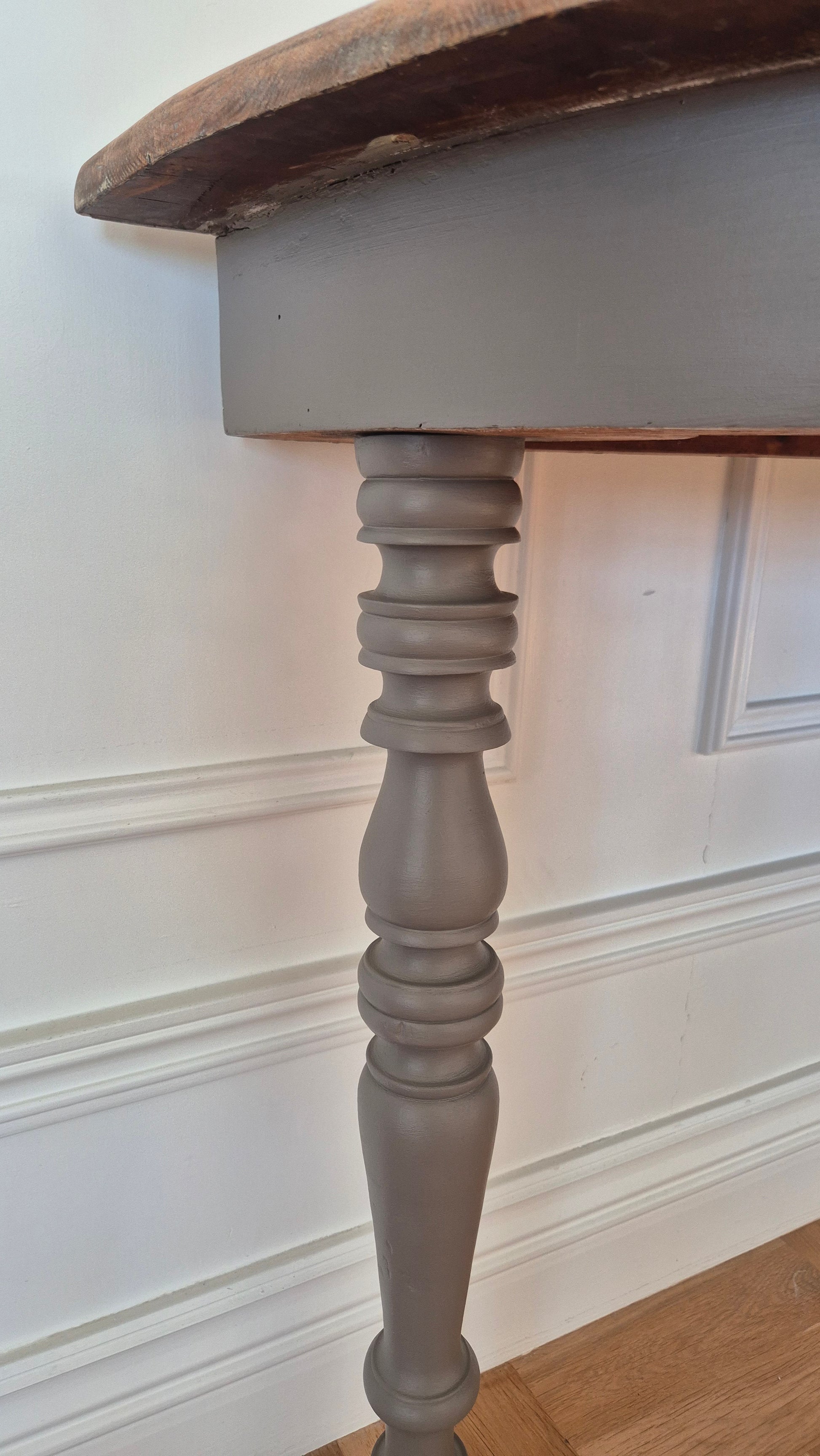 Gammalt härligt halvmånebord med charmig patina. Benen tillsammans med trären bordsskiva, så snyggt!