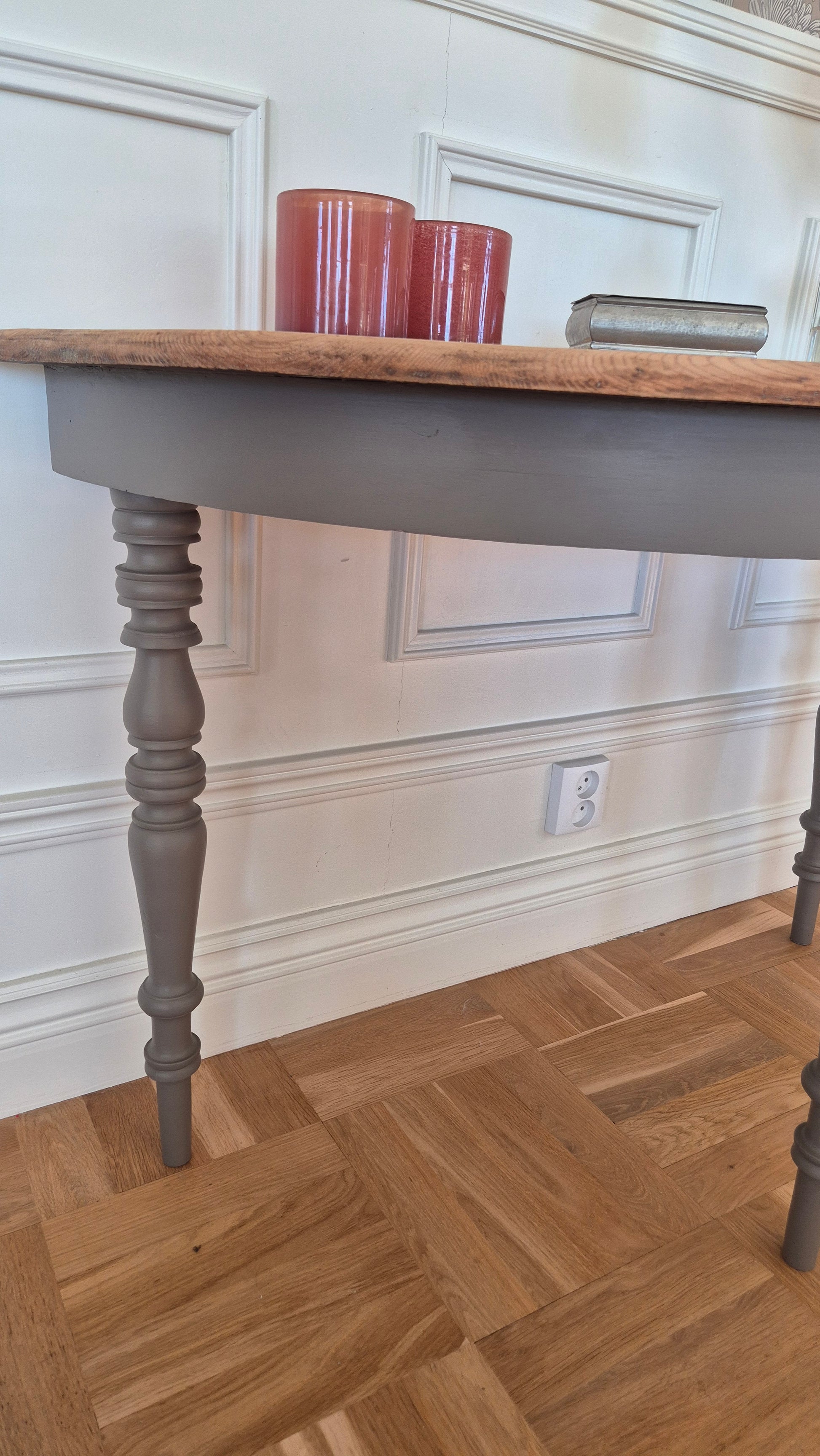 Benen är målade med Jotun Vintage brun. Bordsskivan behandlas med linoljesåpa för enkelt underhåll.