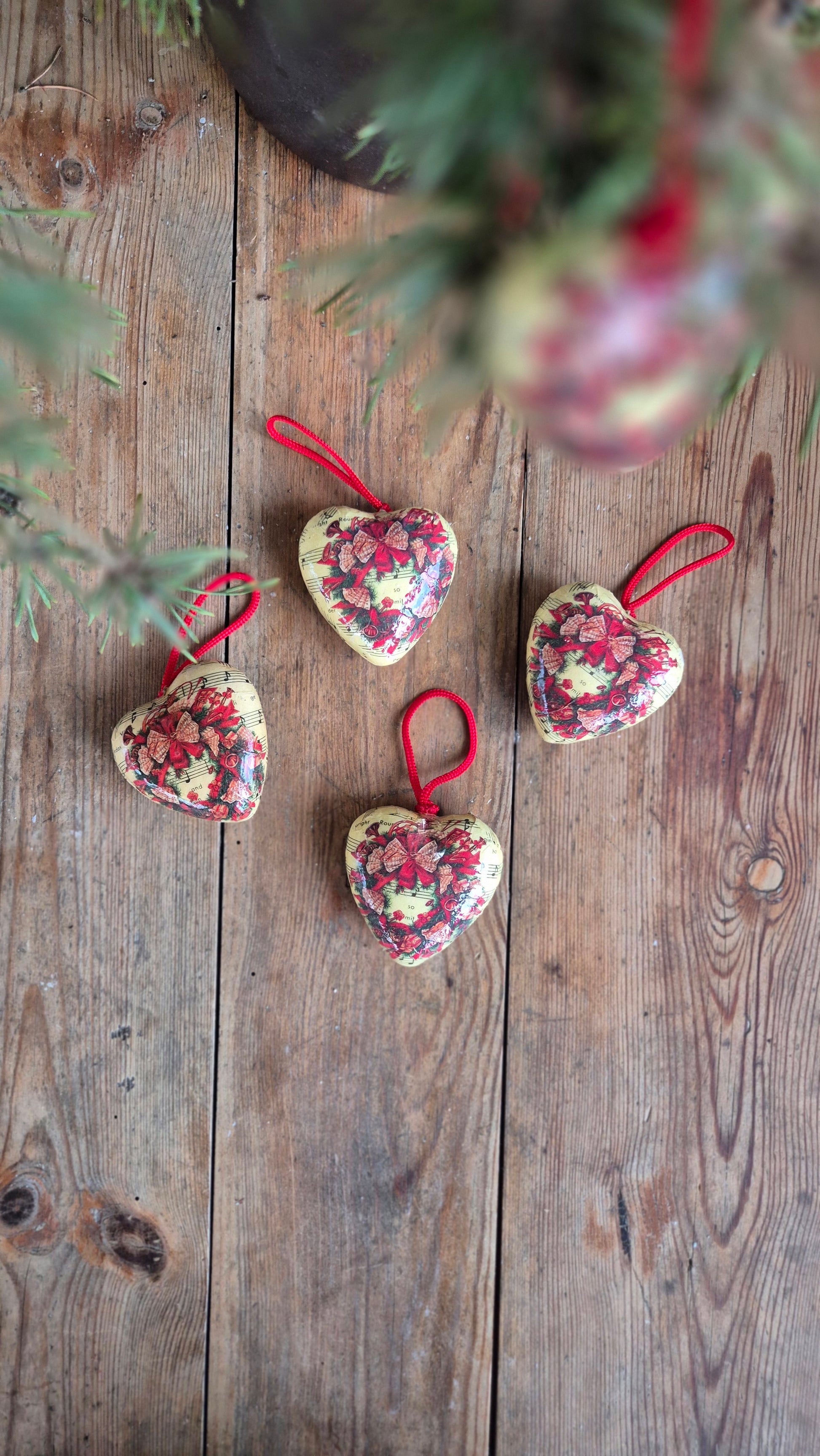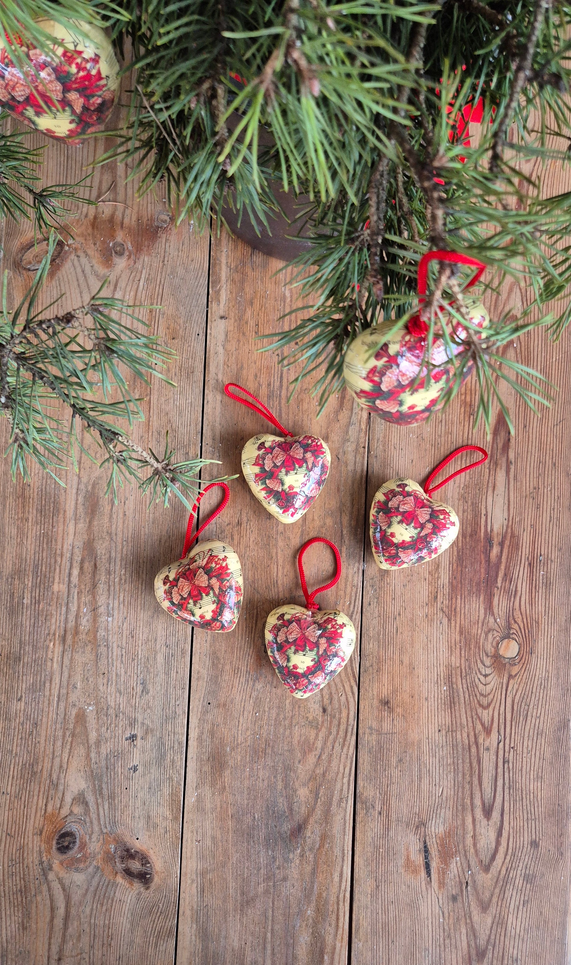Hjärtformade julgranskulor. Fint skick. Säljs som ett set om sex stycken.