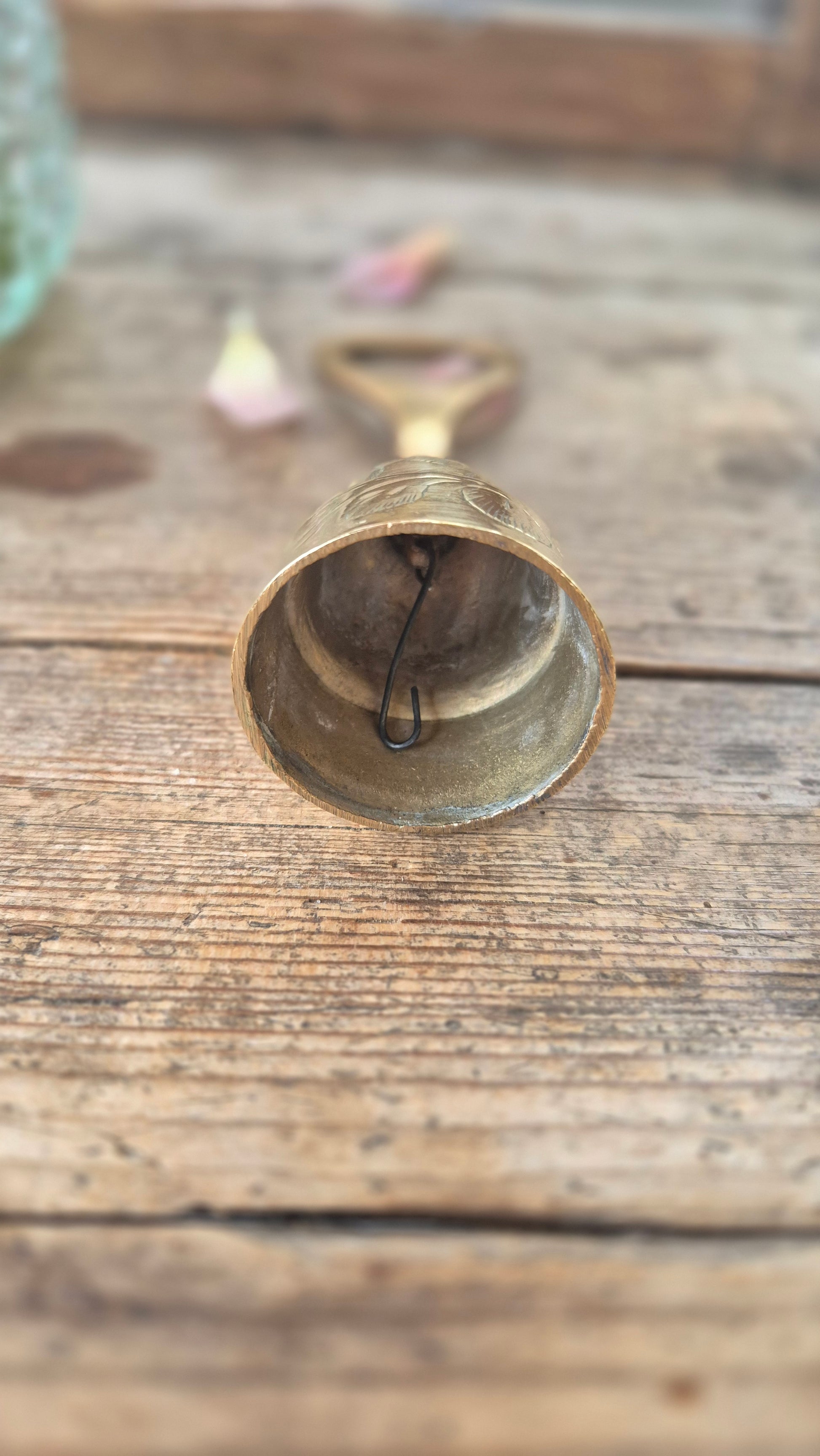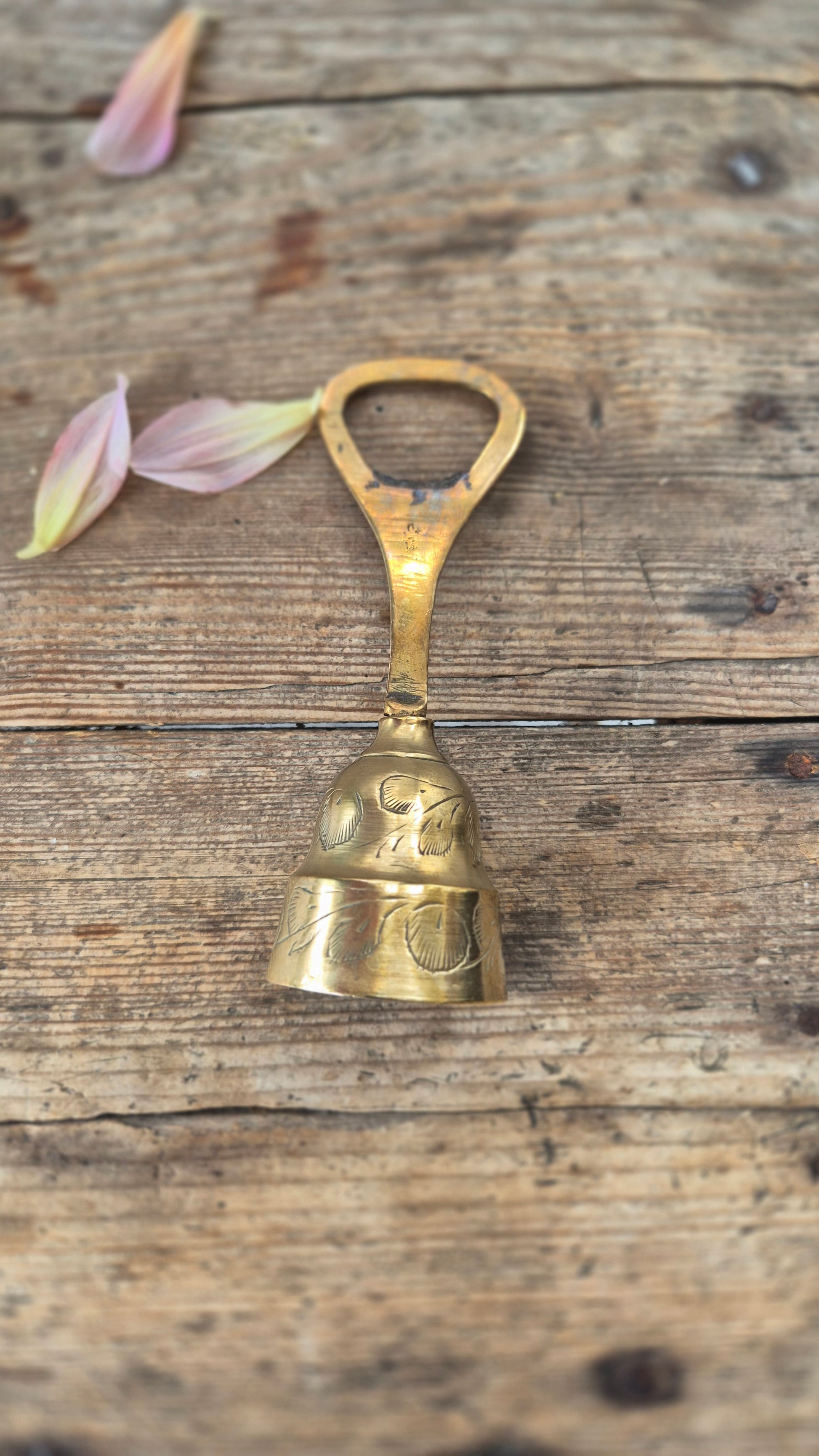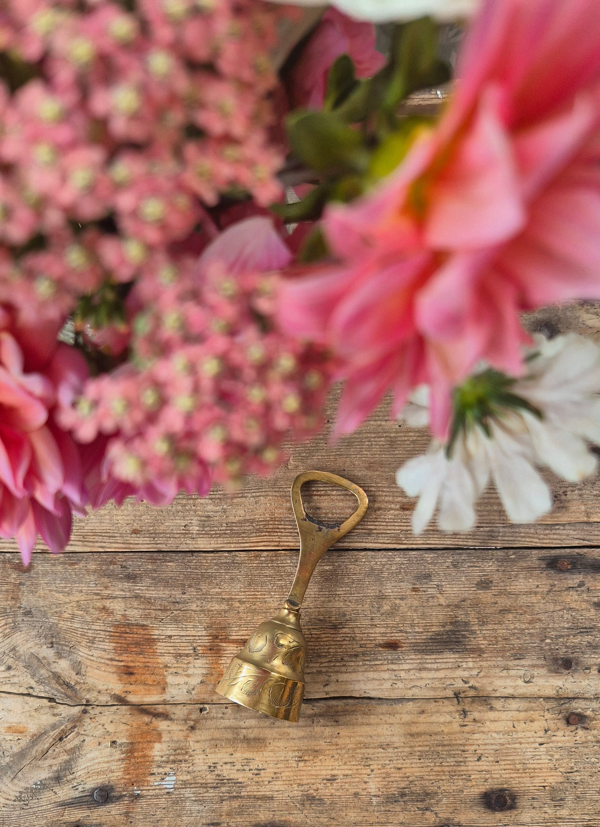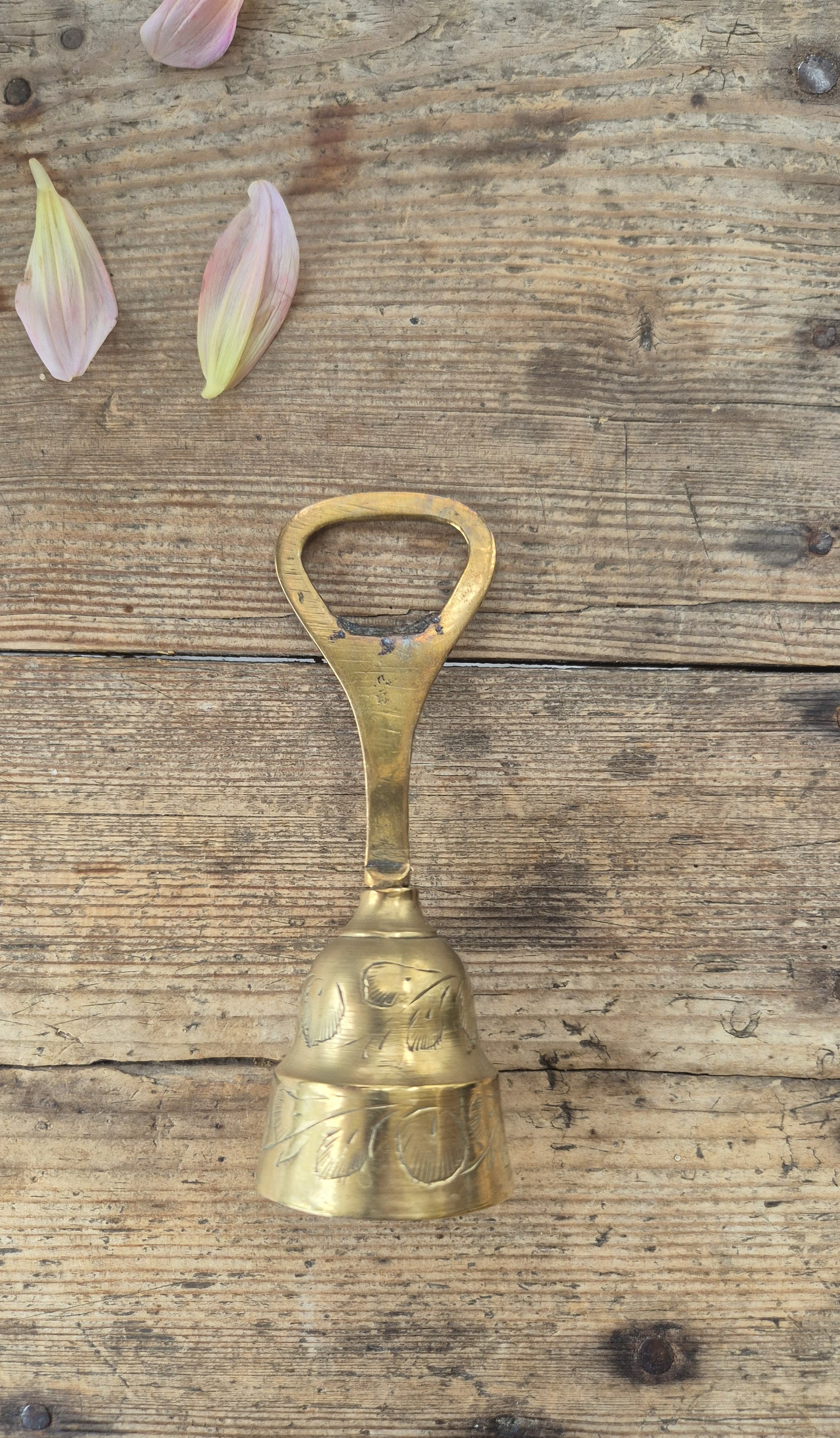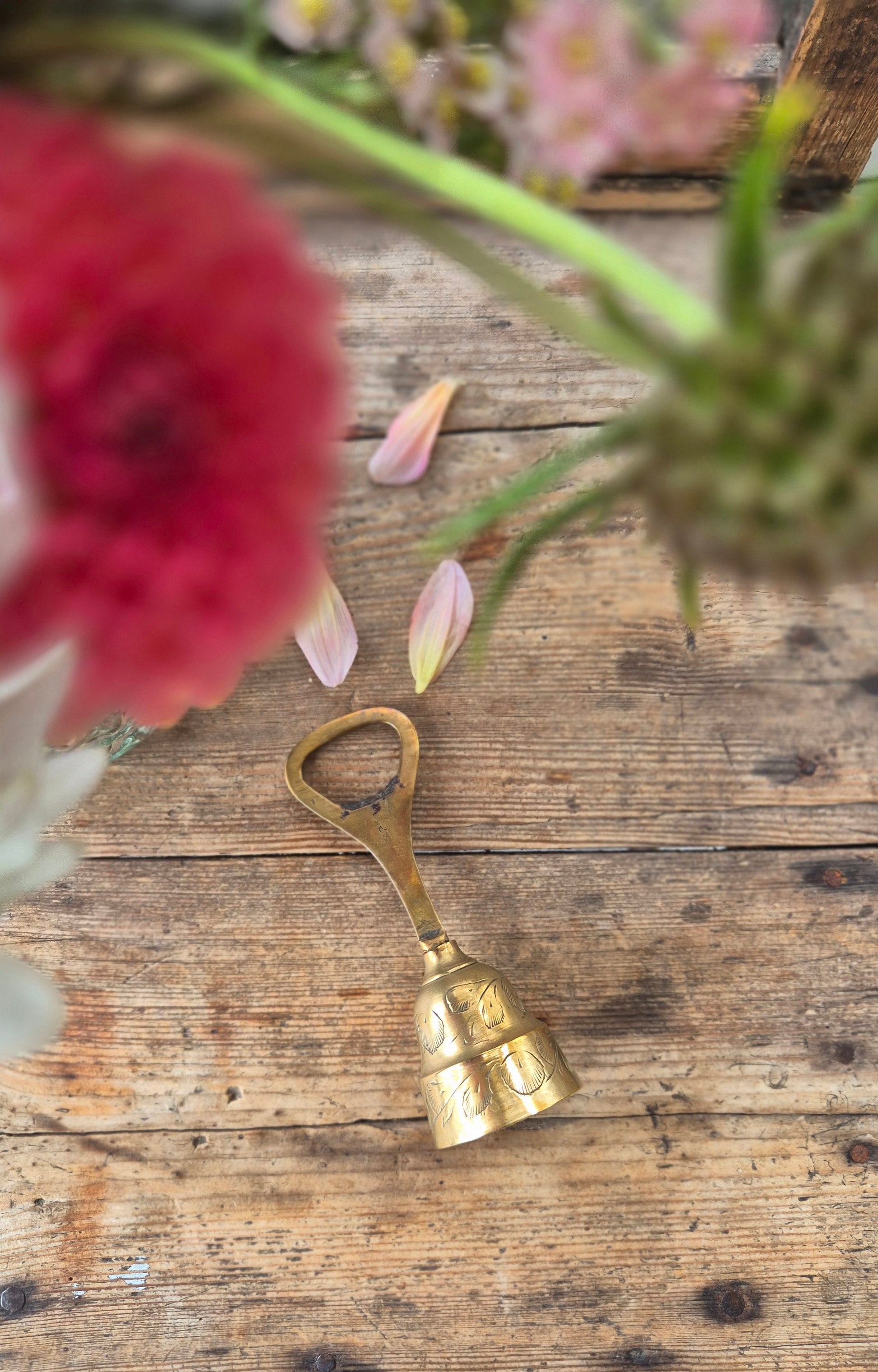 Vacker kapsylöppnare i mässing med patina och vackra detaljer. Fungerar även som pingla. Själva delen med öppnaren är sliten men fungerande.