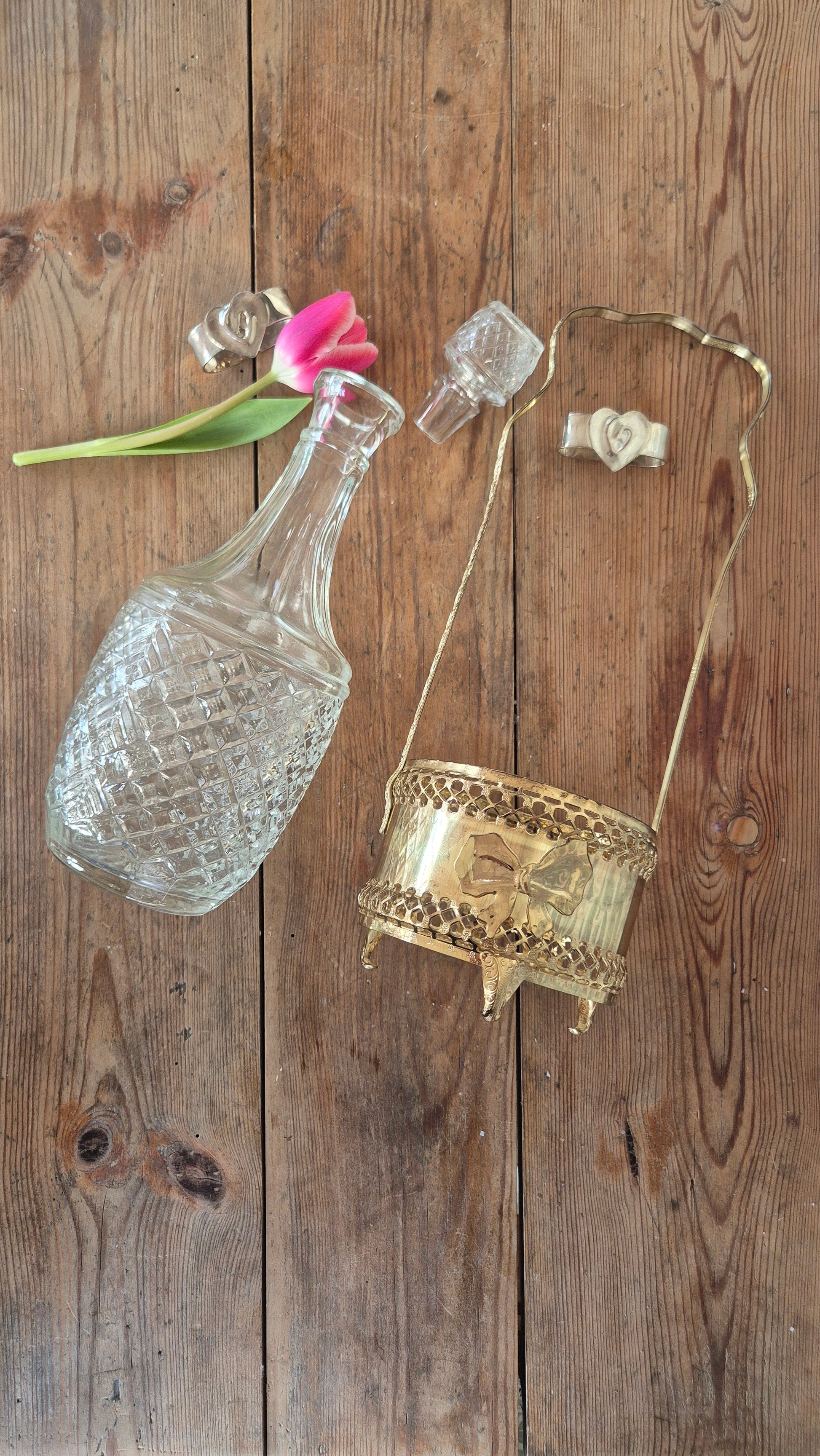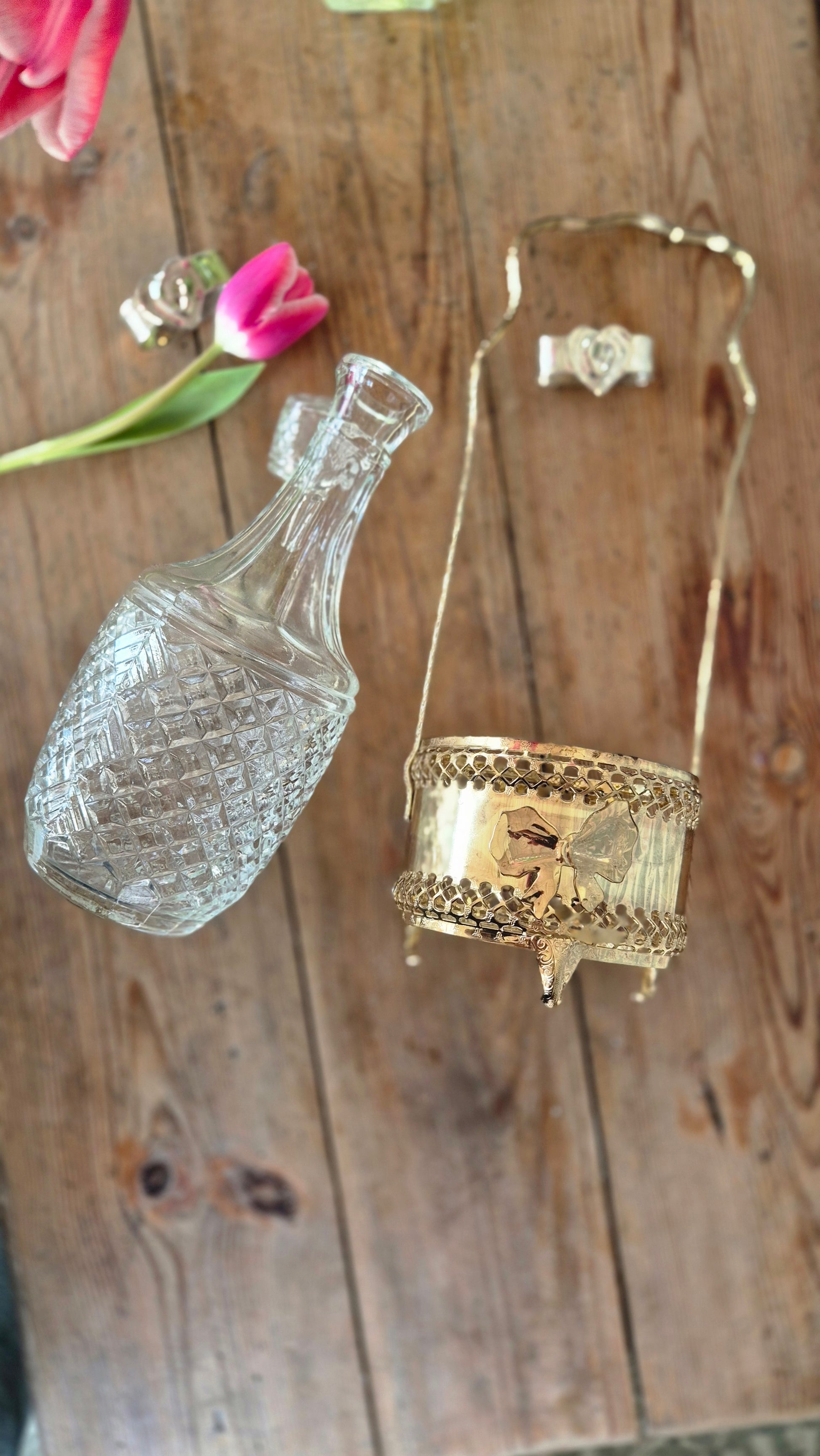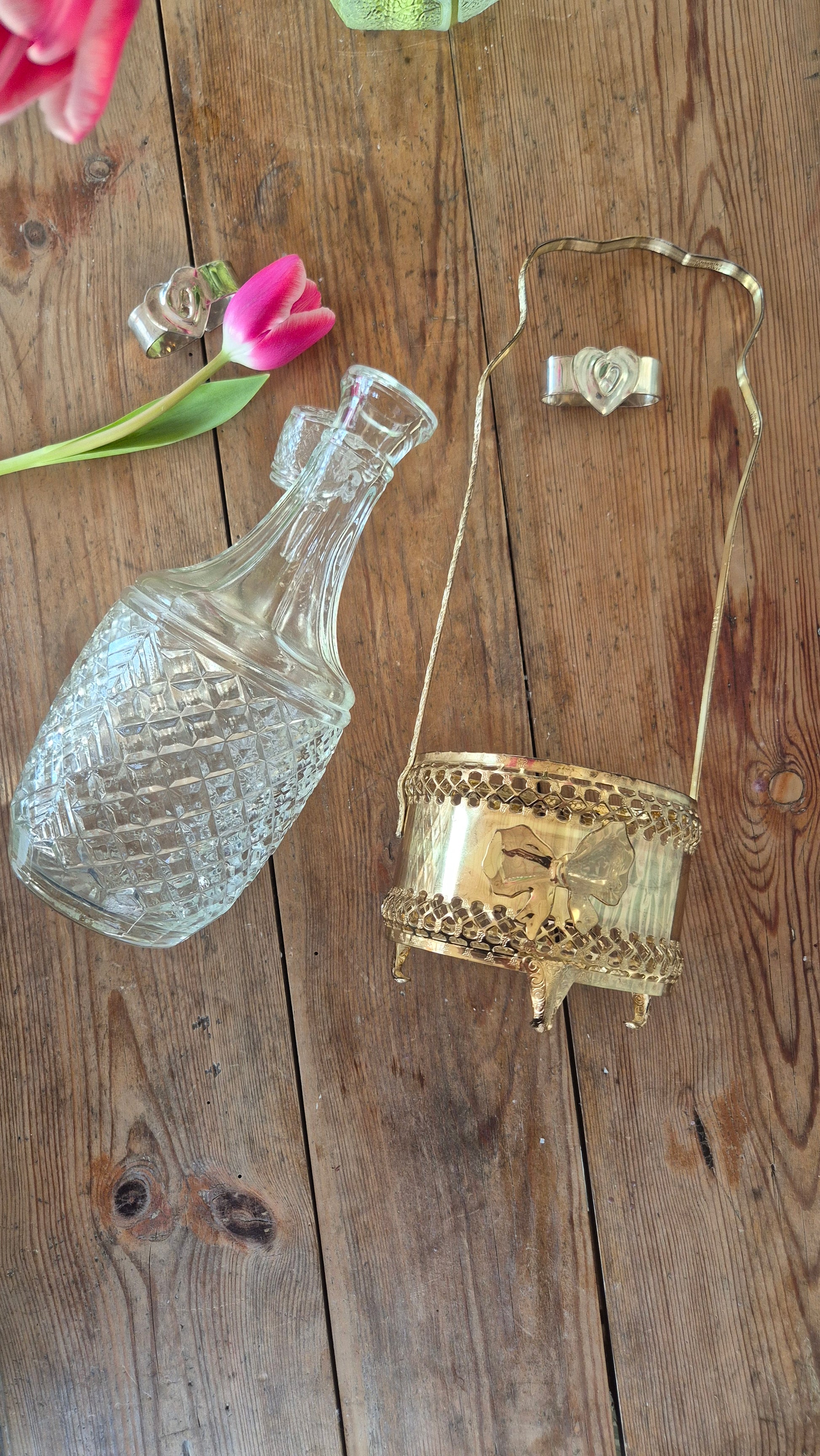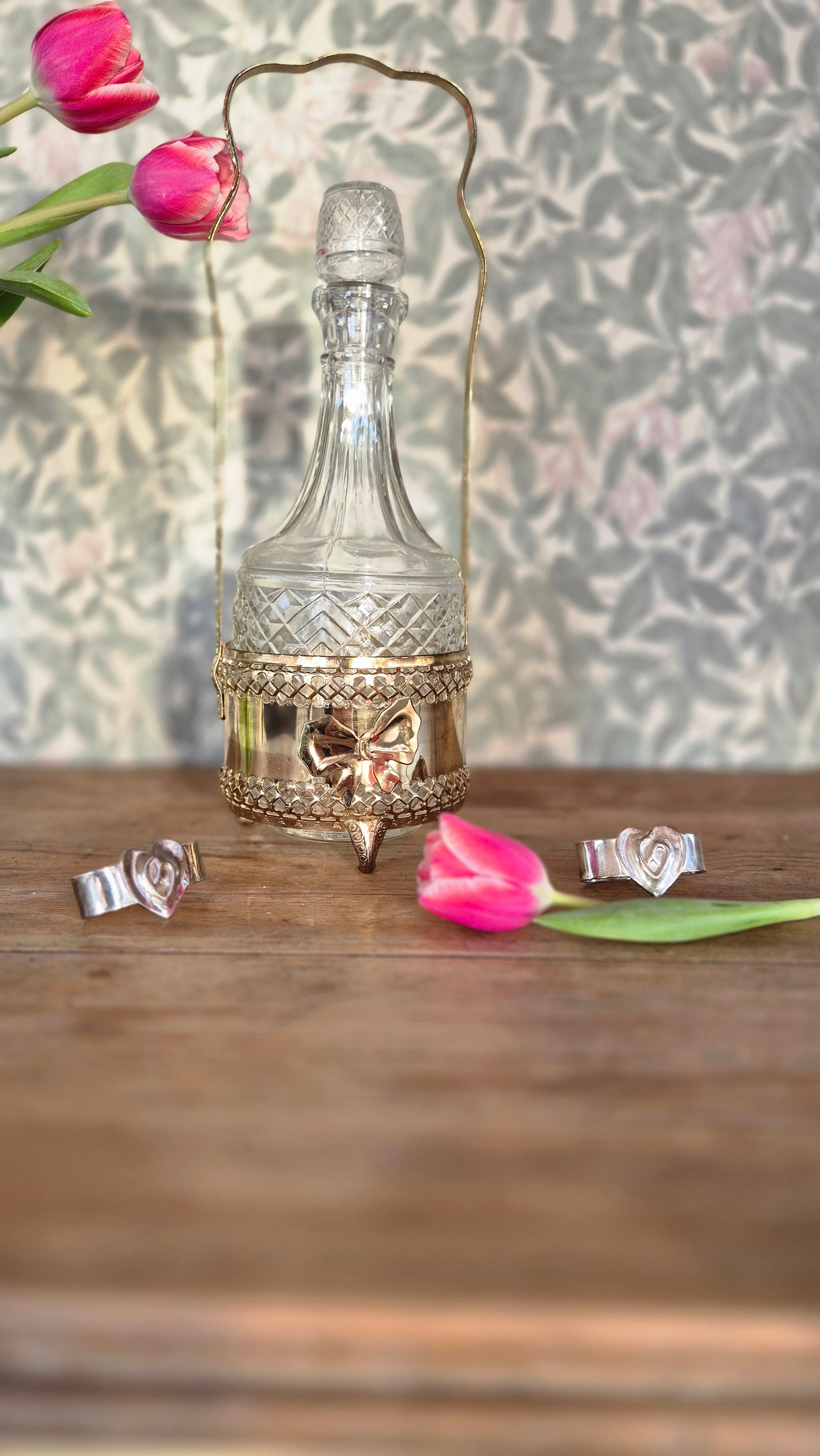 Mässingsfärgad hållare och glaskaraff för vin eller annan dryck. Hållaren är fint dekorerad med rosetter. Karaffen går att ta ur hållaren. Servera ditt vin eller övrig dryck med stil och känsla. Fin inredningsdetalj. Fint skick.
