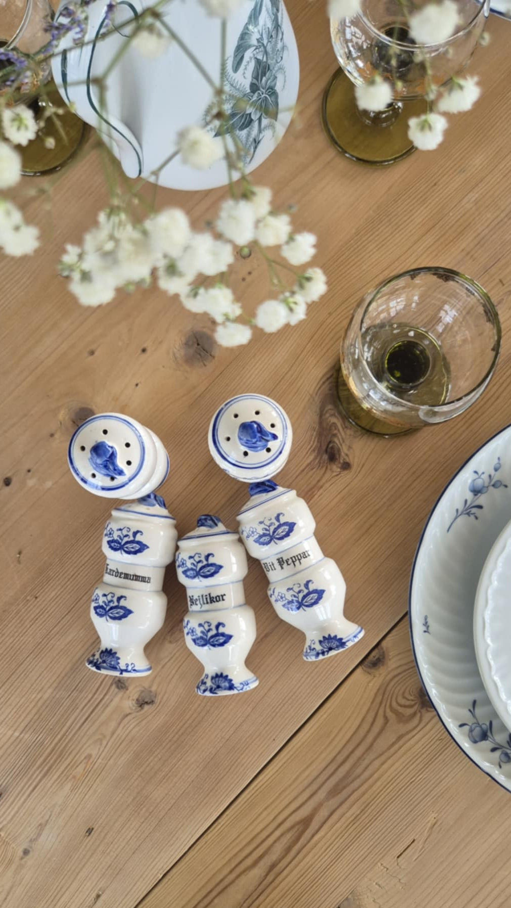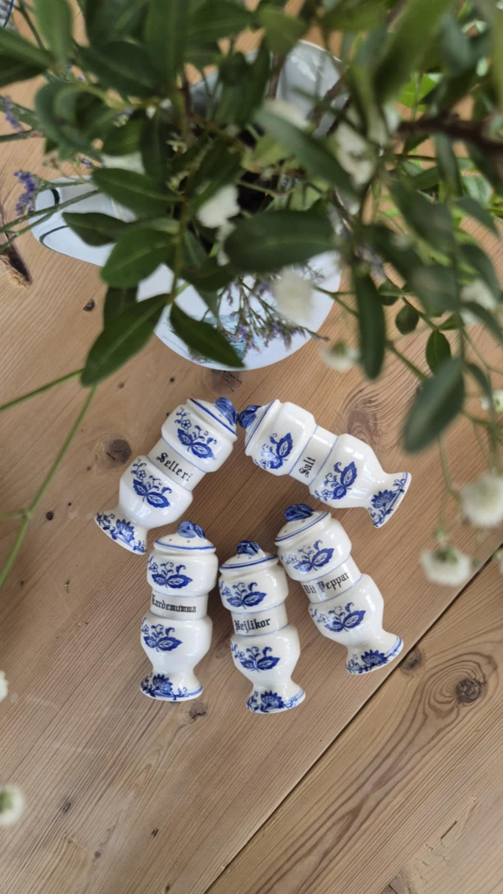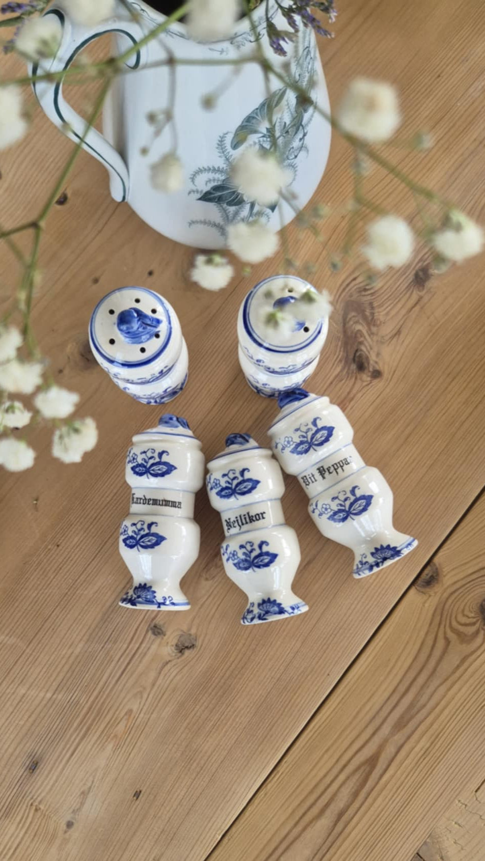 Ljuvliga gamla kryddburkar med historia. Fina som inredningsdetalj på en tallrikshylla men även användbara till kryddförvaring. Selleri, salt, vit peppar, kardemumma och nejlikor Mycket fint skick. Mindre bruksslitage förekommer som små krackeleringar. Säljs som ett sett med 5 stycken.