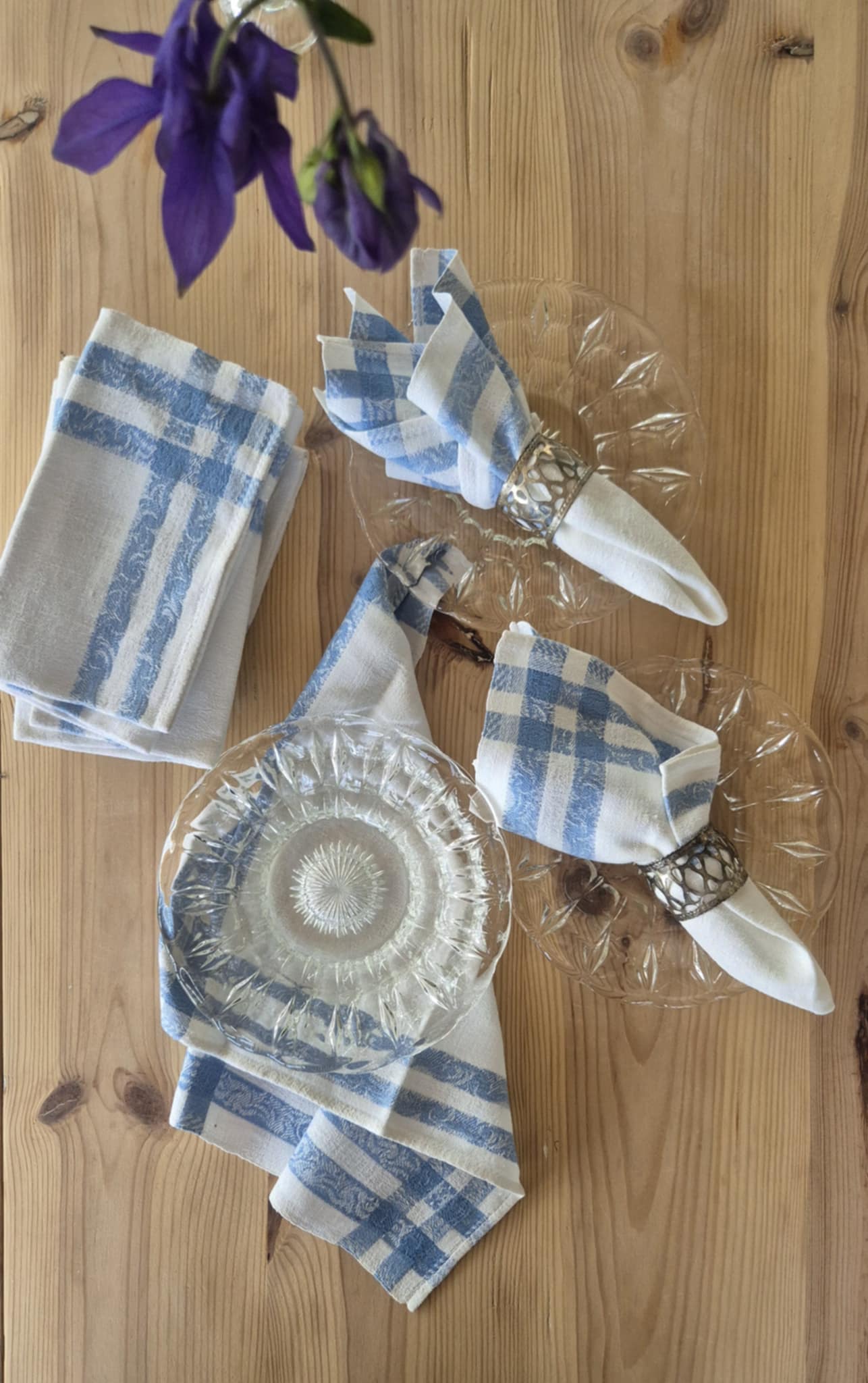 Blåvita linneservetter som ger en perfekt blandning av tidlös design och hållbarhet och av finaste kvalité. Tygservetter ger dukningen en ombonad och äkta känsla. Fint skick. Säljs i set om 5 stycken.