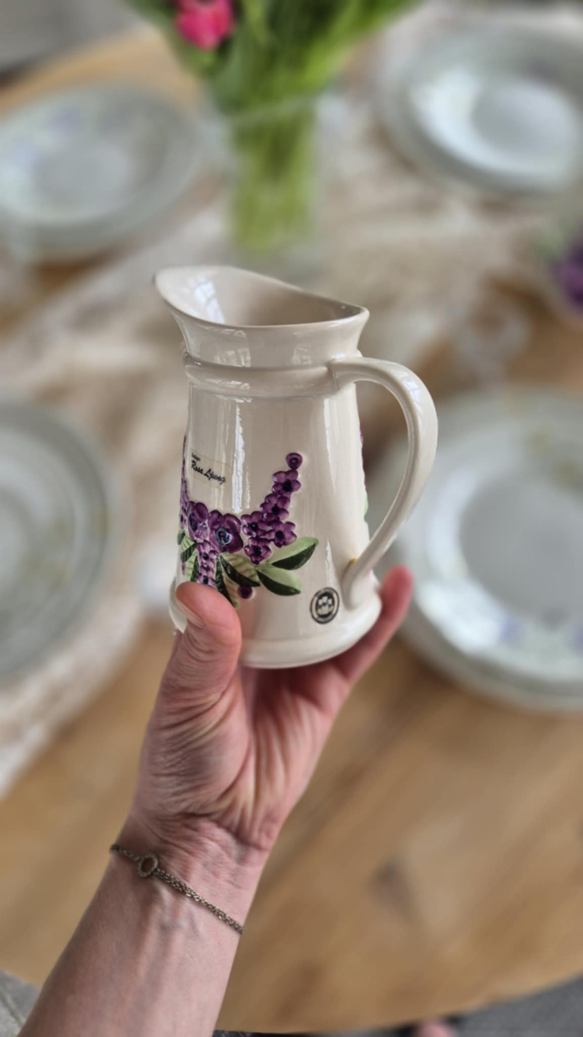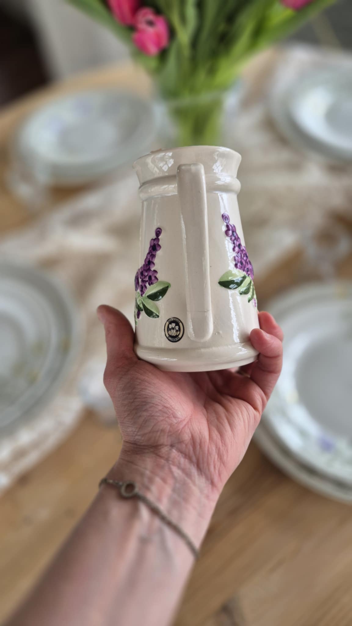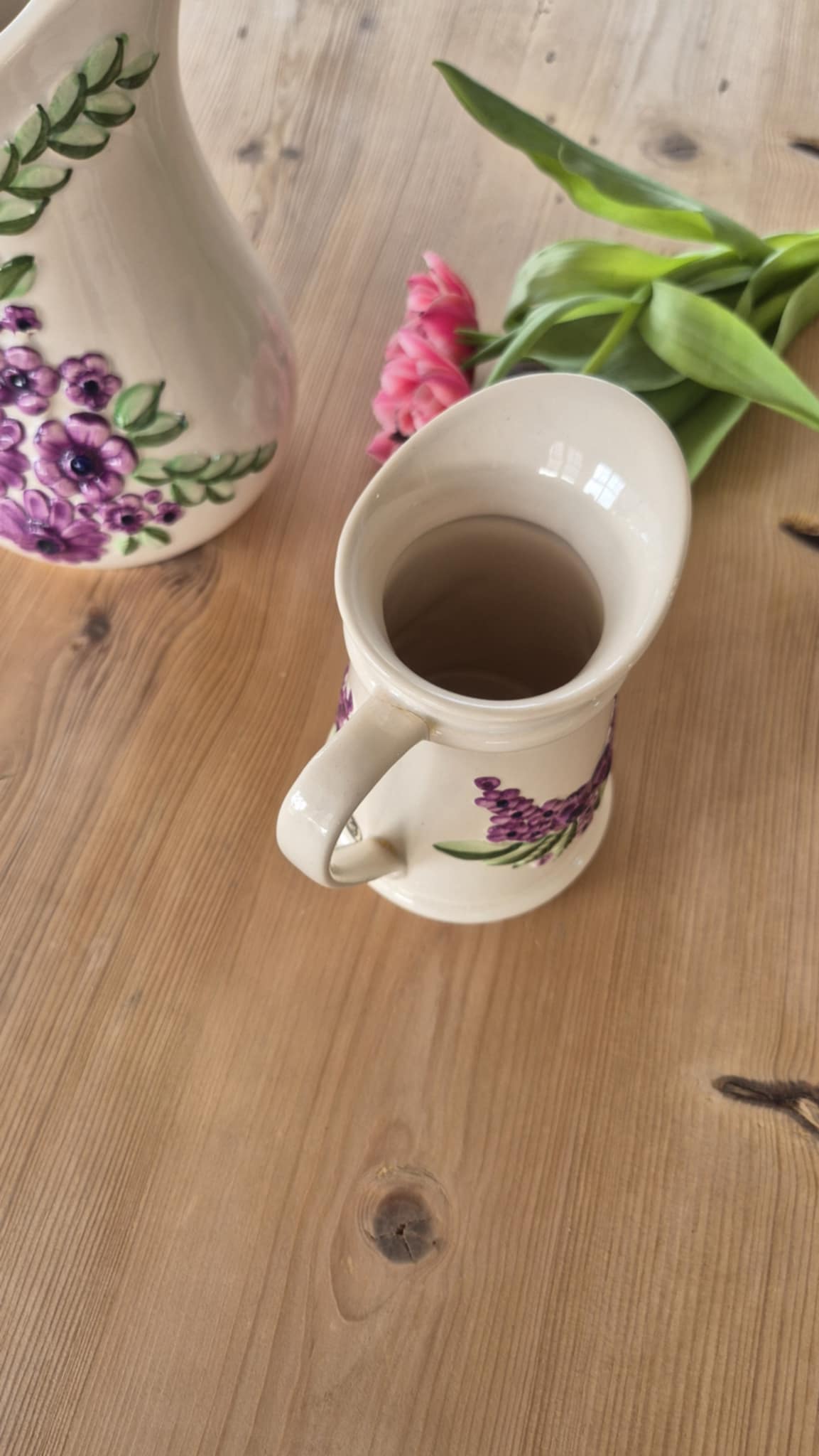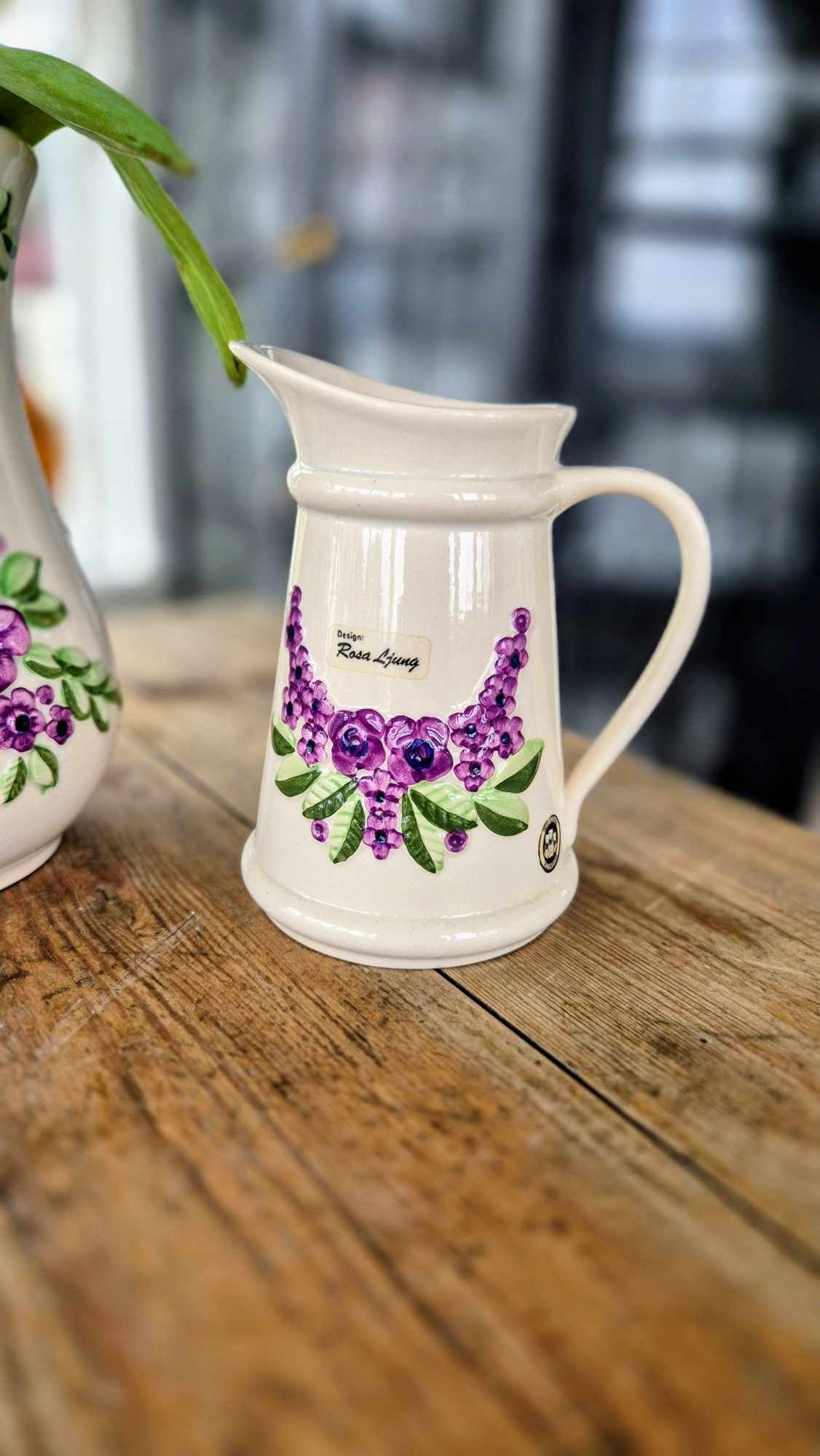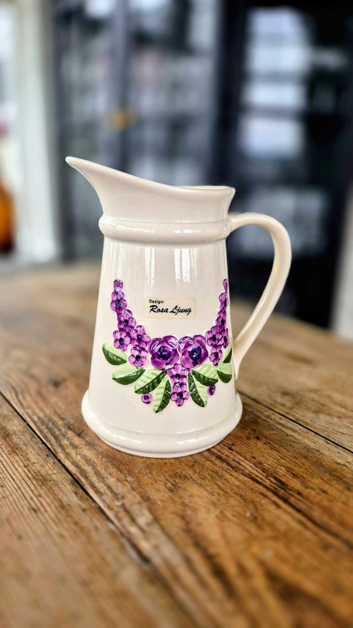Liten kanna i Rosa ljung. Fin som blomvas men även till dryck. Handtaget har en mindre lagning. Övrigt i fint skick.