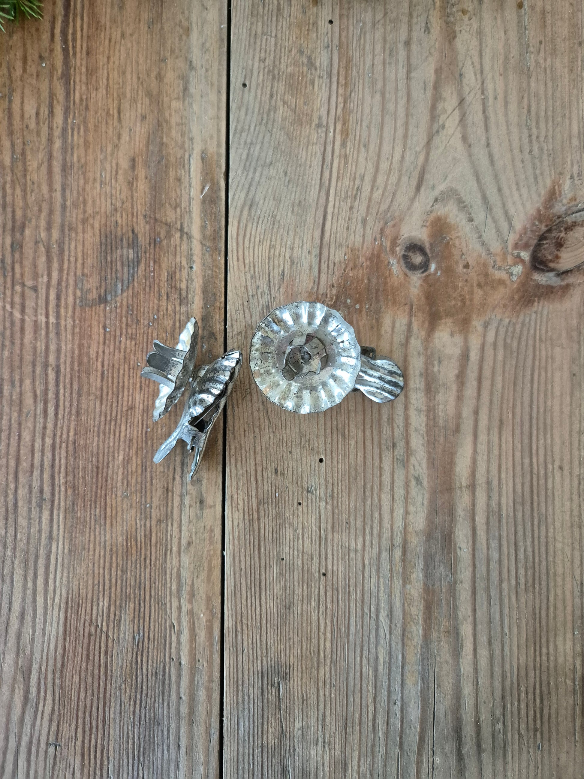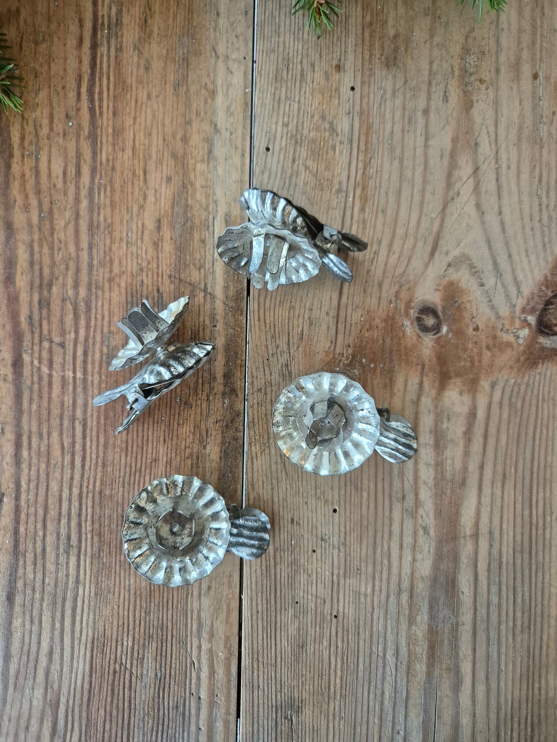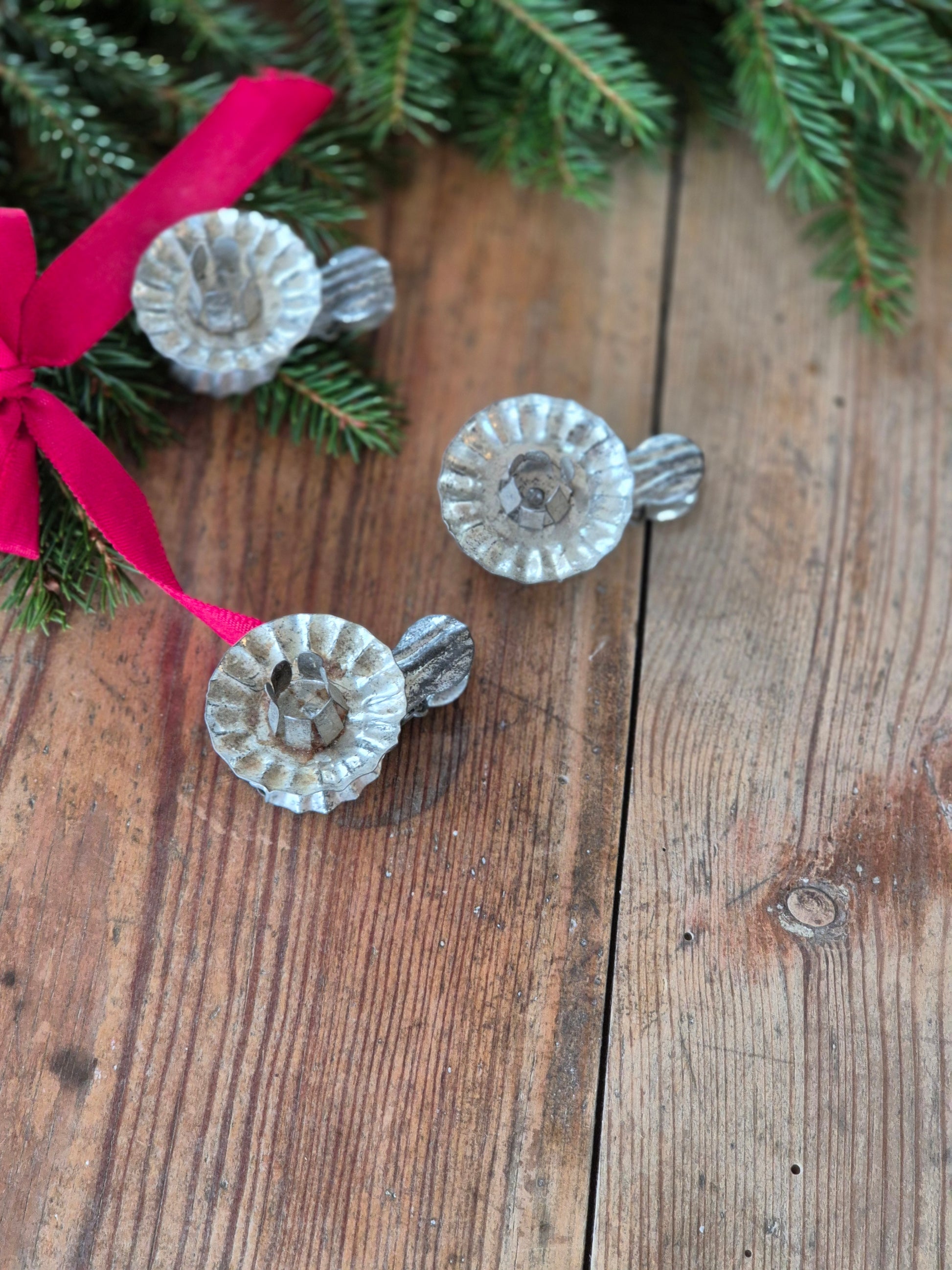 Vintage ljushållare för julgransljus. Fina att ha i julgranen med ett batteriljus eller levande ljus. Ljuvliga att använda till olika dekorationer i juldukningen. Sätt dem på granriset i mitten av bordet eller ge varje gäst ett litet ljus på sin tallrik. Fint skick med patina. Säljs som ett set om 6 stycken.