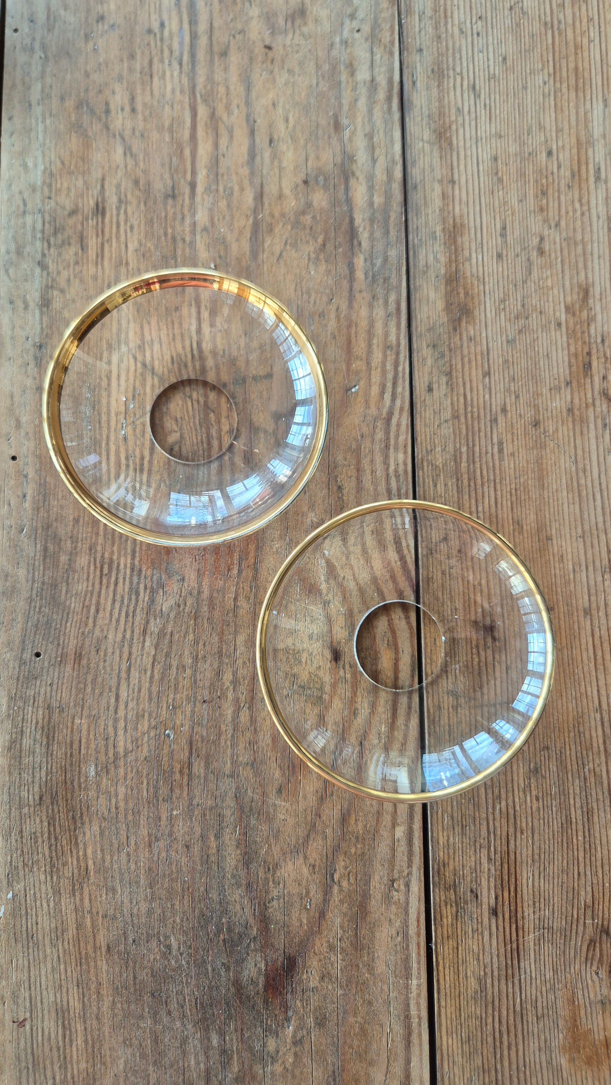 Vackra ljusmanshetter i glas med guldkant. Passar kronljus. Säljs som ett par.