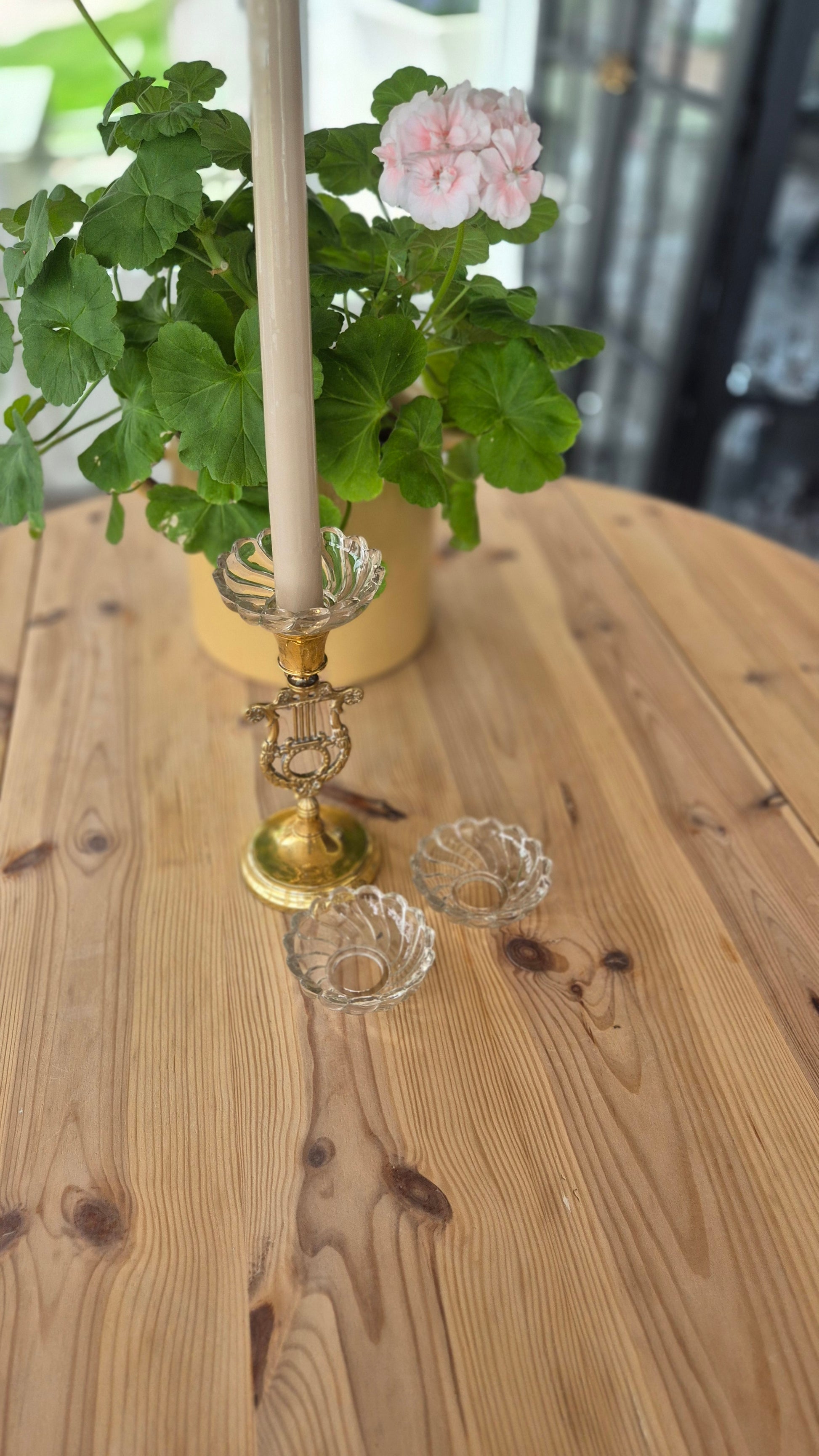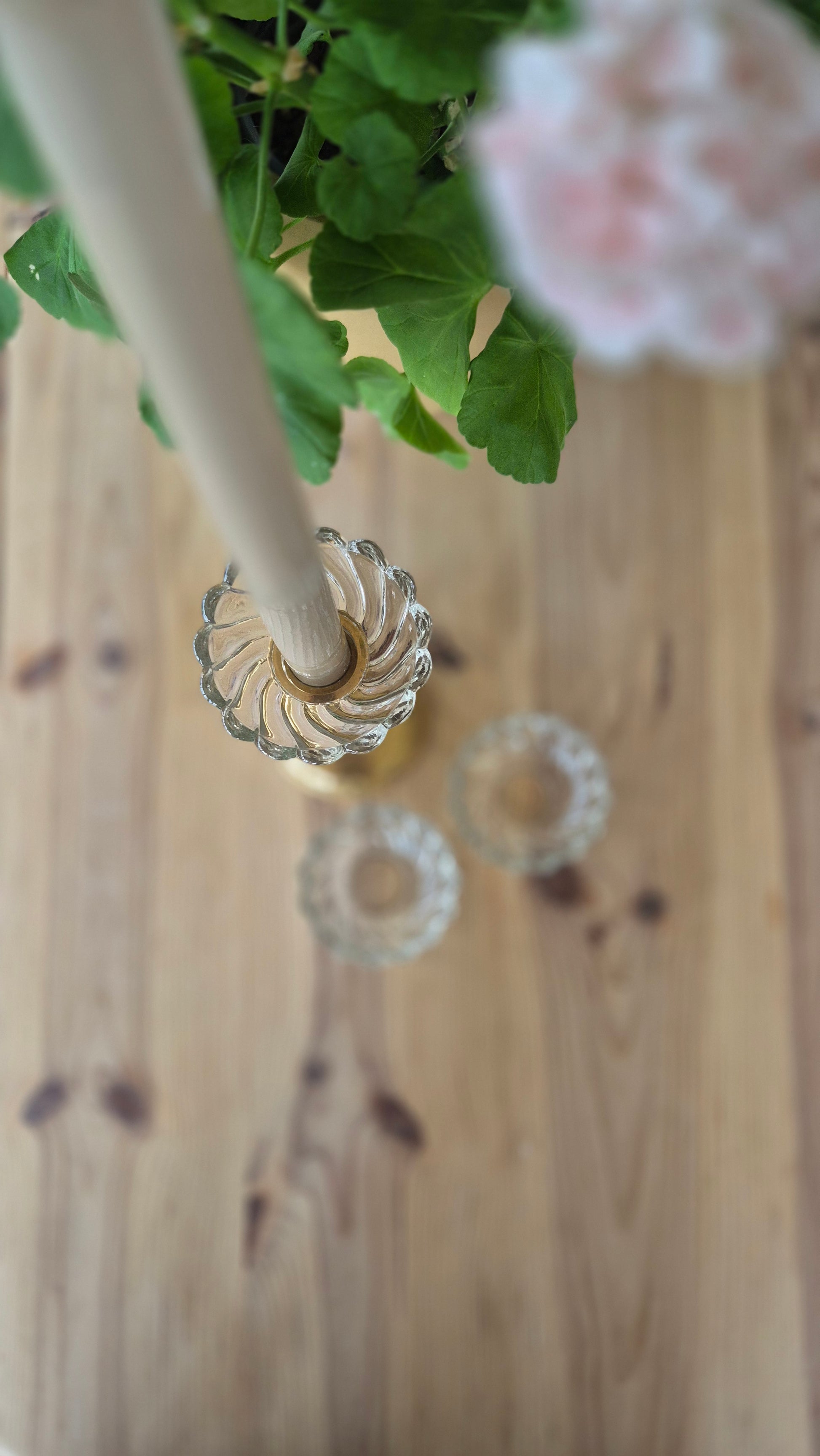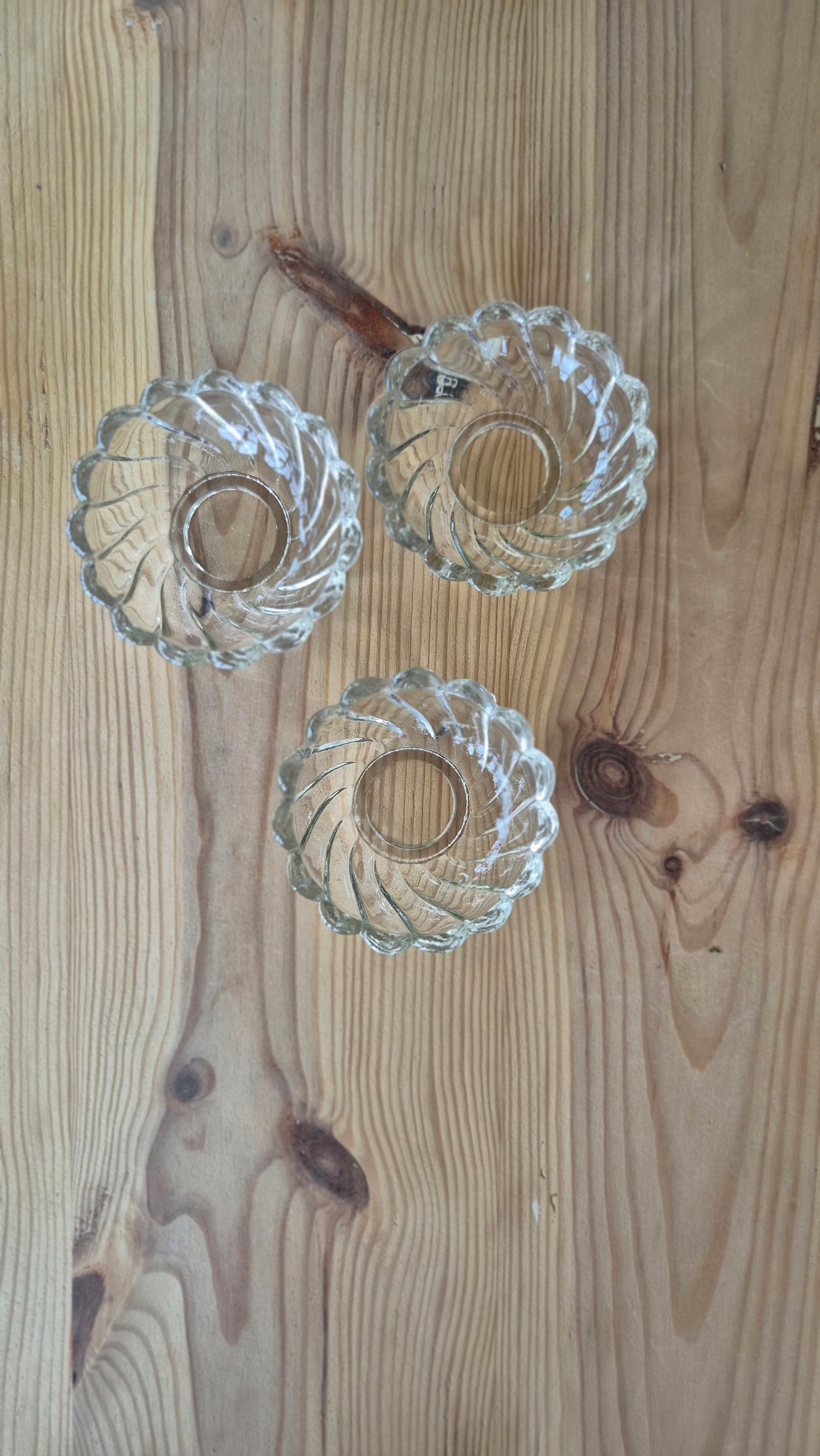 Ljusmanschetter i glas för kronljus. En manschett har ett svart märke. Fint skick i övrigt. Säljs i set om 3 stycken.