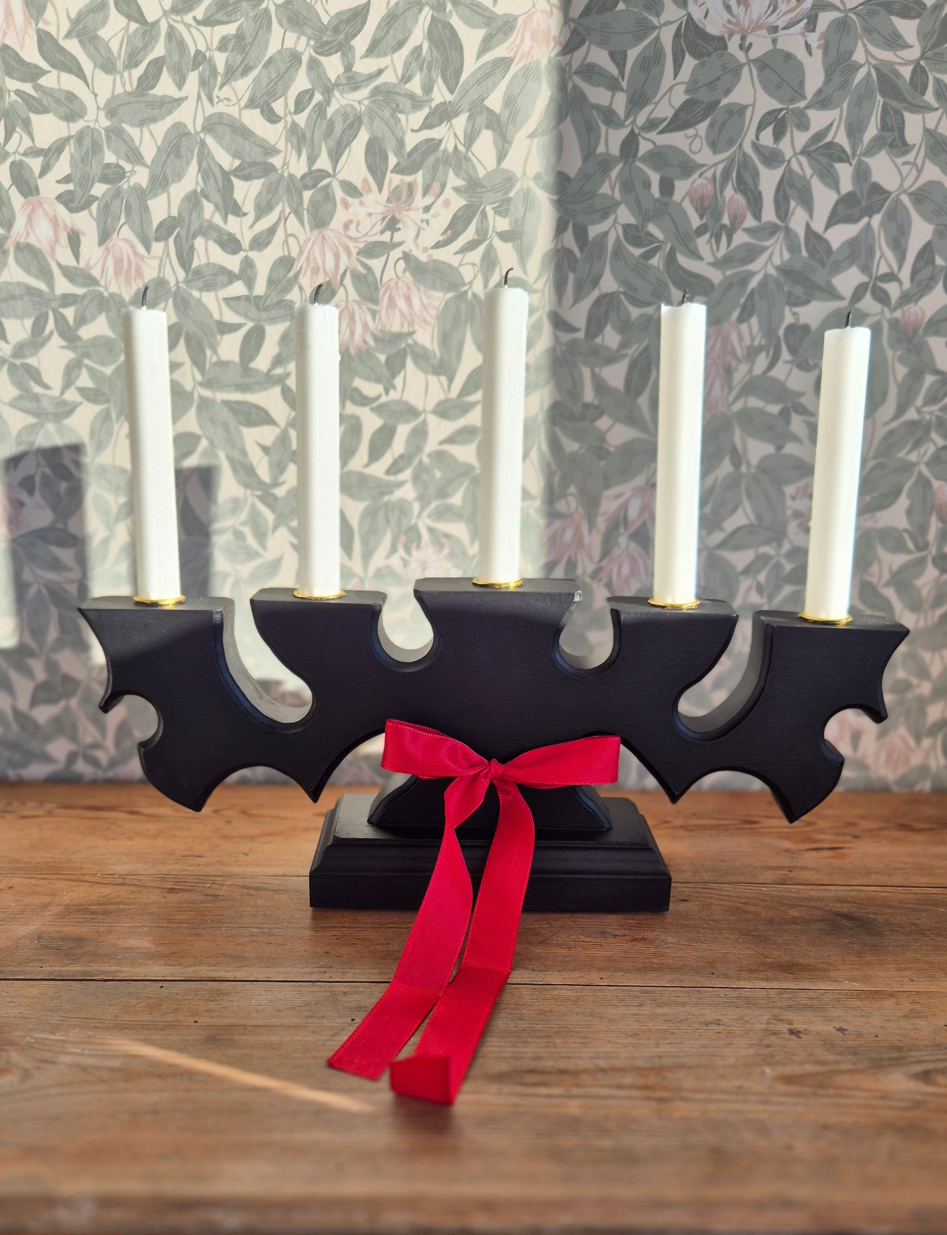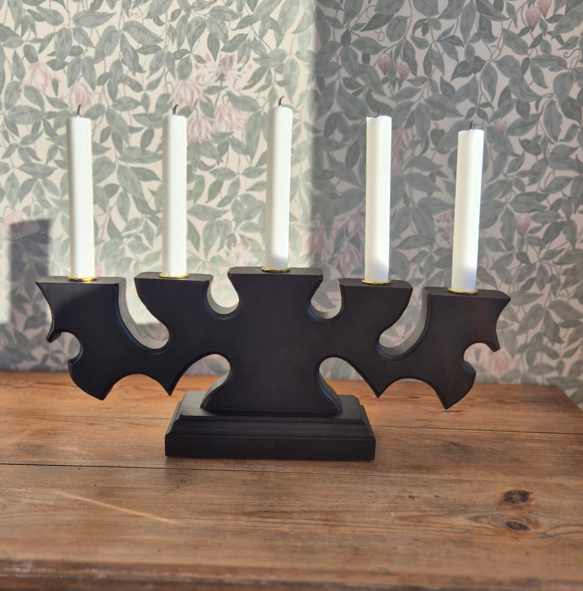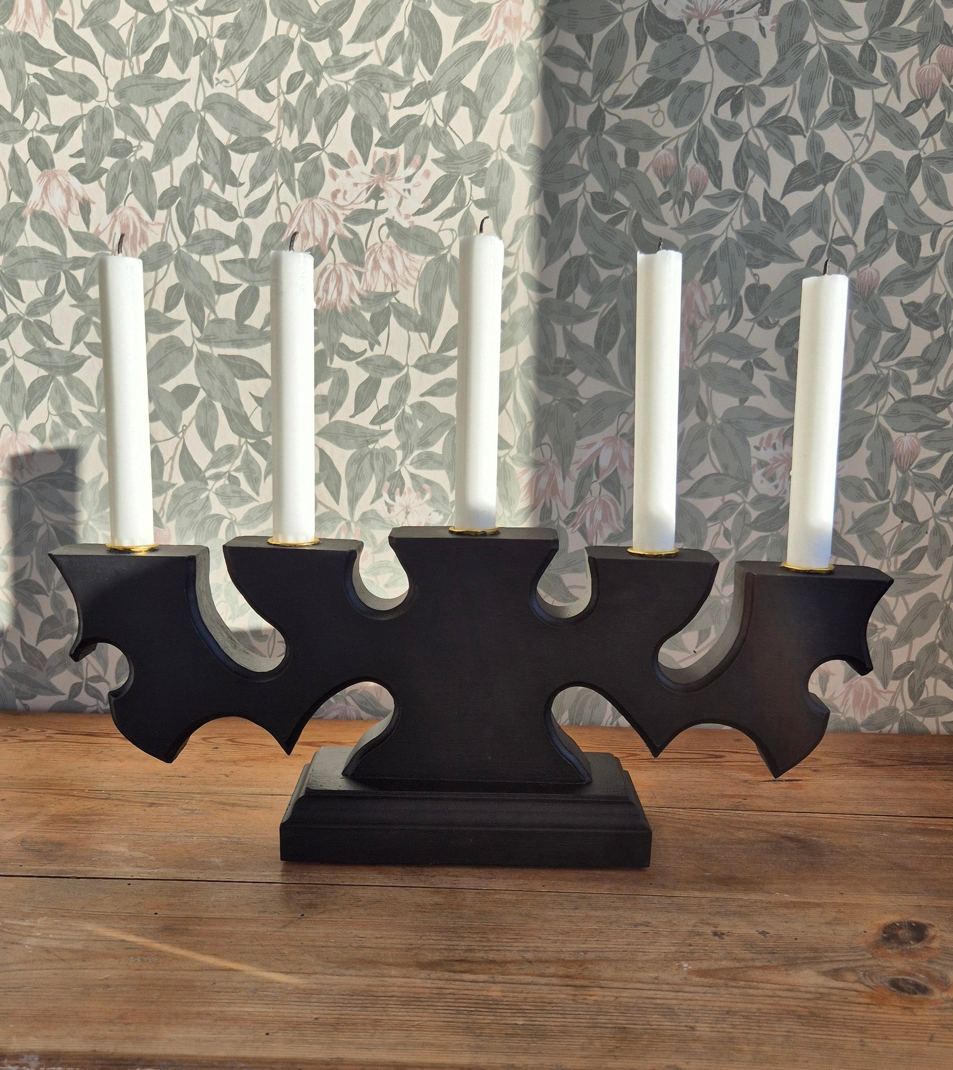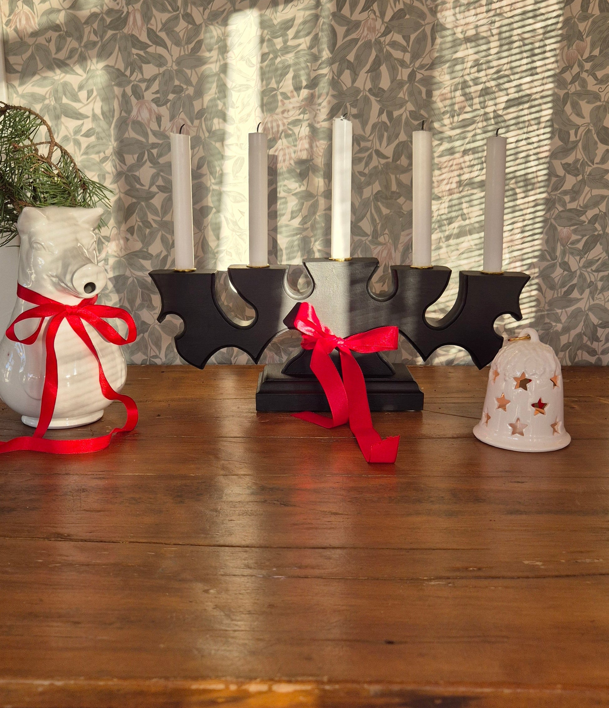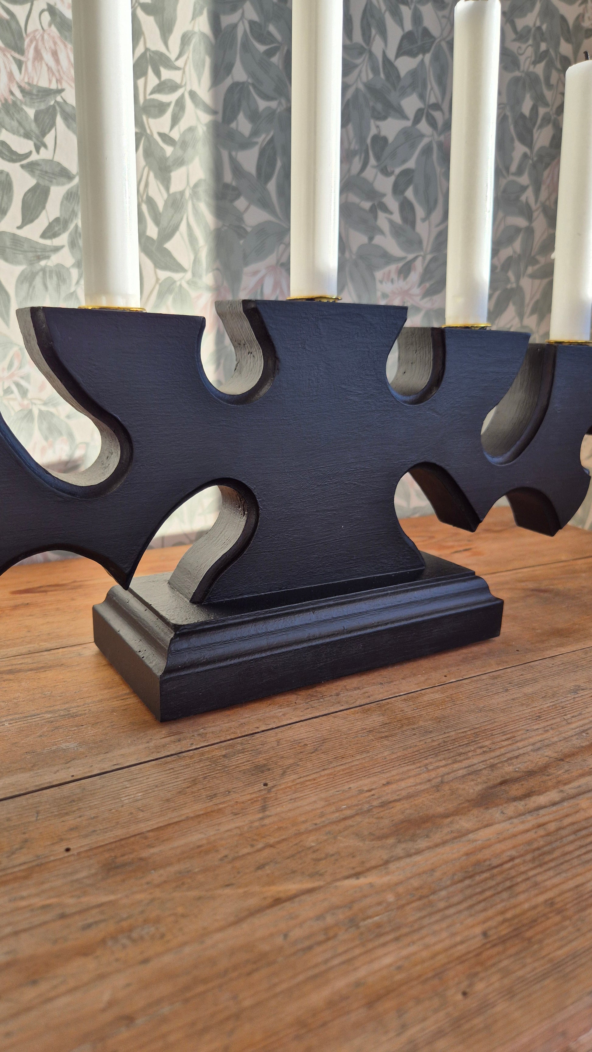 Stor träljusstake målad i en mattsvart kulör i klassisk stil med en modern touch. Snygg tillsammans med mörkröda ljus eller ett sidenband. Lika snygg i sin enkelhet med vita ljus.