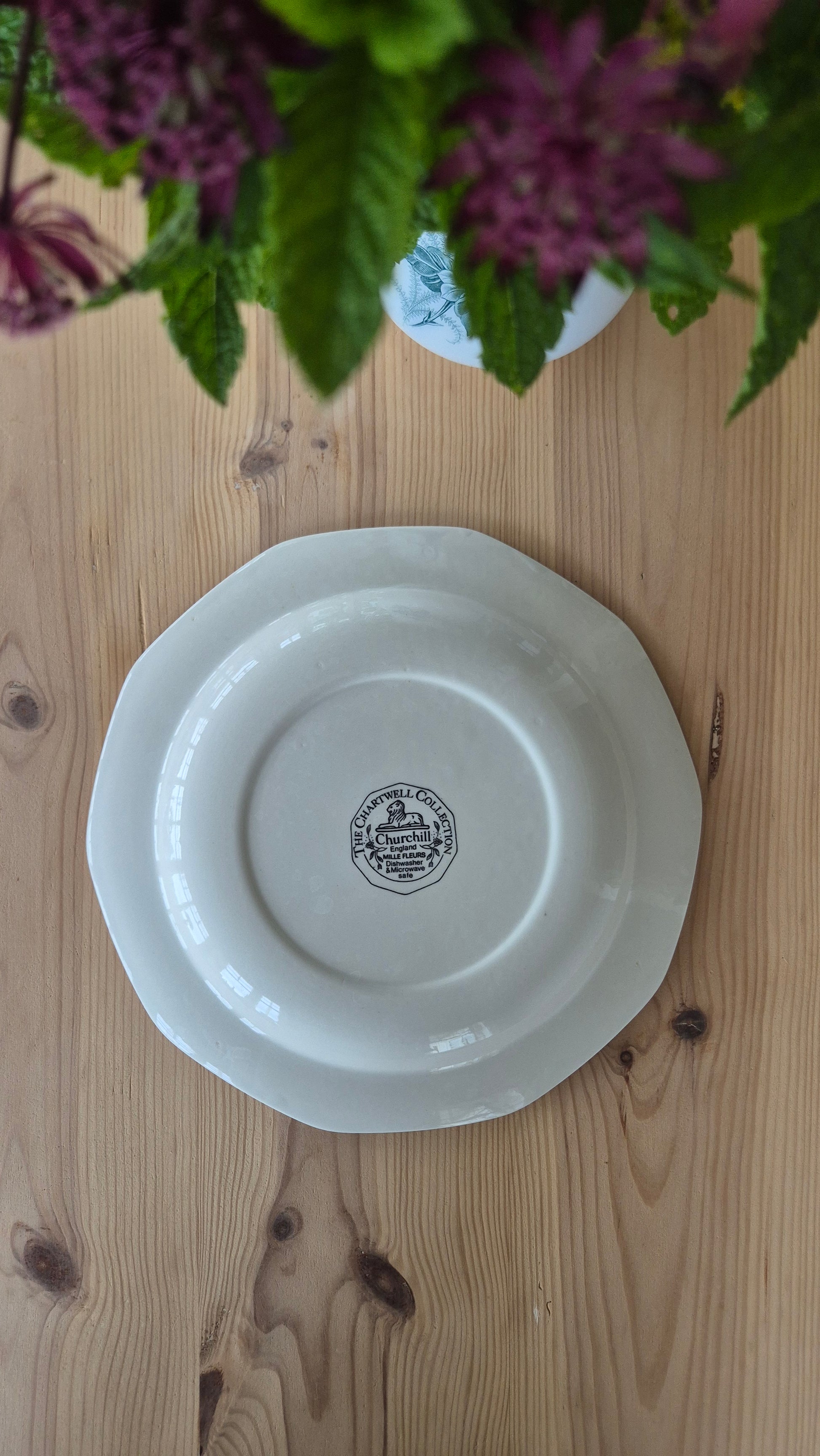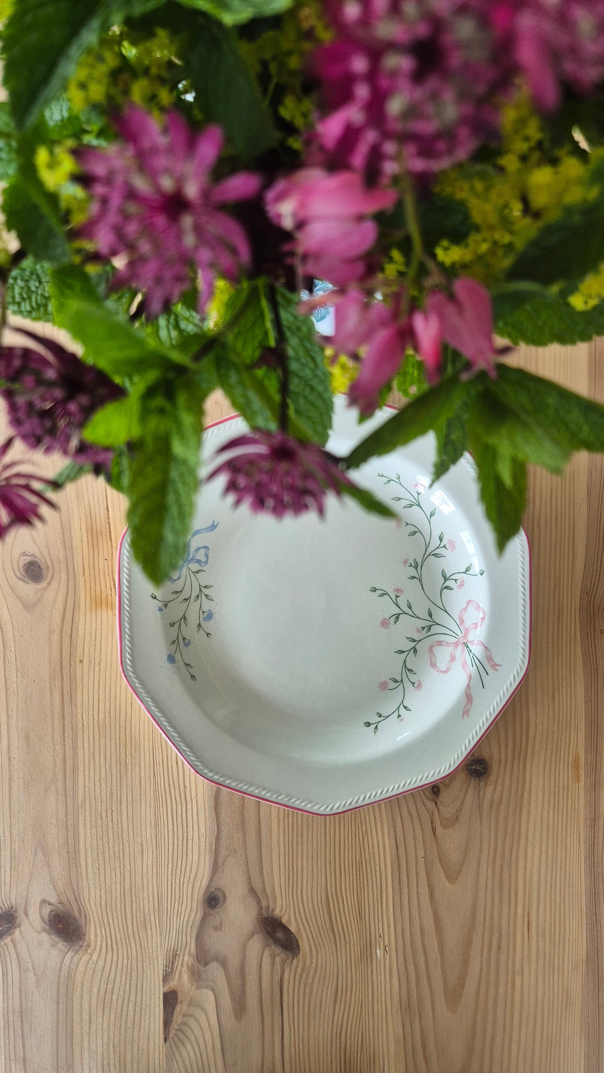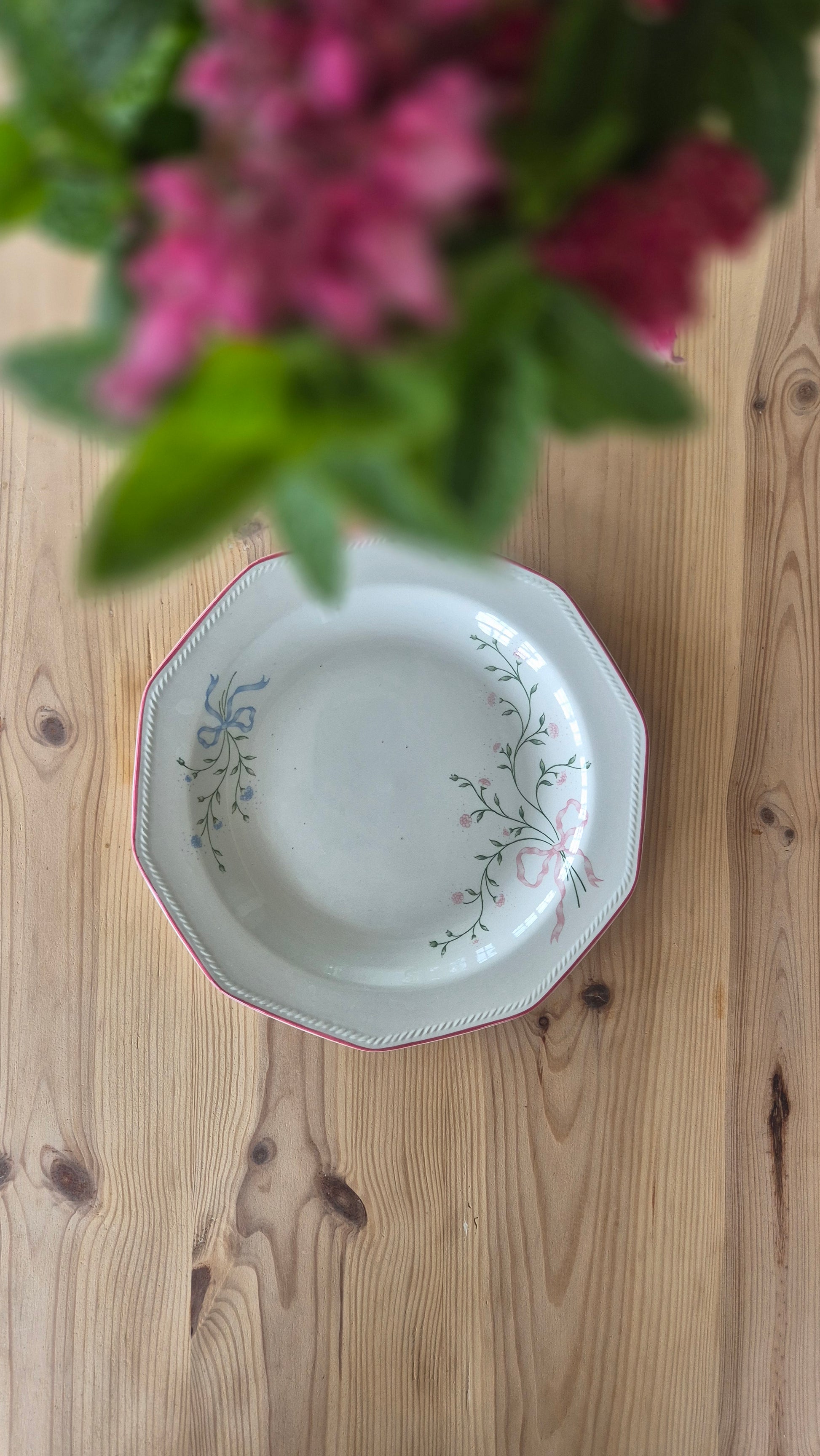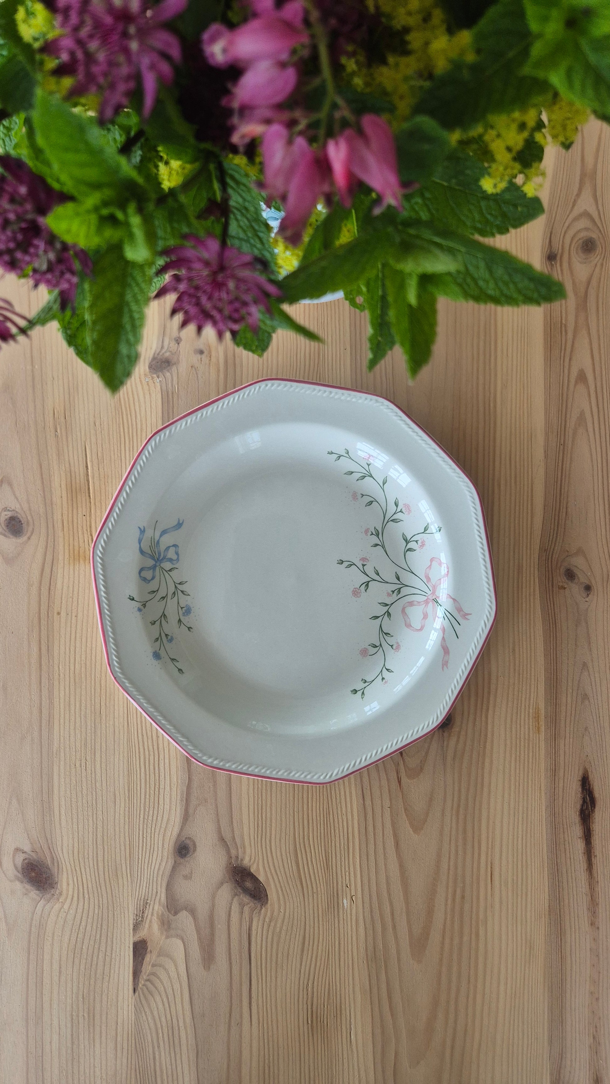 Mattallrik med rosa kant och rosett i pudrig rosa och blå. Ljuvliga att duka upp med till sommarens kalas. Märket är Engelska Churchill. Finns fler delar i samma serie. Fint skick. Säljs styckvis. Välj hur många du önskar.