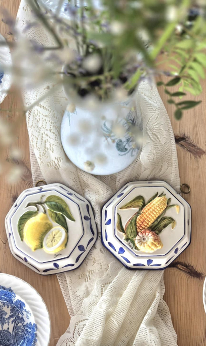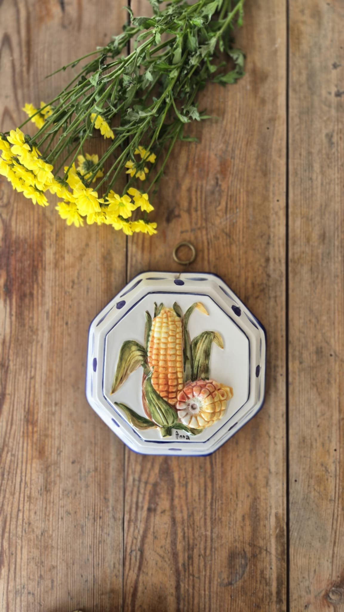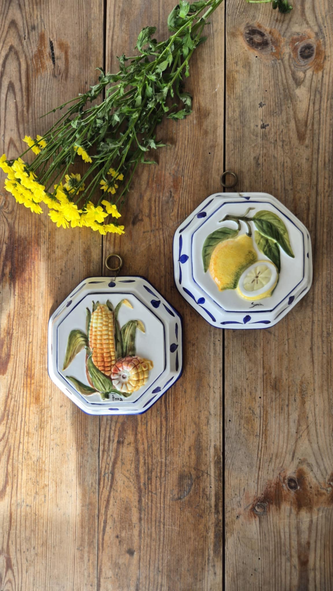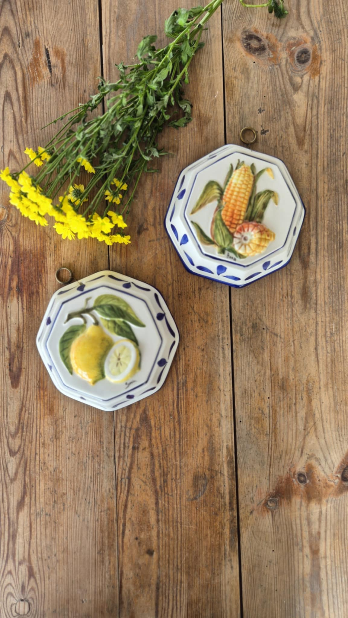 Söta små medelhavsinspirerade formar i porslin för upphängning på vägg. Majs och citron. Det står Anna och Sonia med små bokstäver. Upphängning med mässingsfärgad metallhänge. Säljs som ett par.