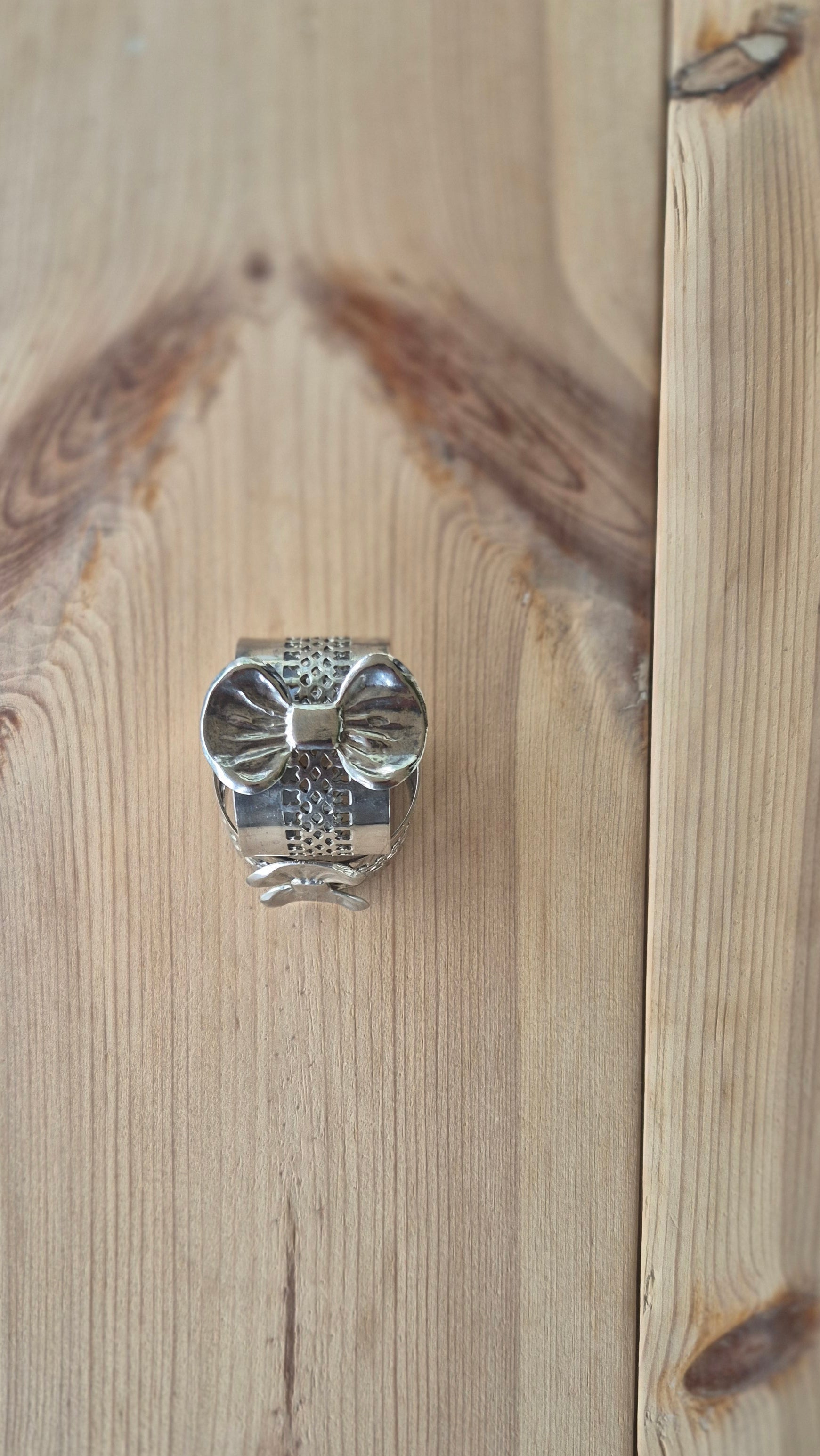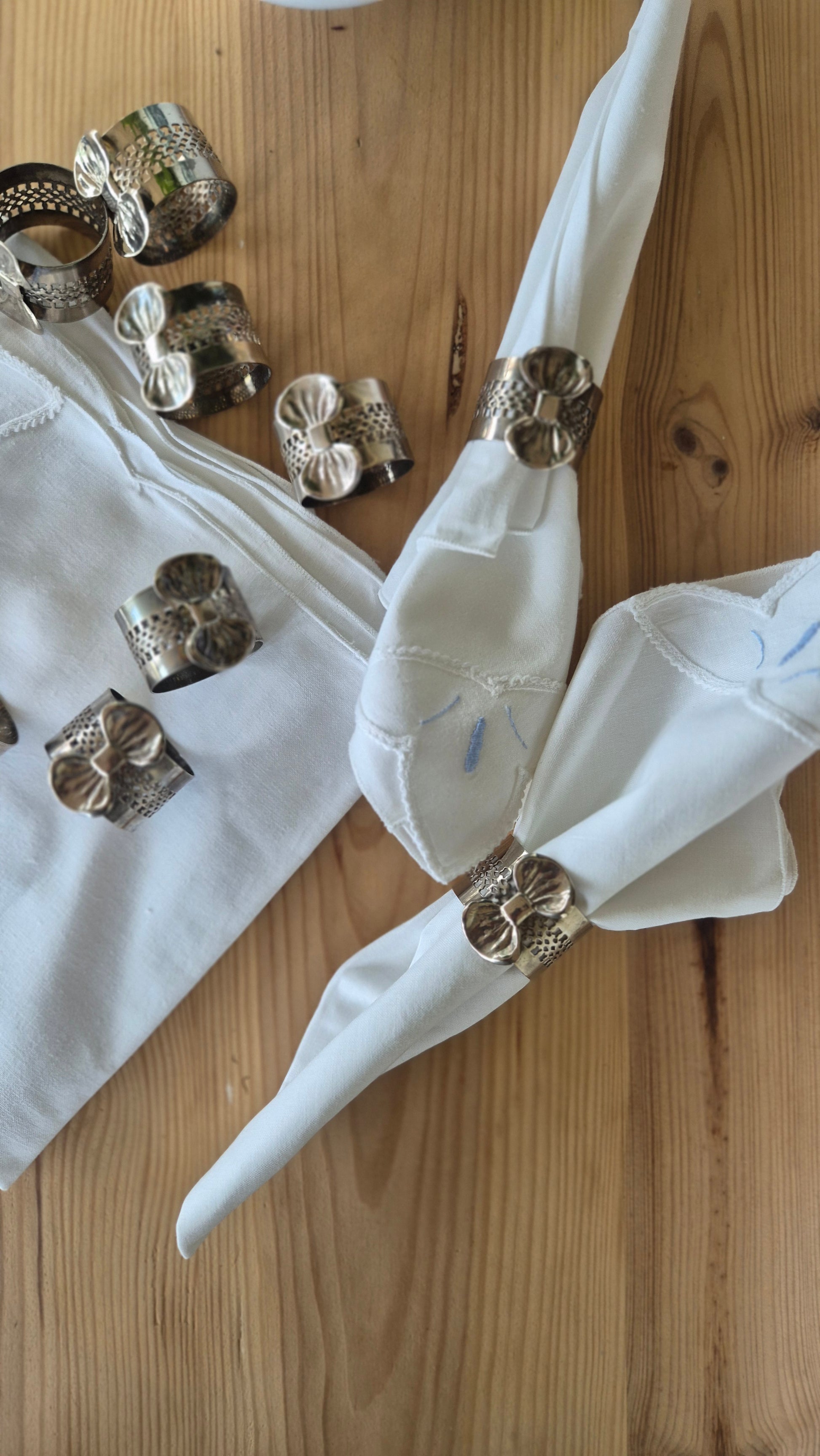 Vackra servettringar med rosetter i nysilver. Fint skick med patina. Säljs i set om 4 stycken. Ange hur många set du önskar.