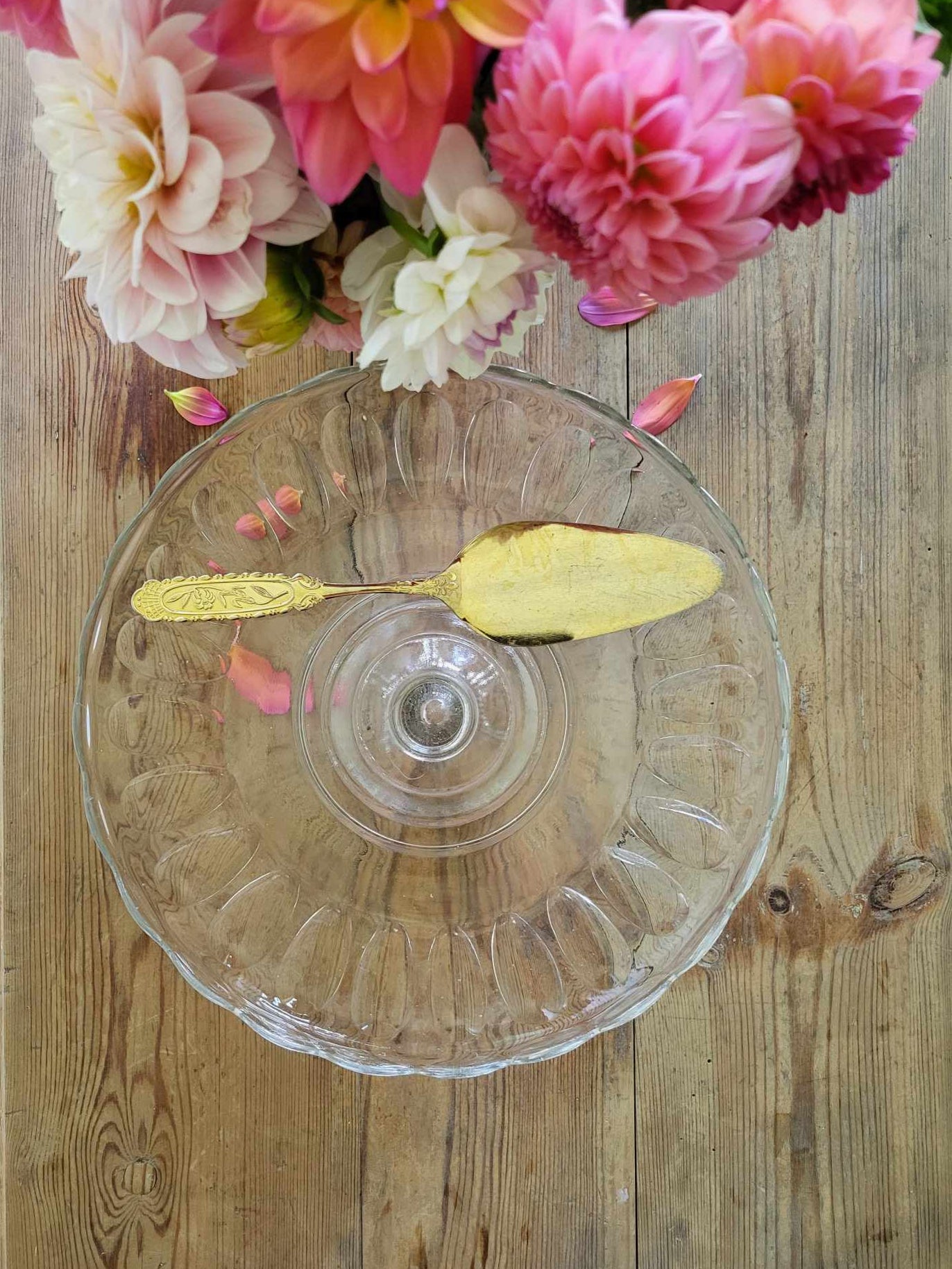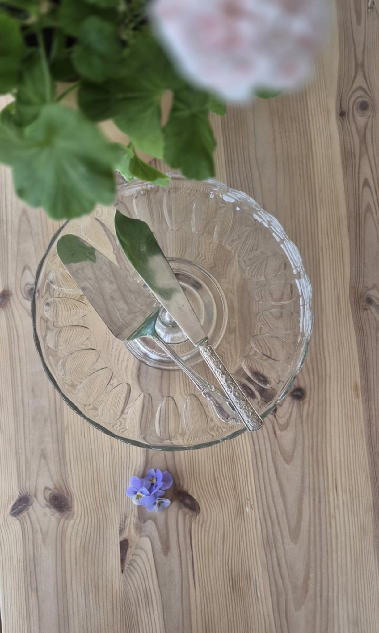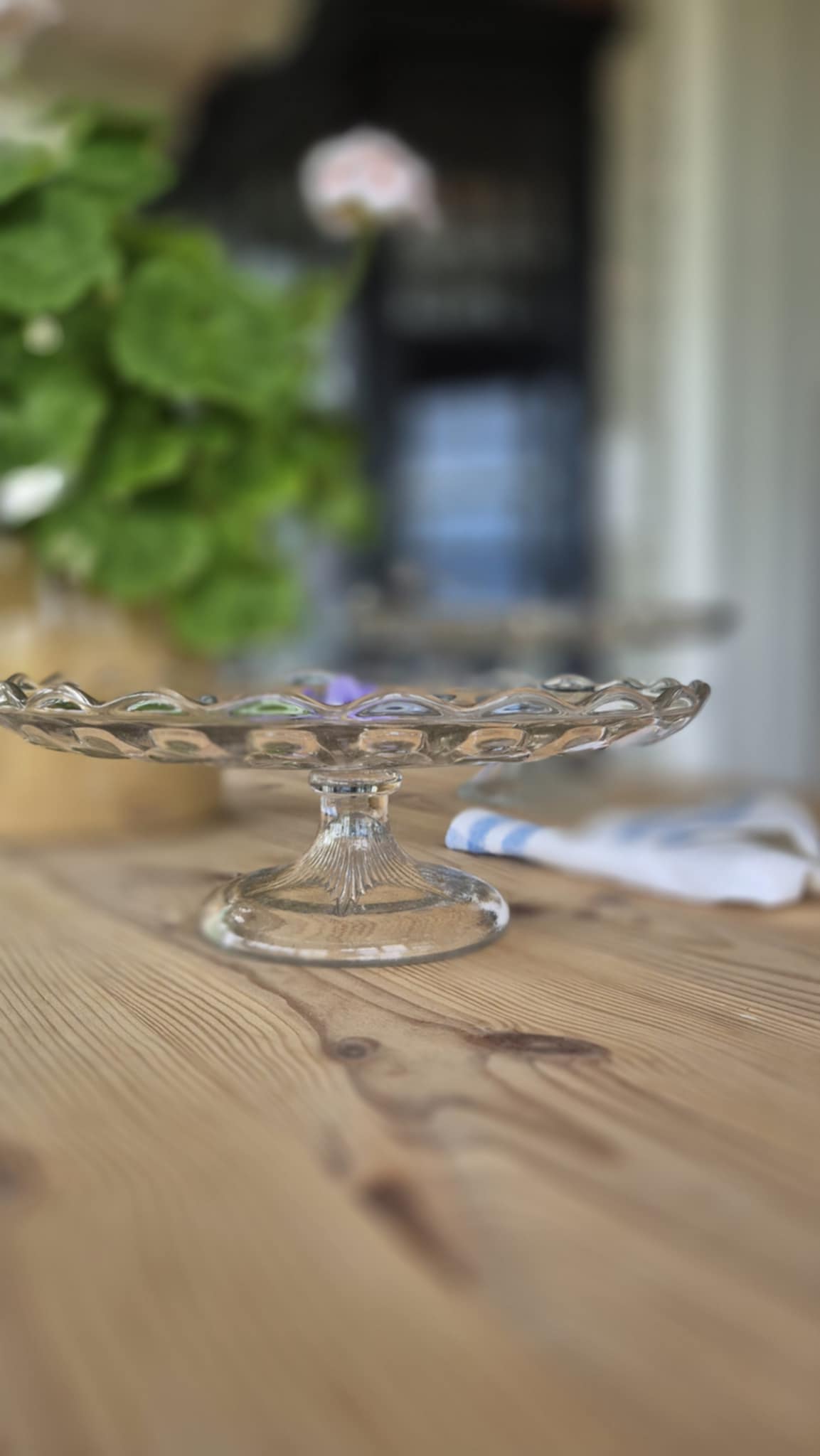 Vackert glasfat på fot med snygg volangkant. Perfekt till servering av tårta, kakor eller andra godsaker.