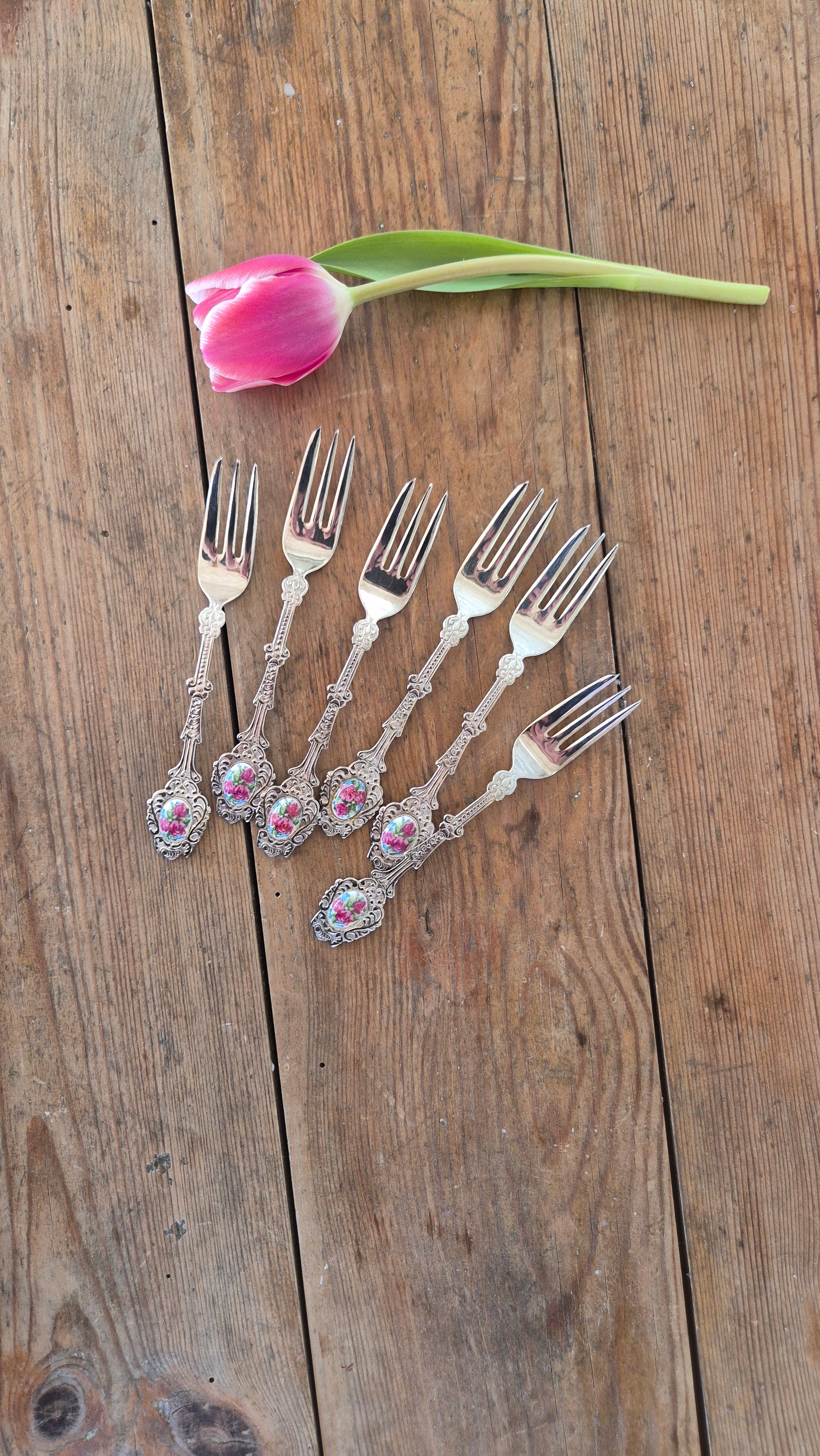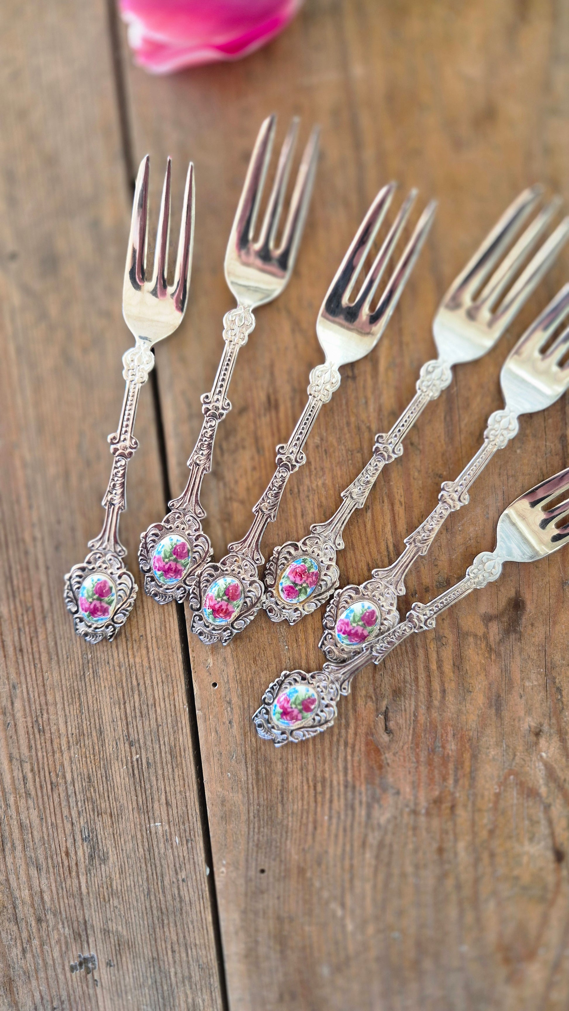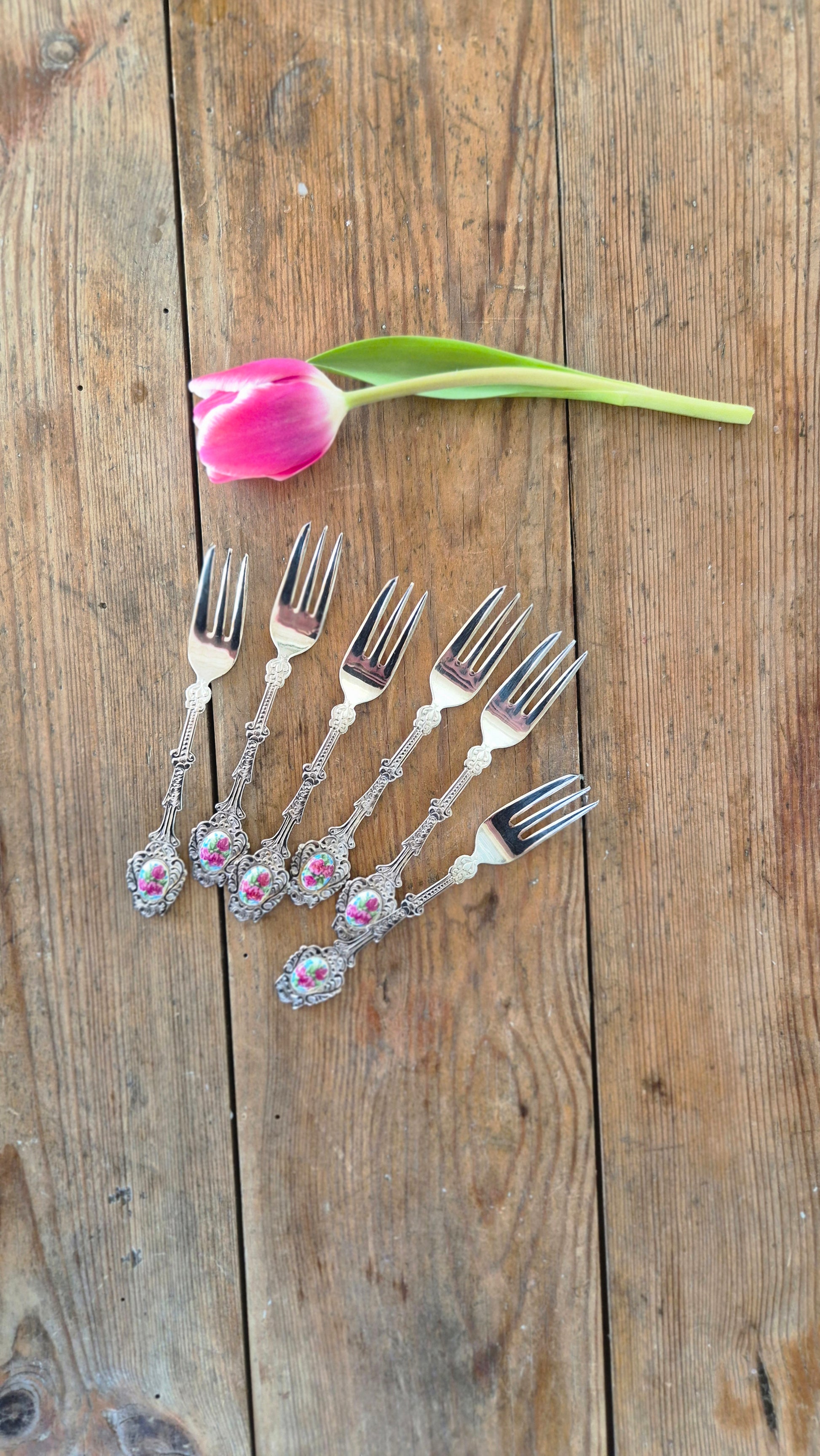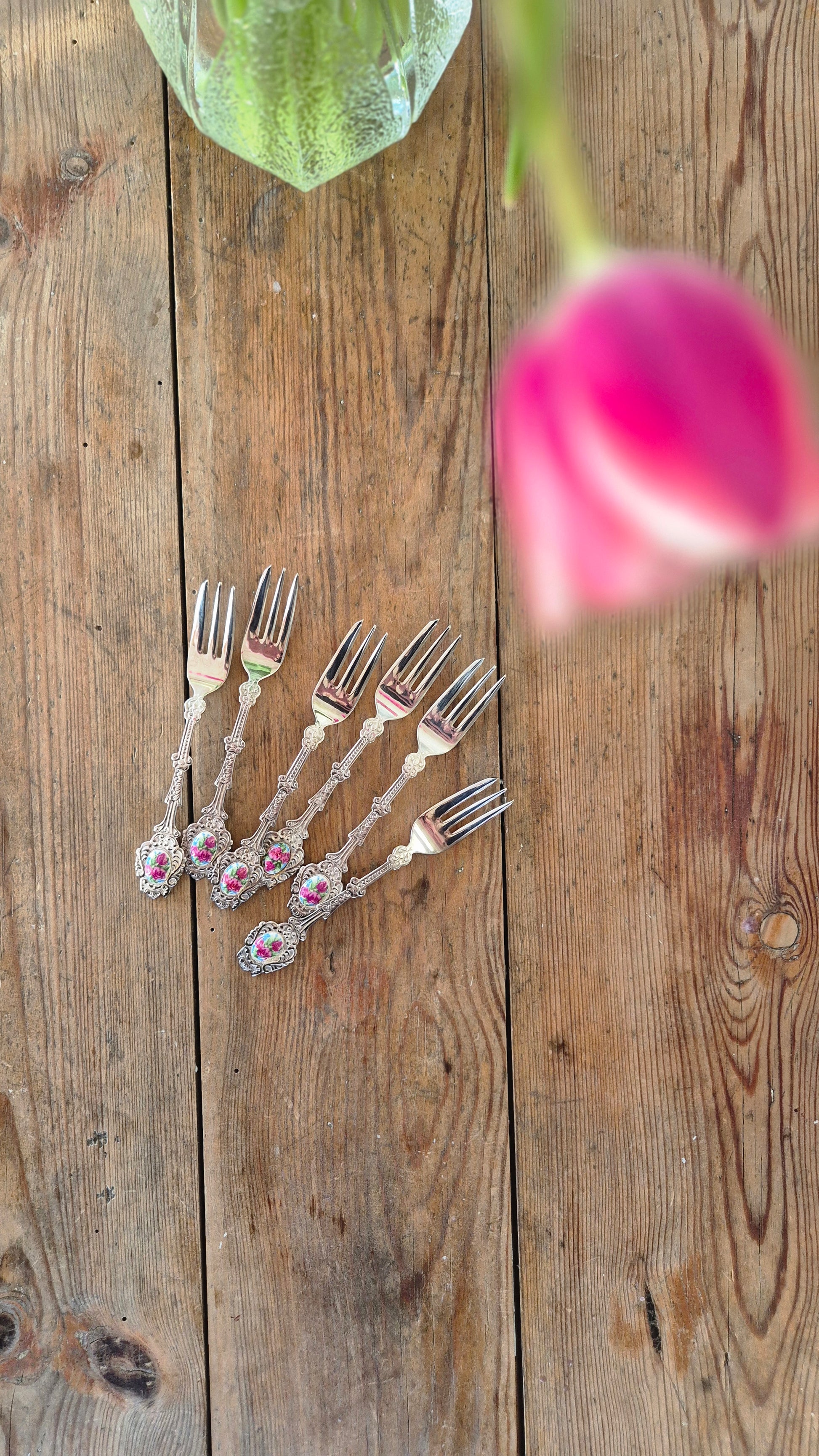Tårtgafflar i nysilver med blommig porslinsdekor på skaftet. Fint skick. Säljs som ett set med 6 stycken.