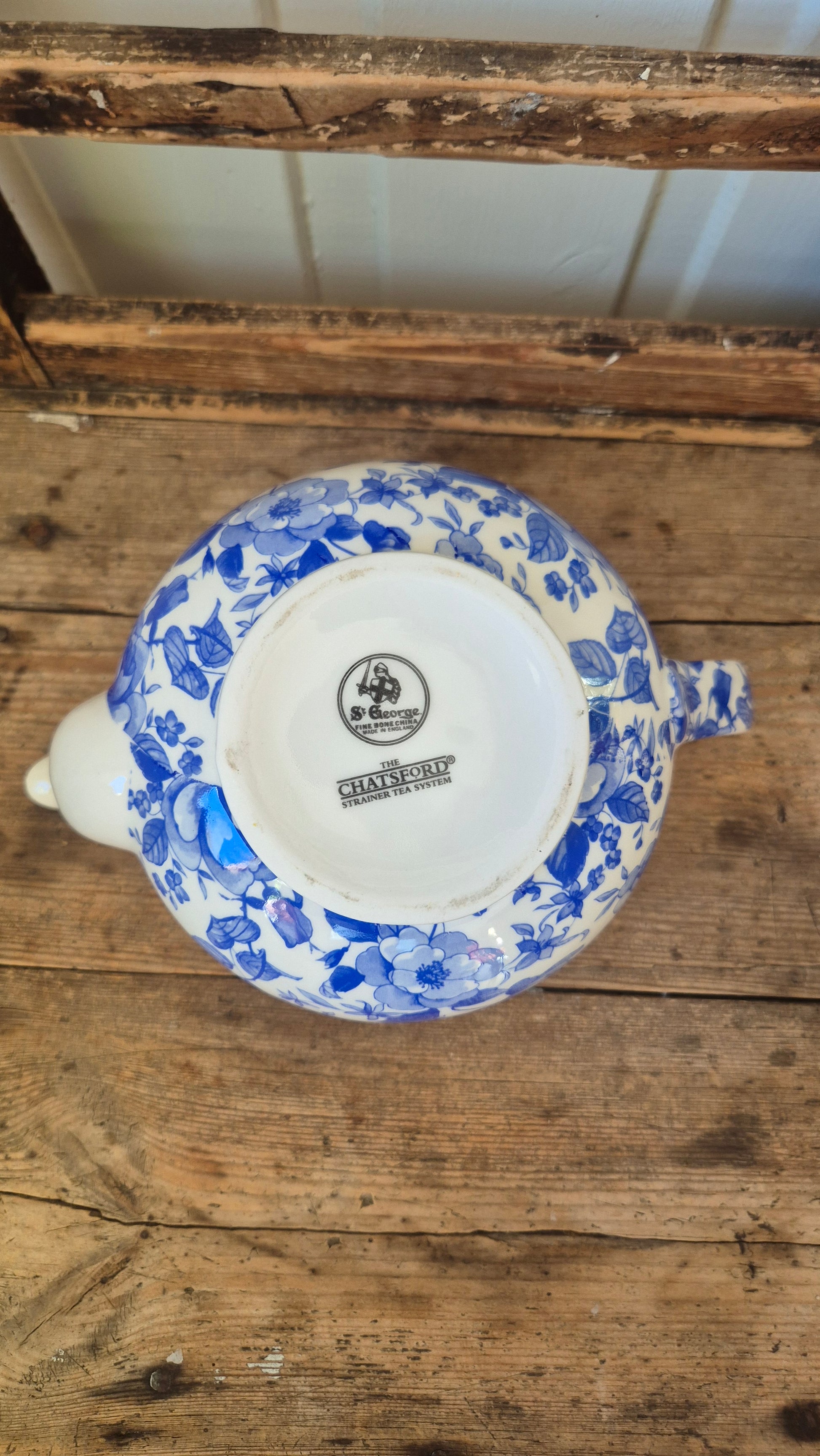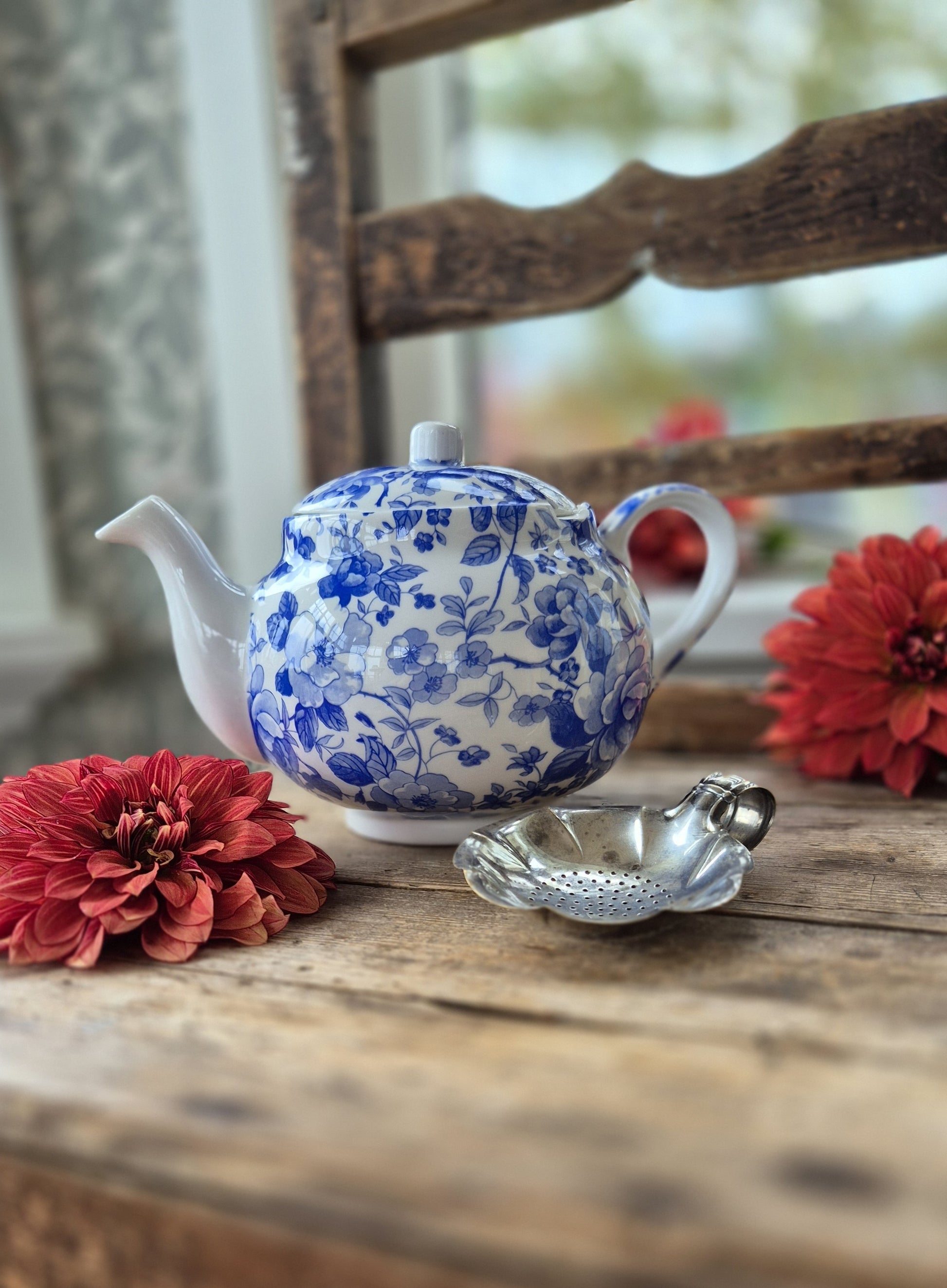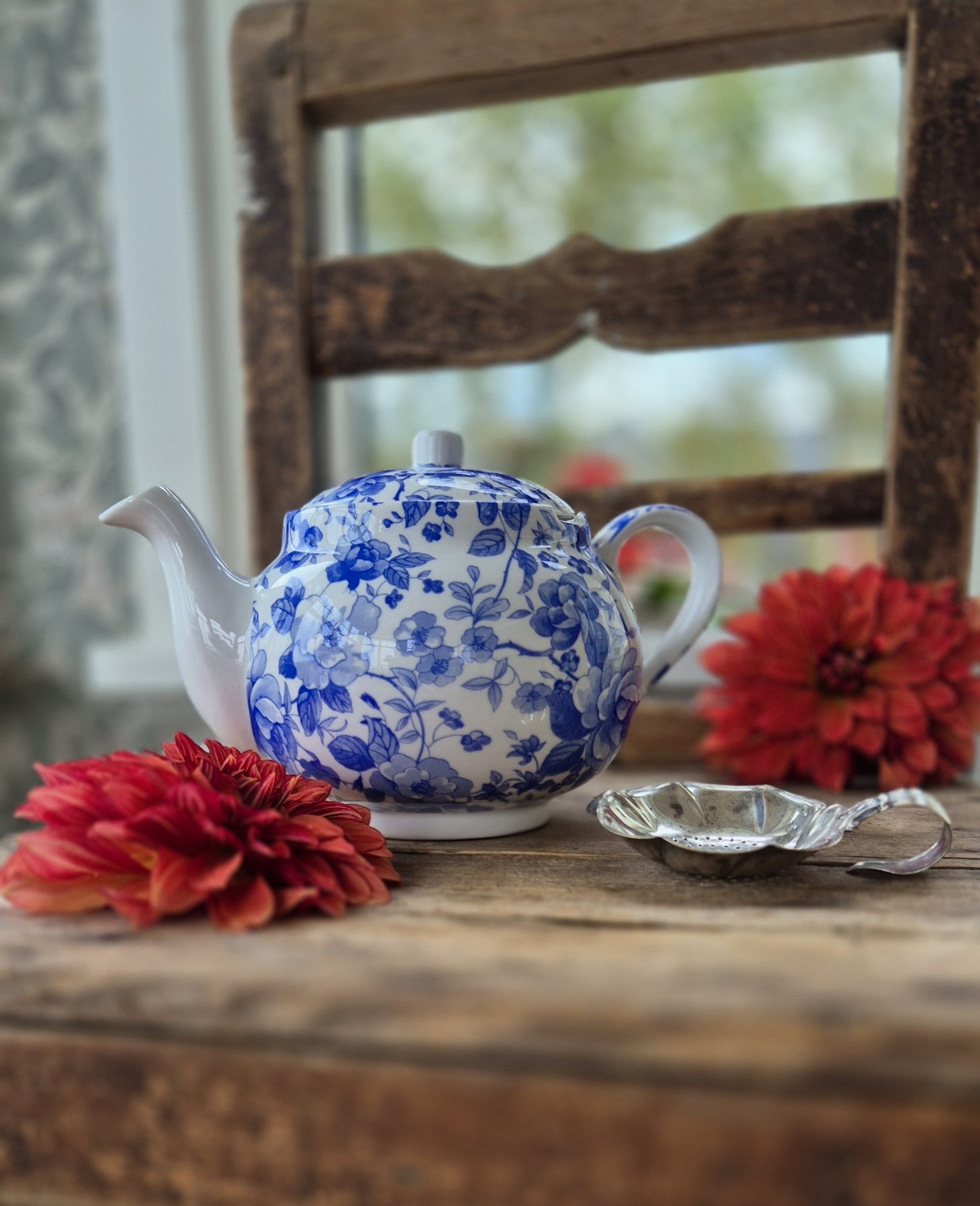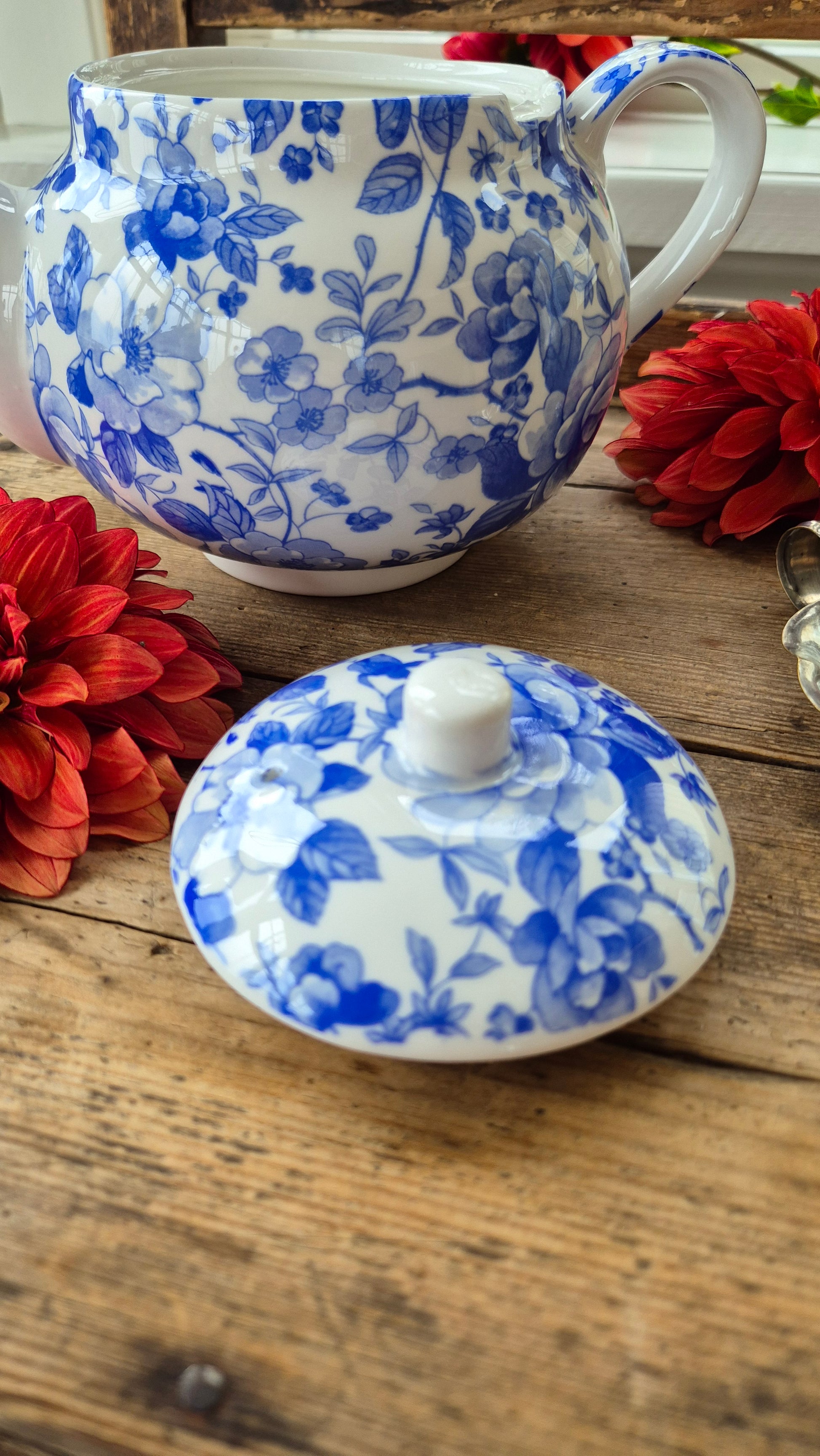 Blåvit tekanna med ljuvligt blommigt mönster med engelskt ursprung. Fint skick.