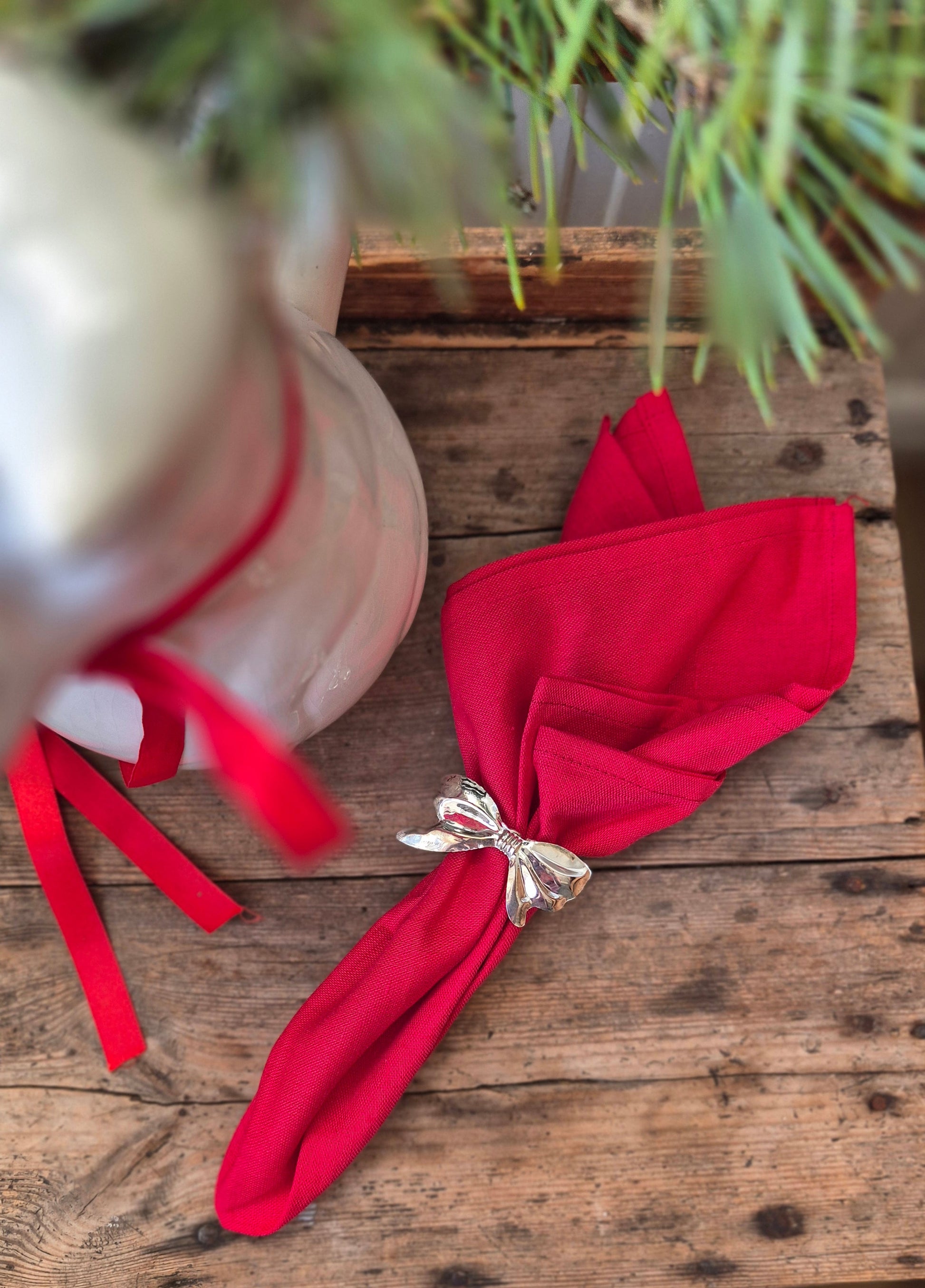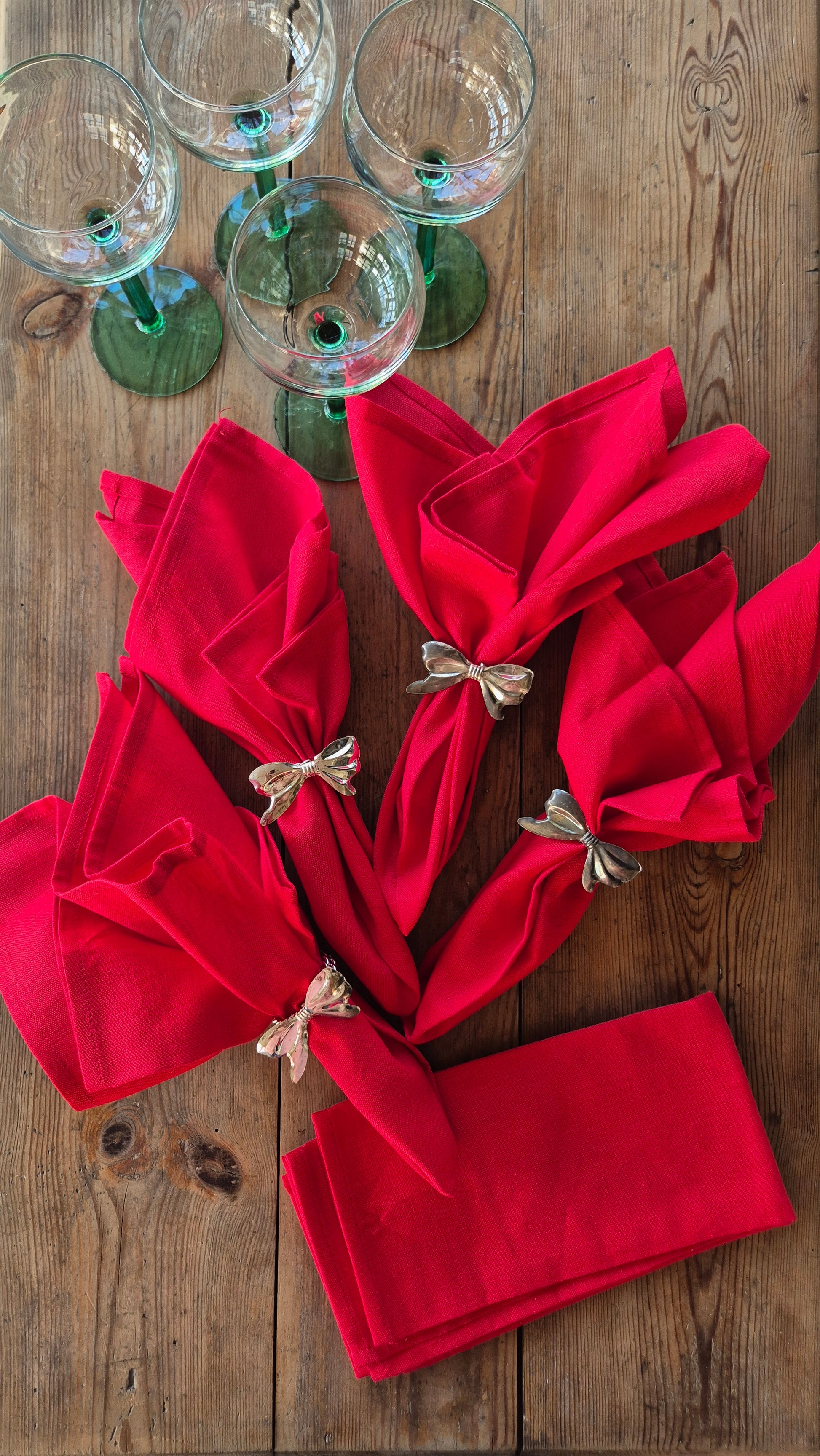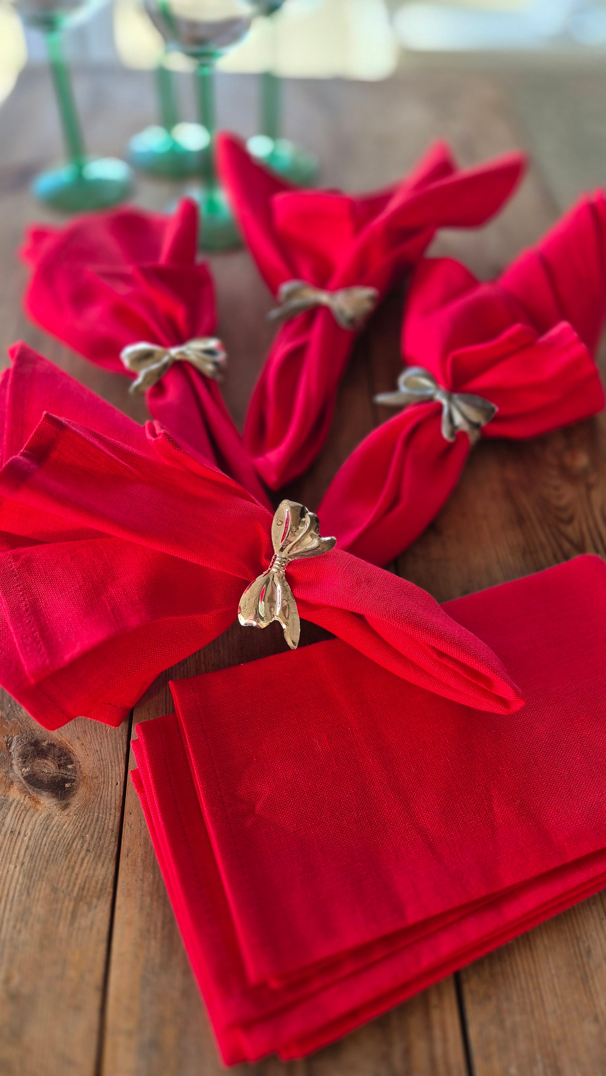 Fina röda tygservetter i linneaktigt tyg. Troligtvis är servetterna gjorda i någon linnemix. Perfekta till juldukningen. Fint skick. Säljs i set om 6 stycken.