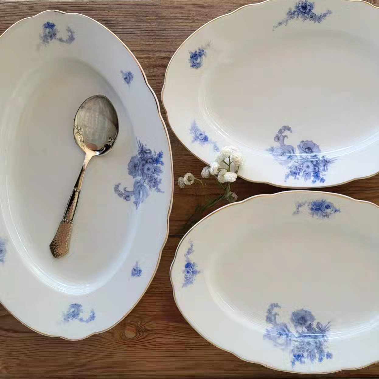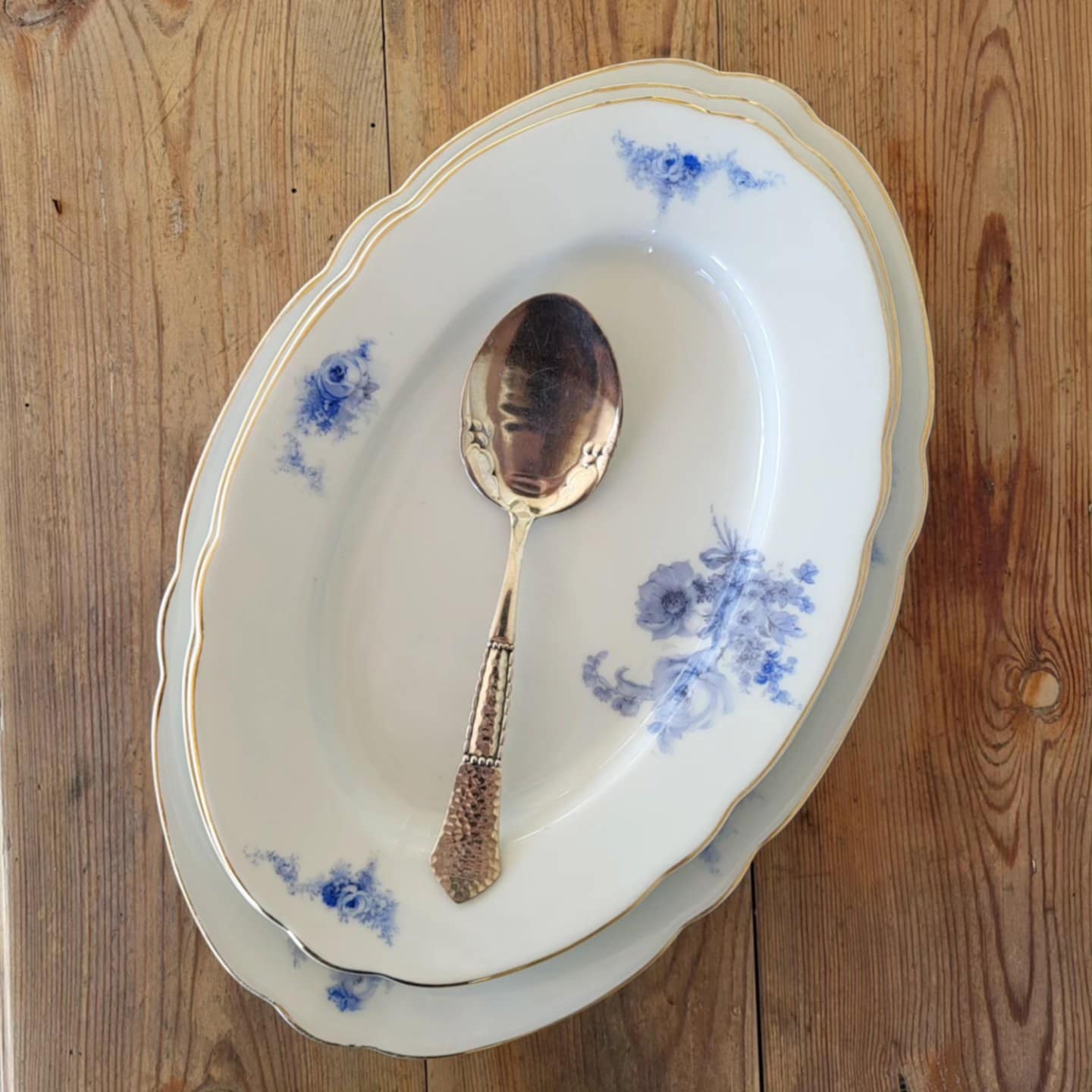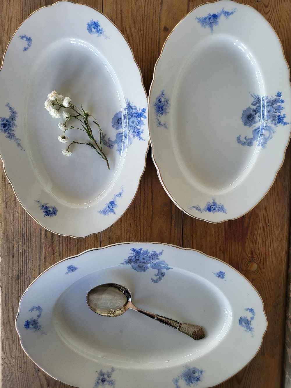 Ljuvliga blåblommiga uppläggningsfat i tre olika storlekar. Fint skick. Mindre spår av användning förekommer, till exempel kan kanterna runt om att ha tappat lite färg på sina ställen. Säljs som ett set med alla fyra fat.