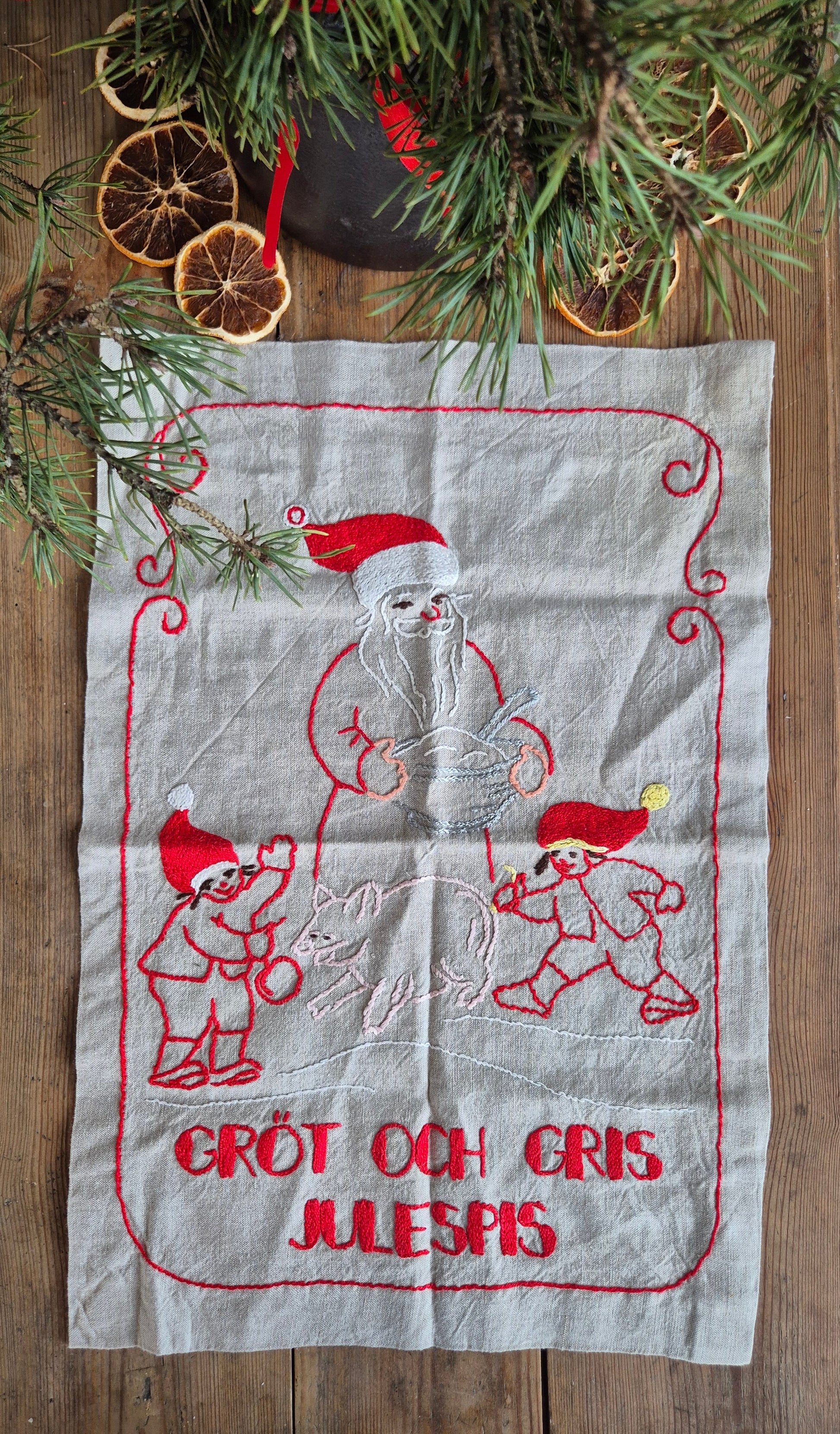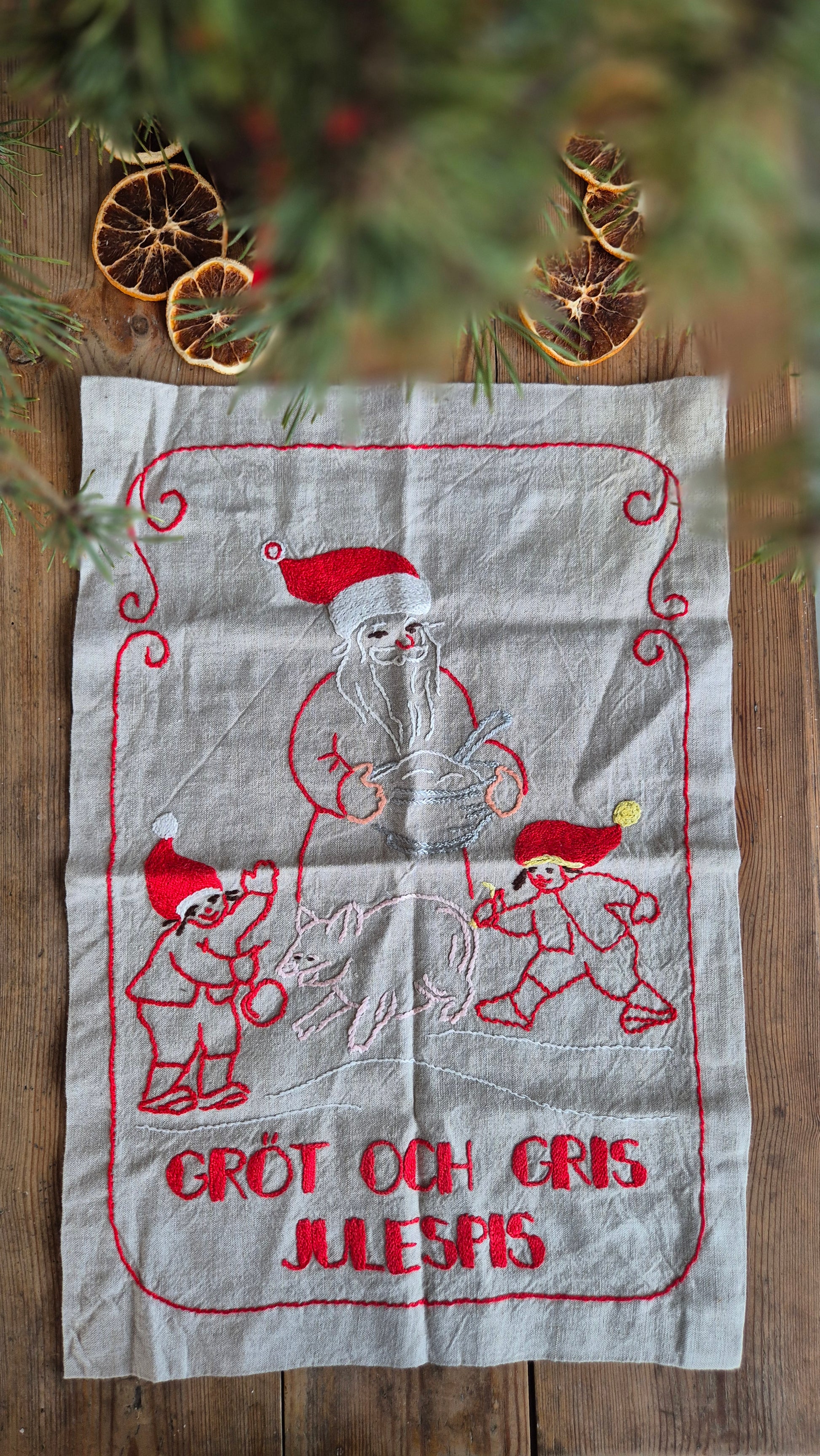 Verkligt fin väggbonad med texten gröt och gris julespris. Fint skick. Stav/ pinne att hänga på går att sätta dit enkelt då det är förberett för det. Även fin som en duk eller varför inte sätta i en tavelram.