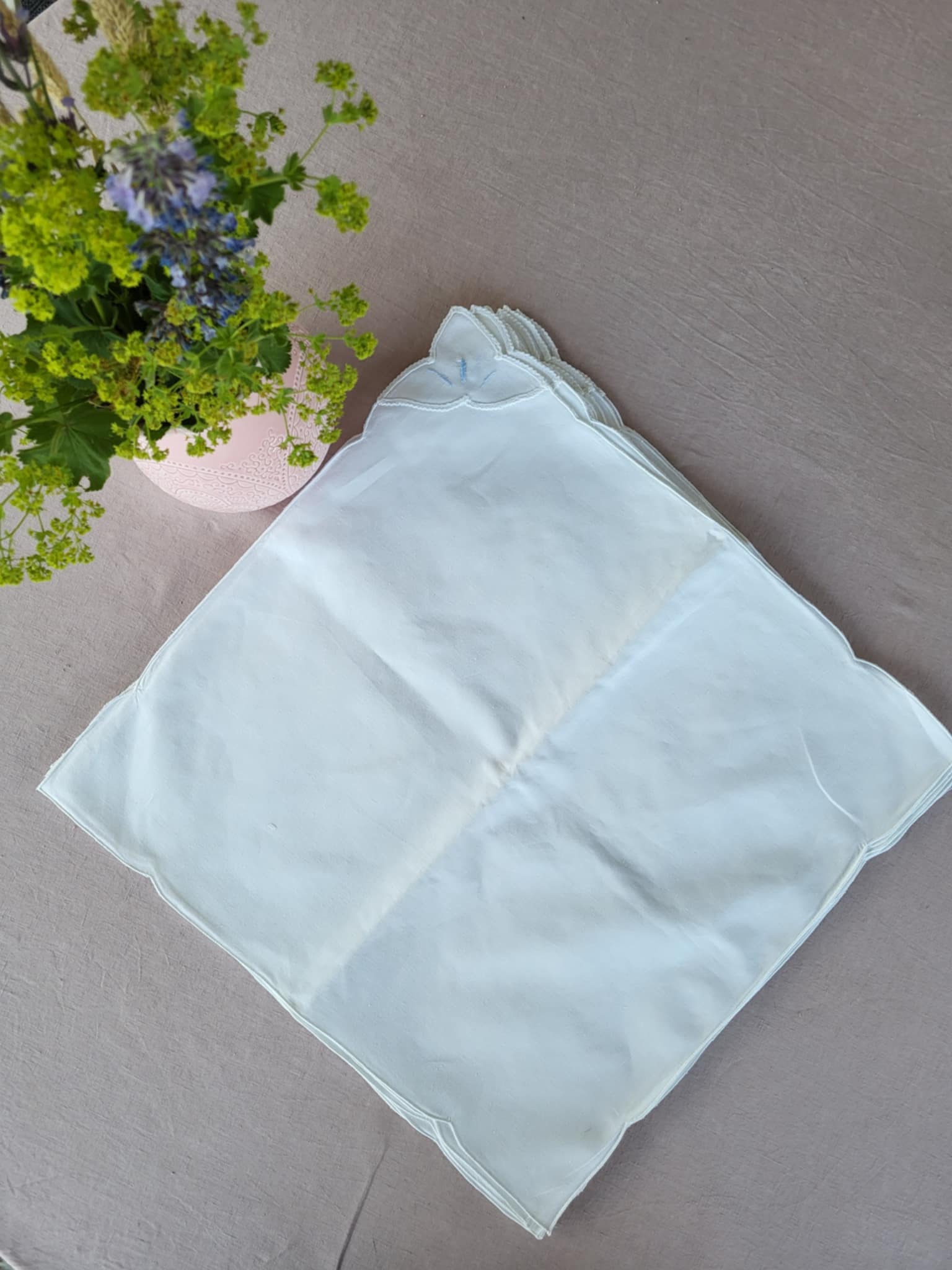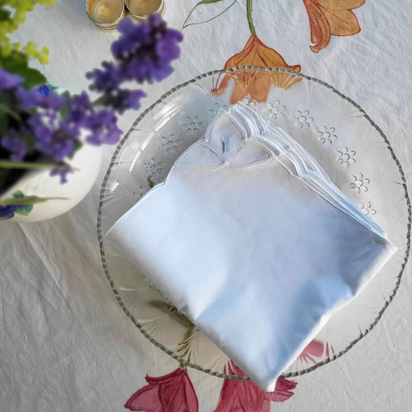 Ljuvliga vita tygservetter med broderat mönster och kanter. Säljs i set om 6 stycken. Välj hur många set du önskar.